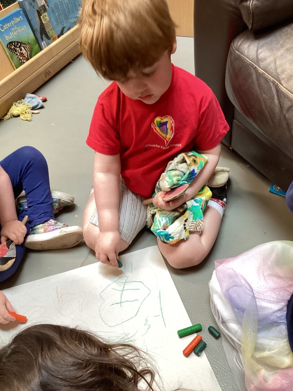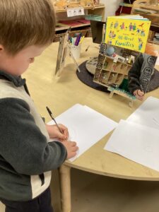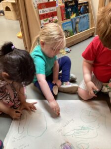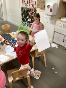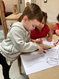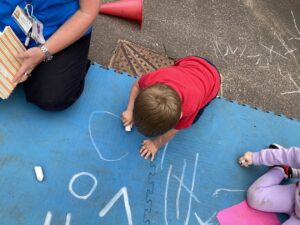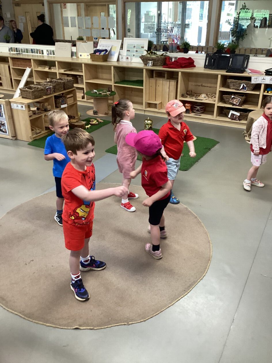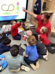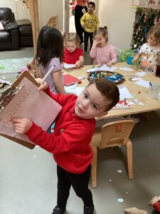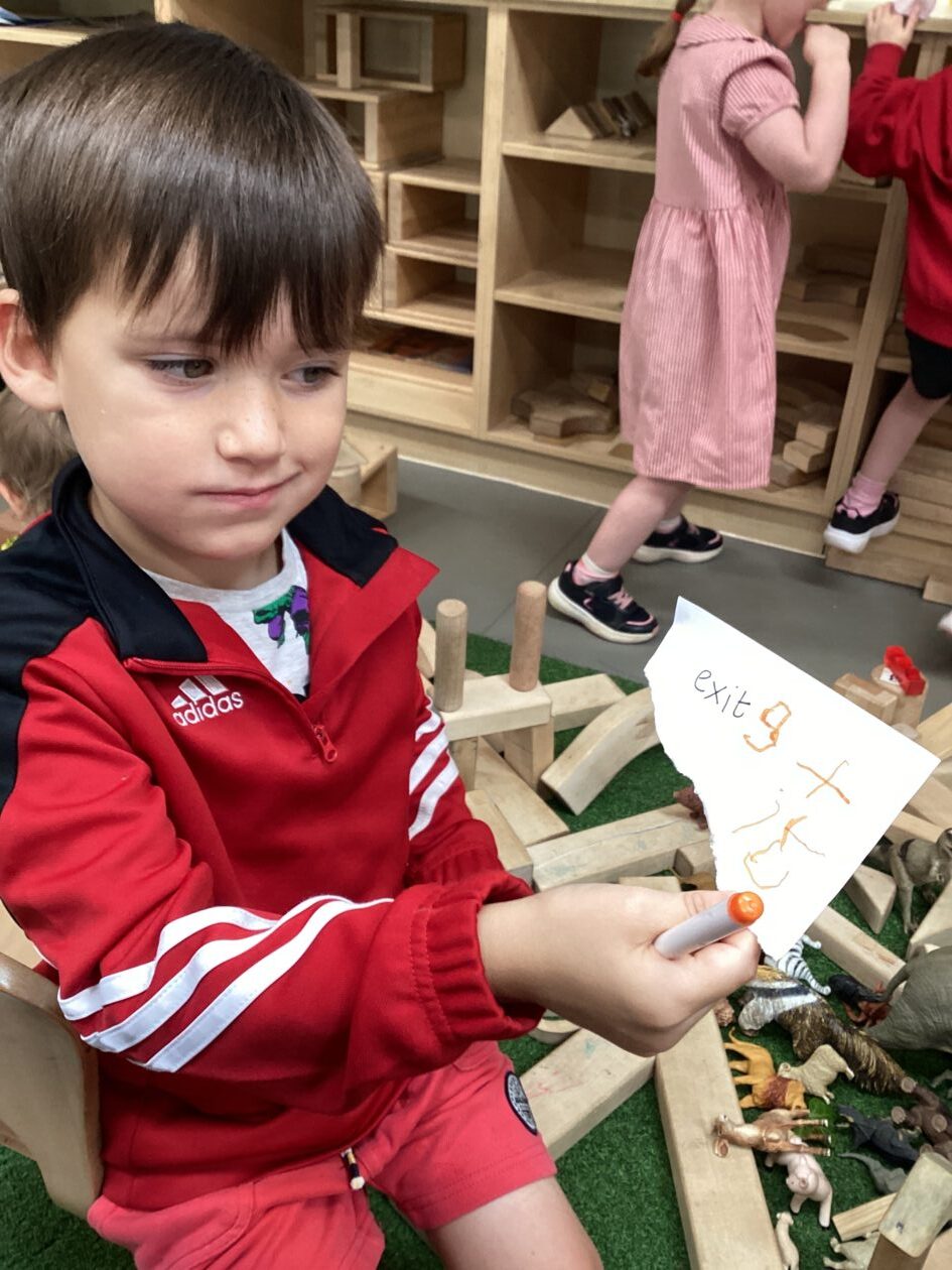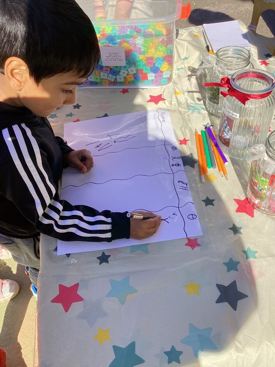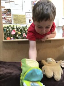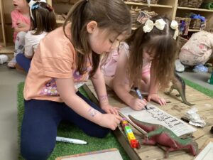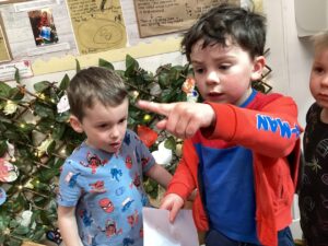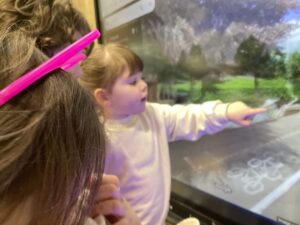 In the discovery area the children have been working on the whiteboard to direct us to places of interest to them  in the local area. The children’ s starting off point is the Family Centre from where they exit through the car park and using various forms of directional language have directed us around to the surrounding area such as, “ go left,” “turn this way.” The children have also spoken about landmarks they see travelling to nursery and when visiting their relatives.