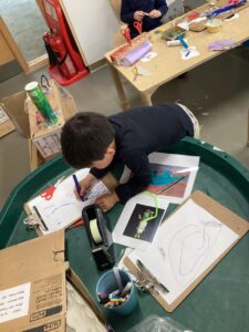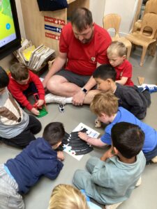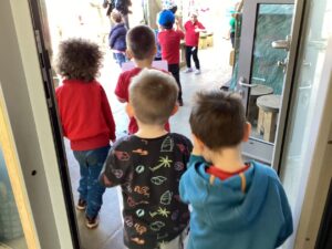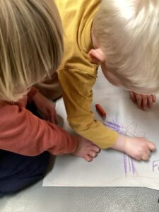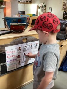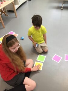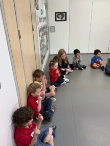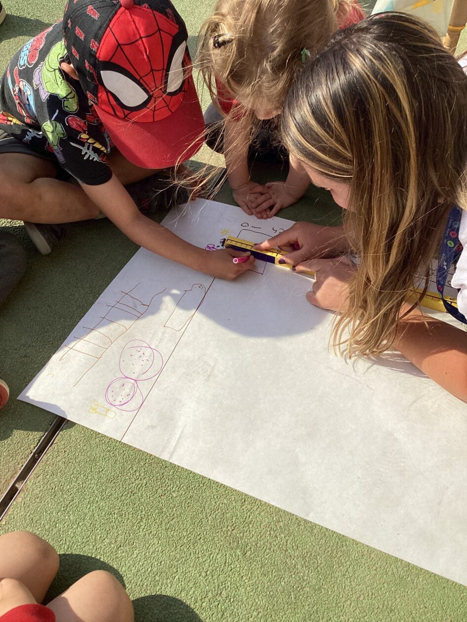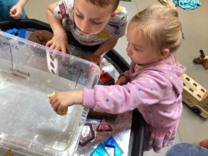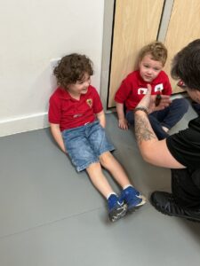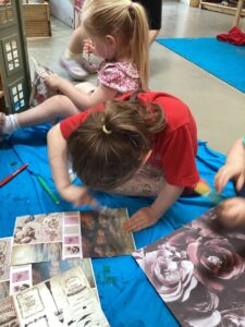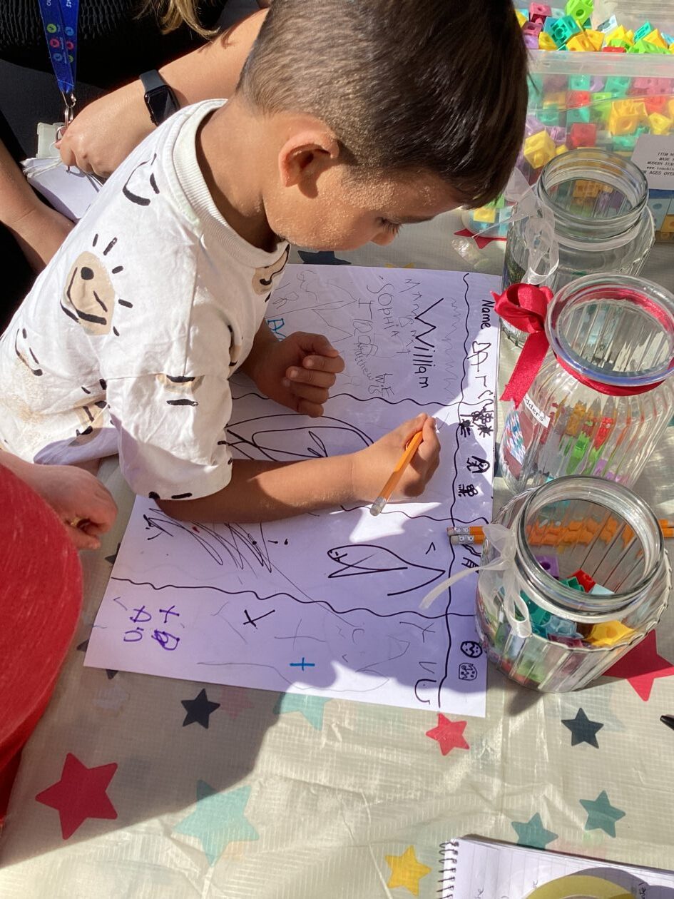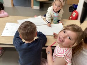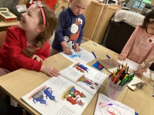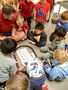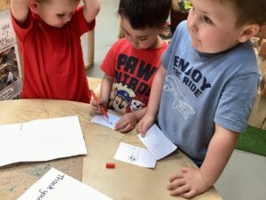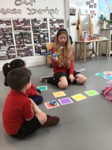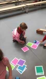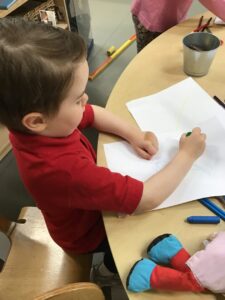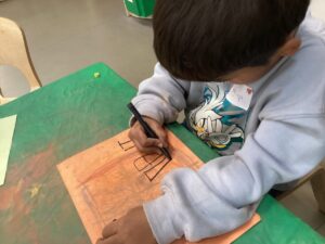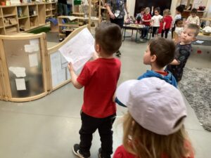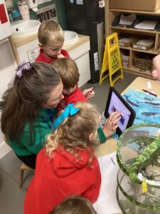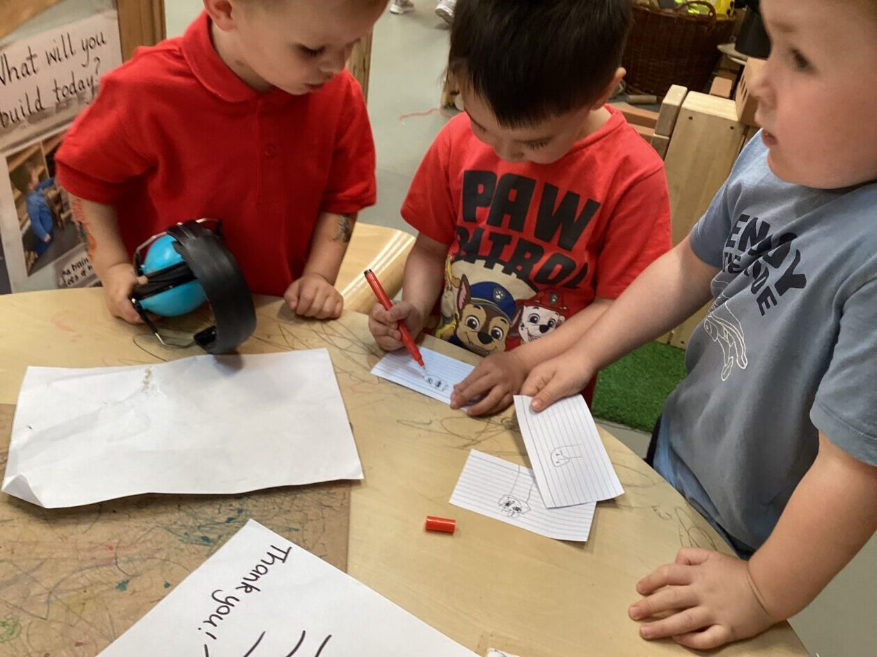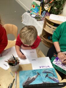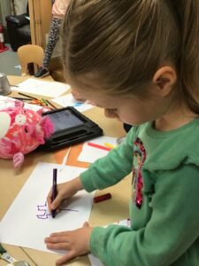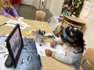 In the discovery area the children have been working on the whiteboard to direct us to places of interest to them  in the local area. The children’ s starting off point is the Family Centre from where they exit through the car park and using various forms of directional language have directed us around to the surrounding area such as, “ go left,” “turn this way.” The children have also spoken about landmarks they see travelling to nursery and when visiting their relatives.