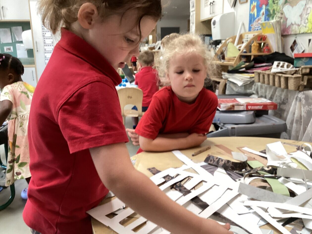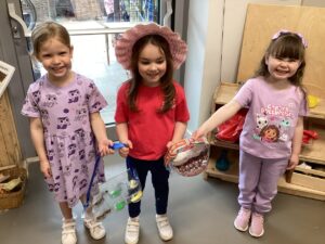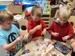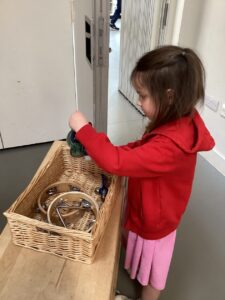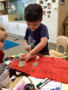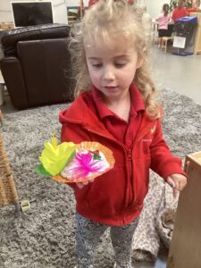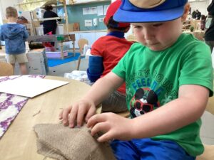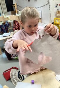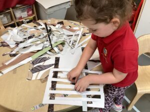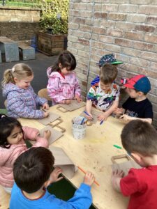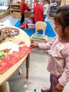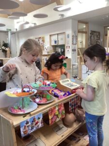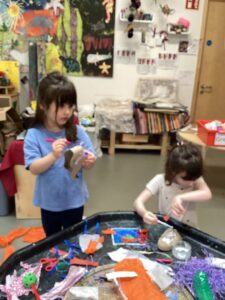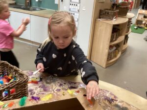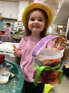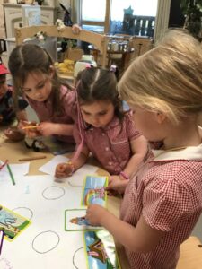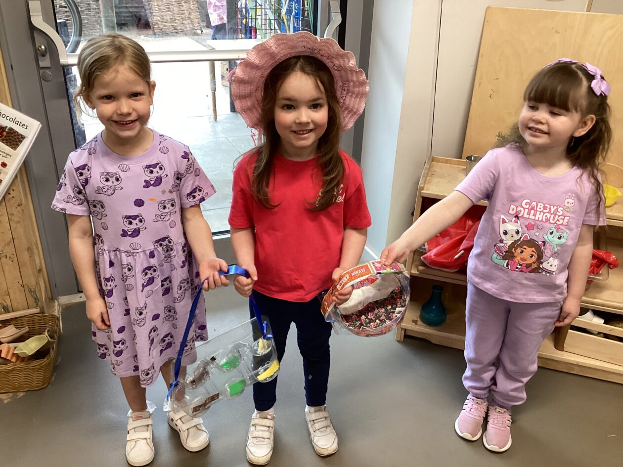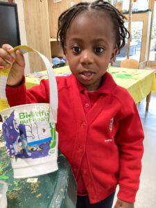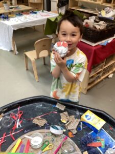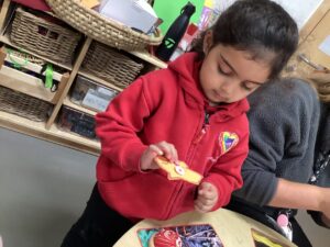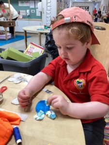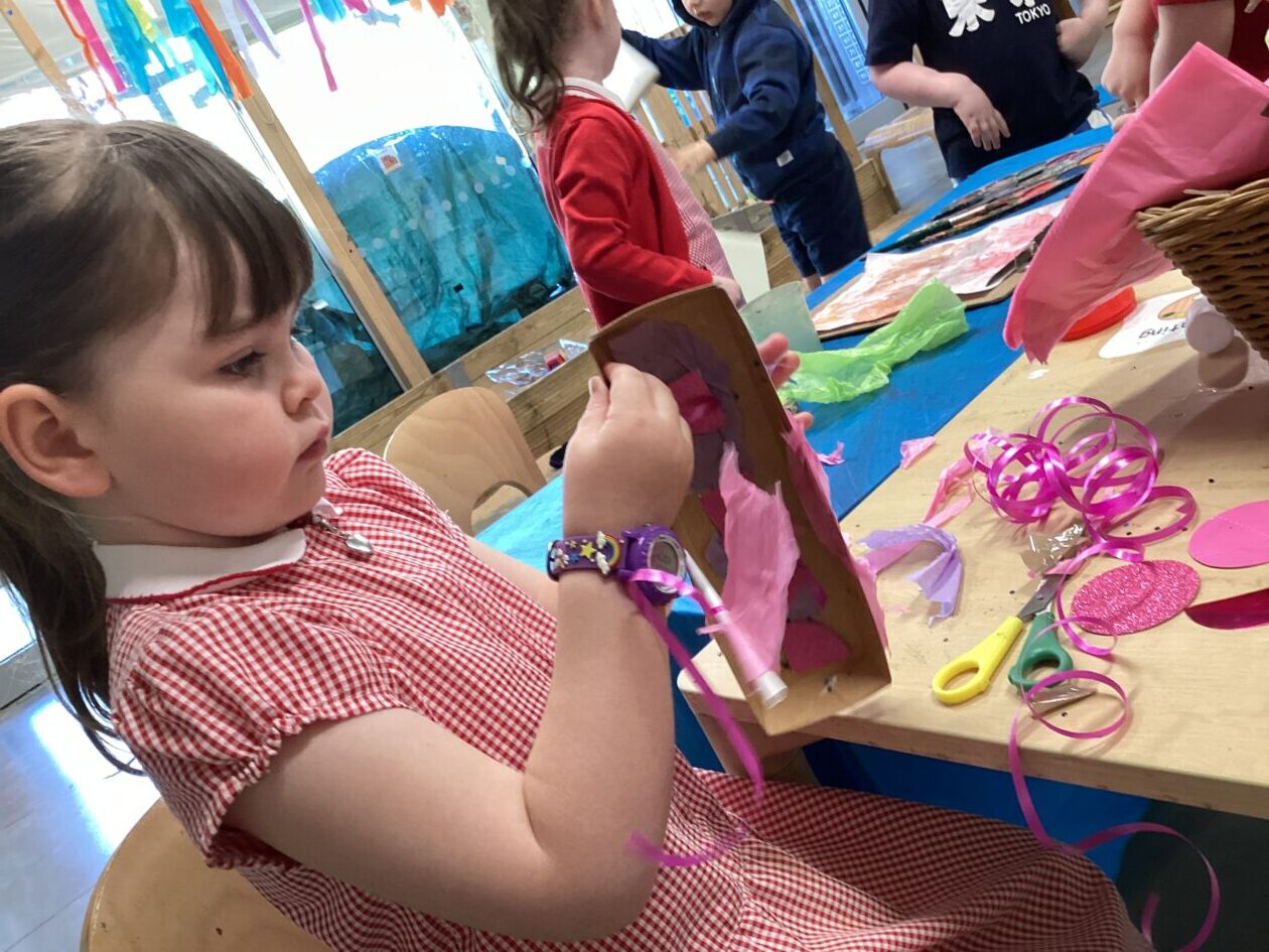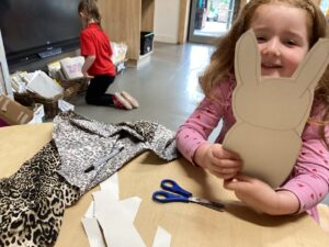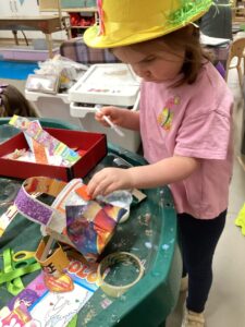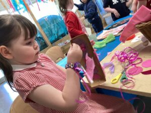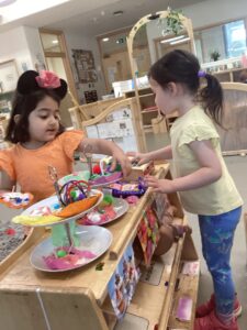 In the art area the children have been using different materials to create Easter baskets. They have been developing their fine motor skills by cutting and and sticking the materials together and sharing their ideas.