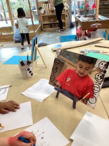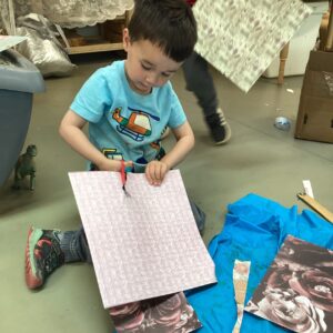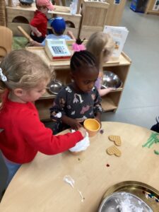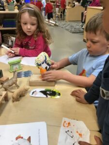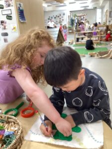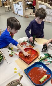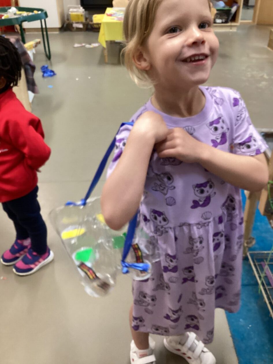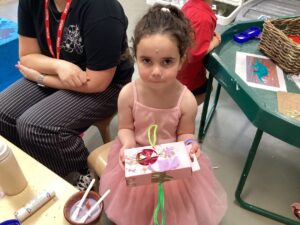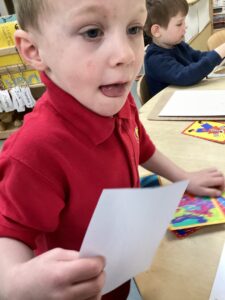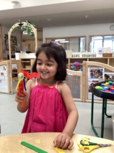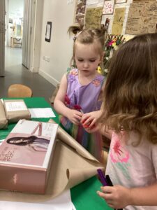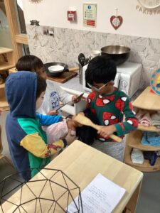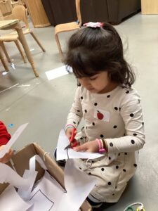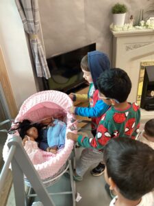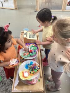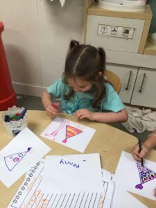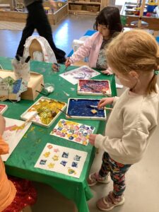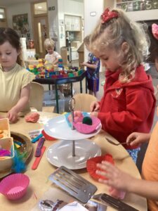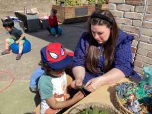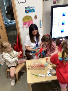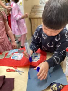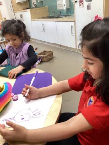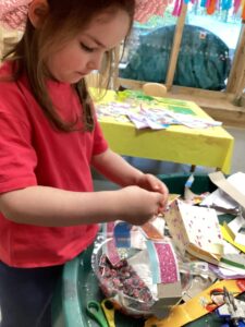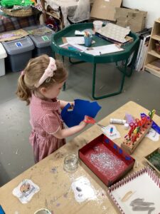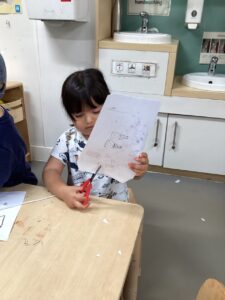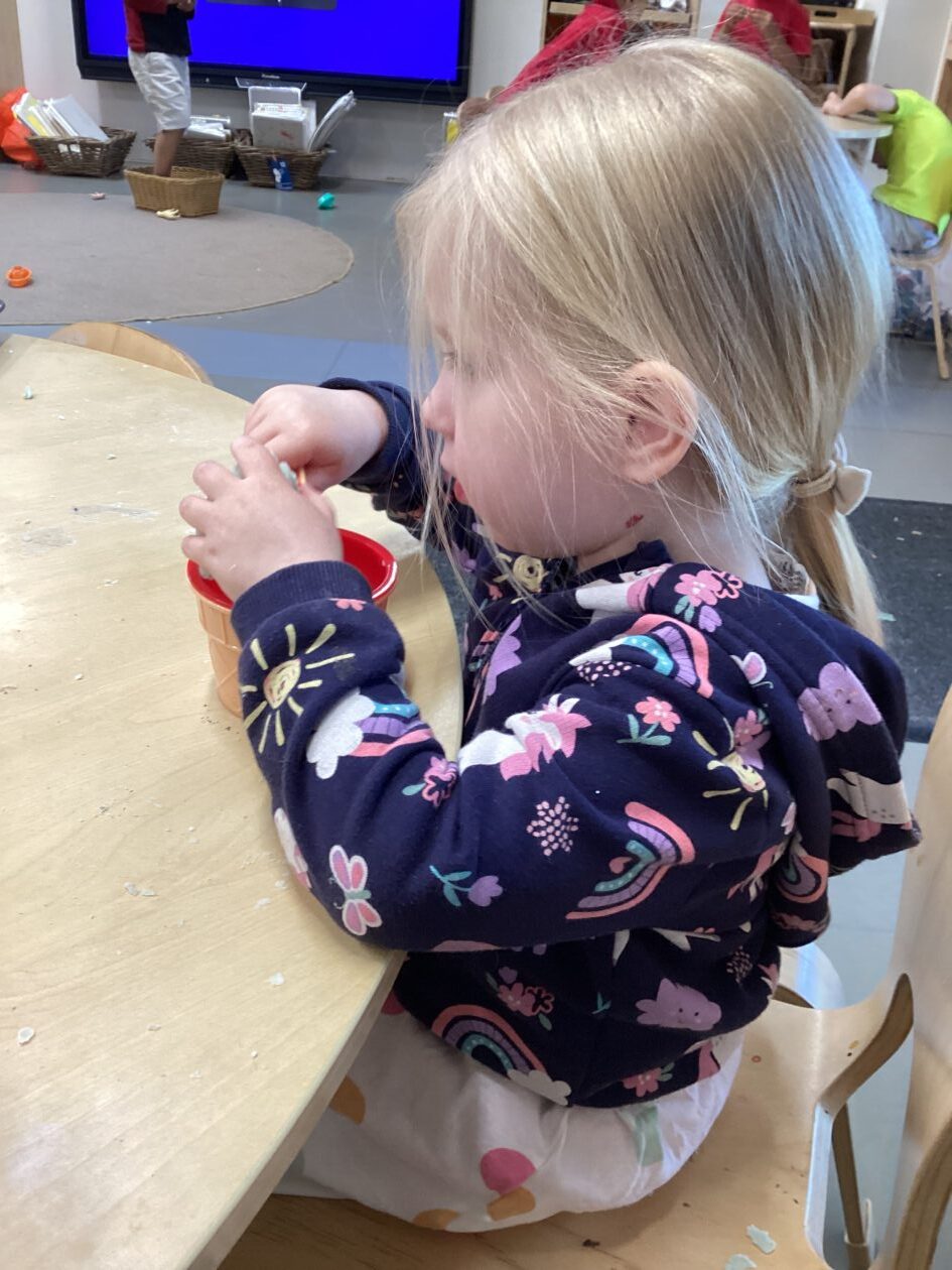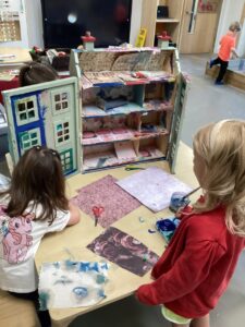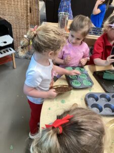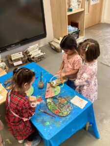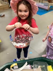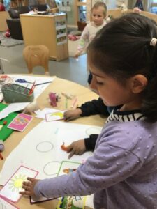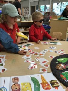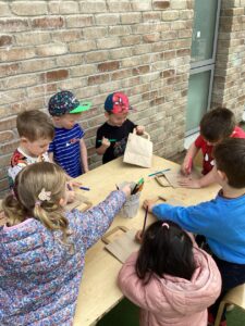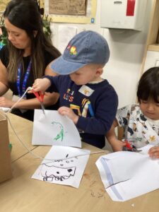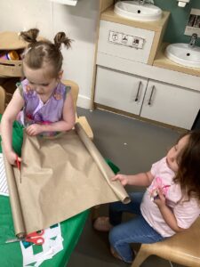 In the art area the children have been using different materials to create Easter baskets. They have been developing their fine motor skills by cutting and and sticking the materials together and sharing their ideas.