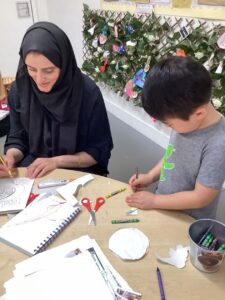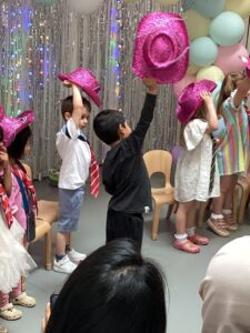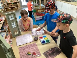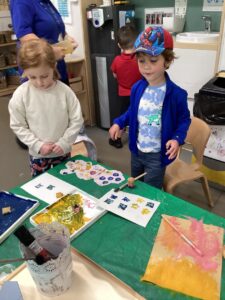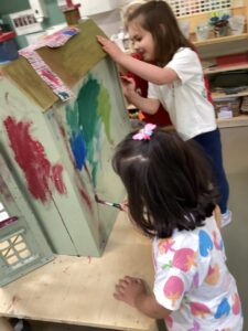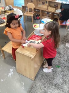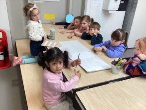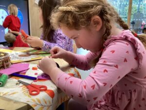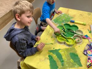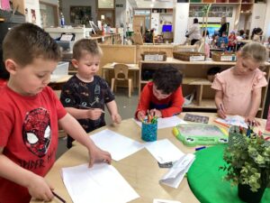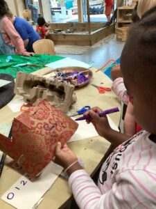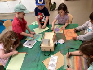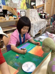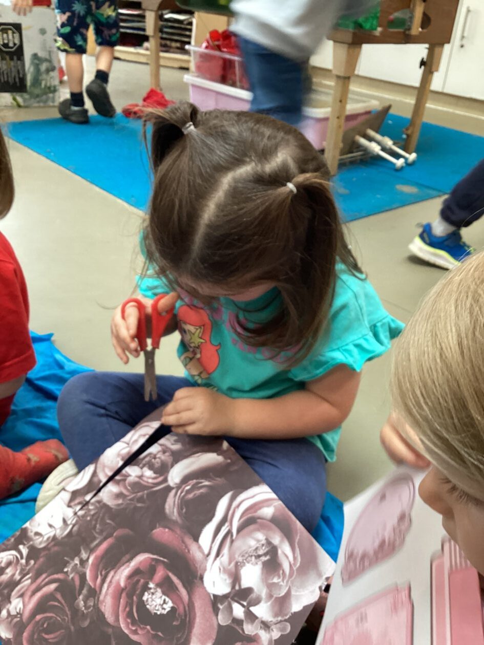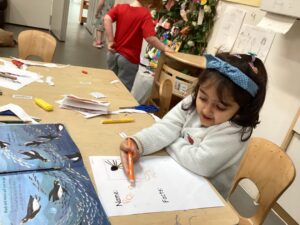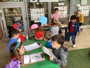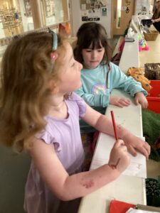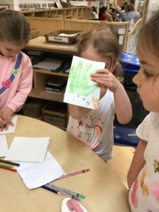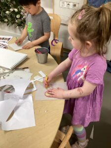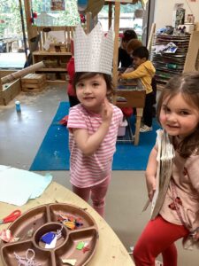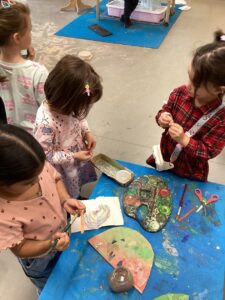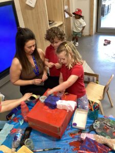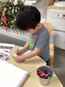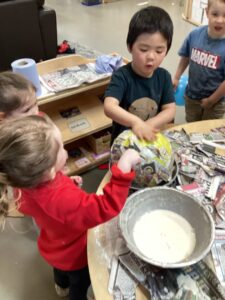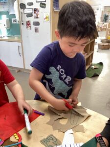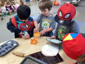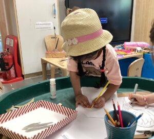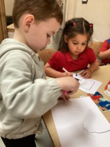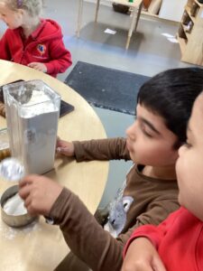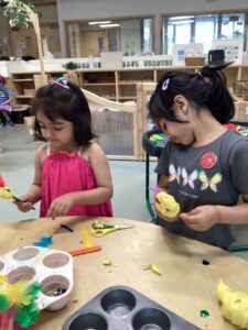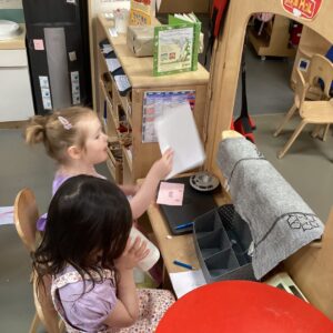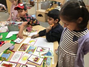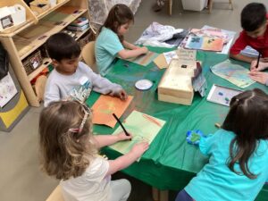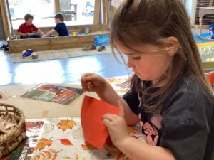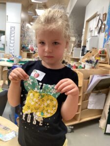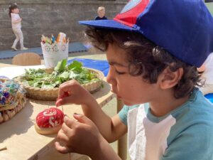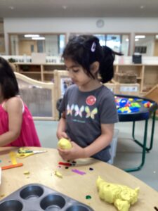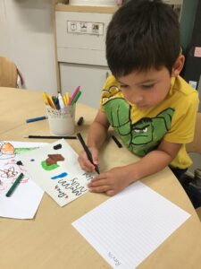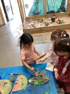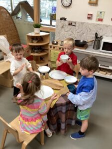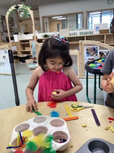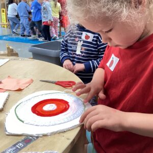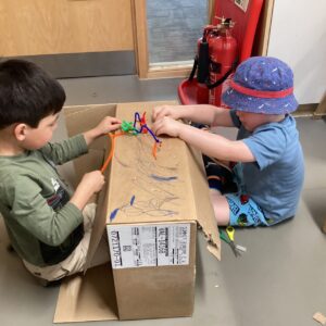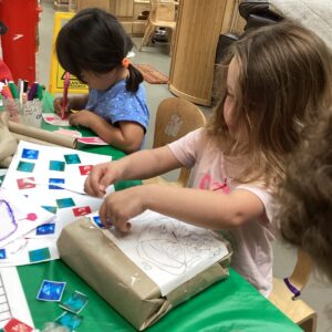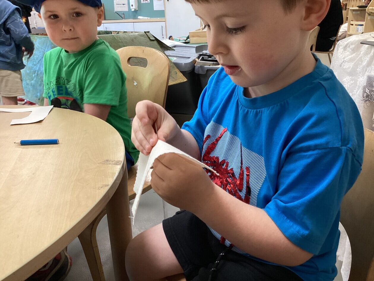 In the art area the children have been using different materials to create Easter baskets. They have been developing their fine motor skills by cutting and and sticking the materials together and sharing their ideas.