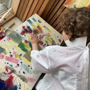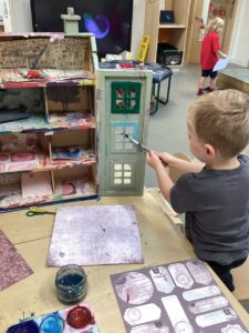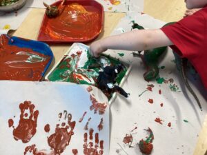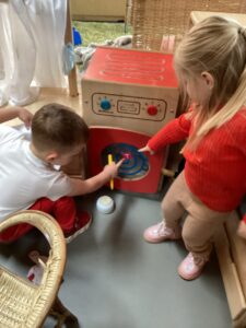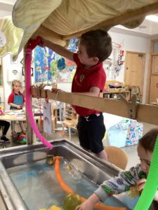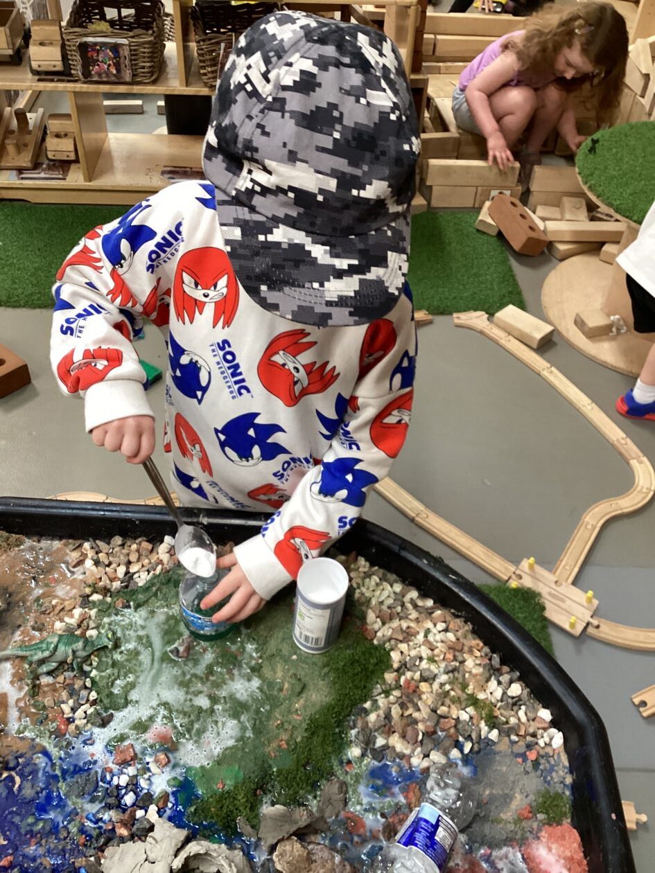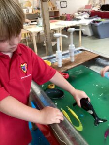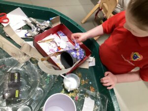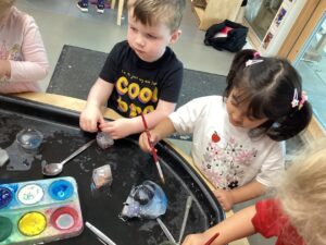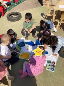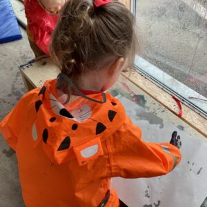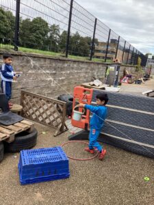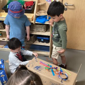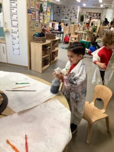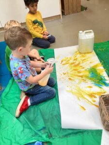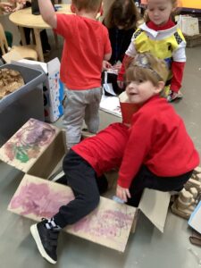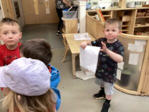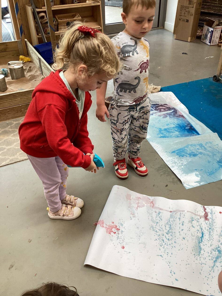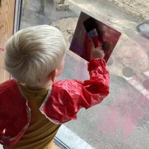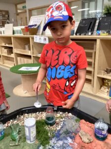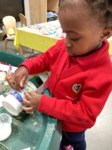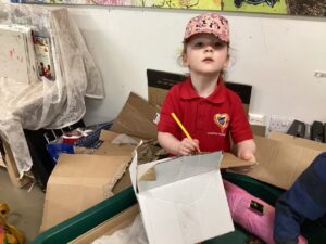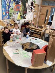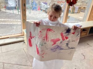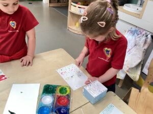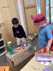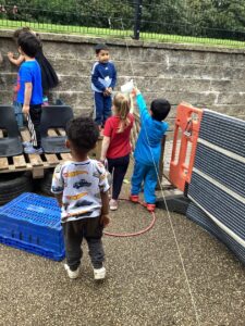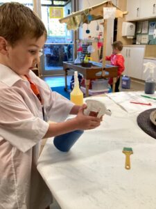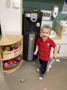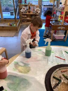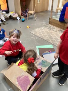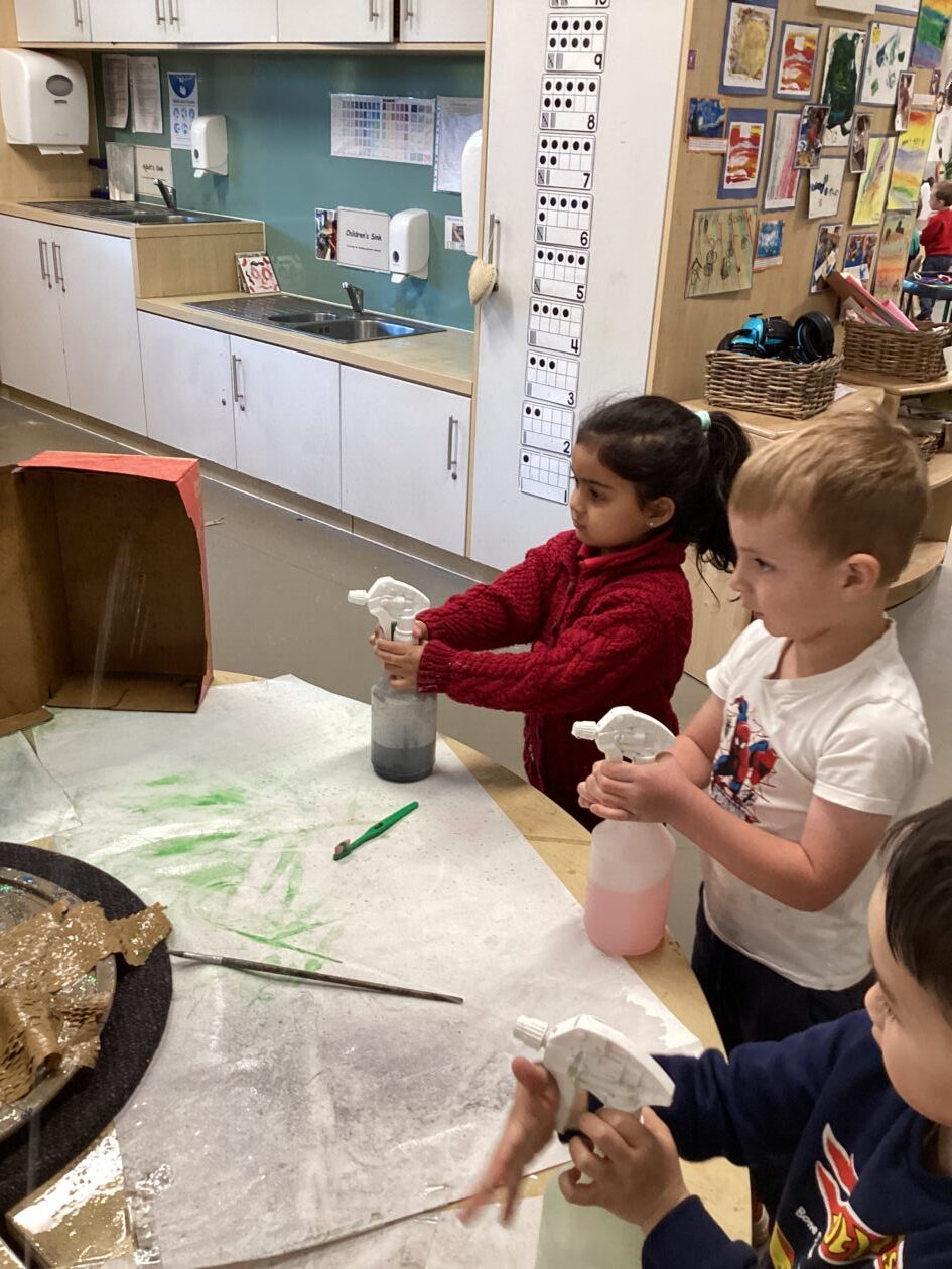 In our creative area this week the children have been spray water painting with spray bottles containing diluted paint. This is a fun, messy and engaging art activity which they sprayed on to boxes, almost as a target practice! This activity promotes fine motor skill development, hand-eye coordination, creativity, and colour exploration and as you can imagine the children thoroughly enjoyed it!