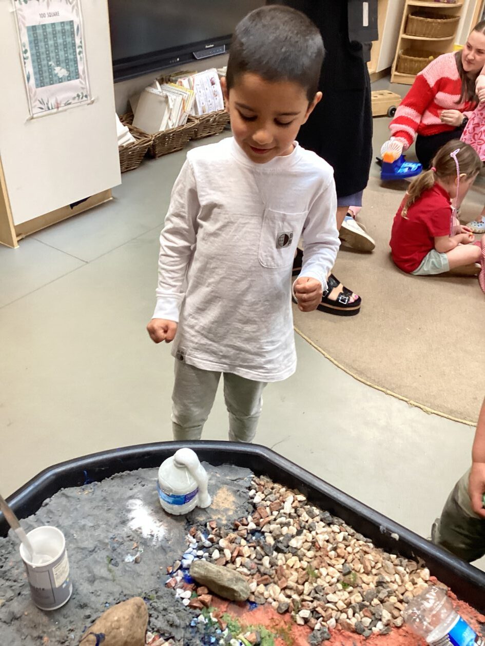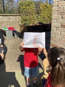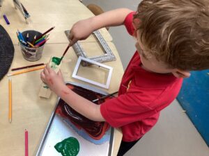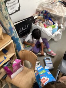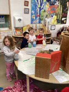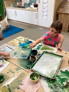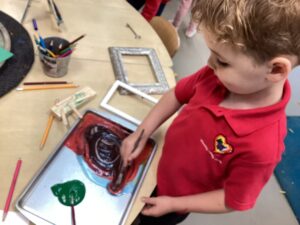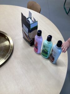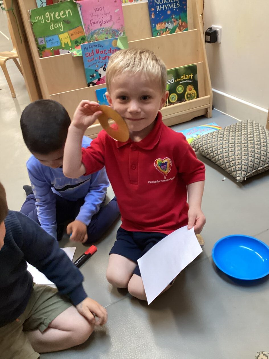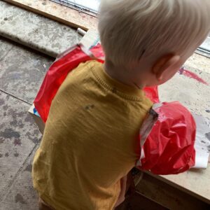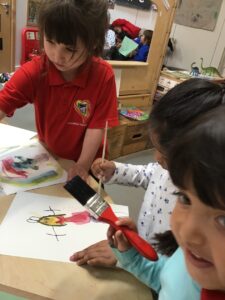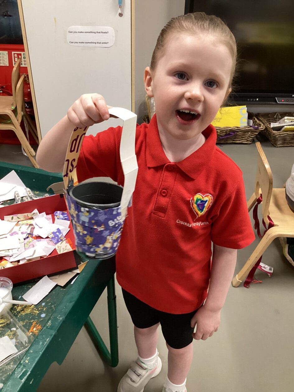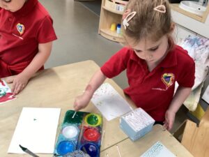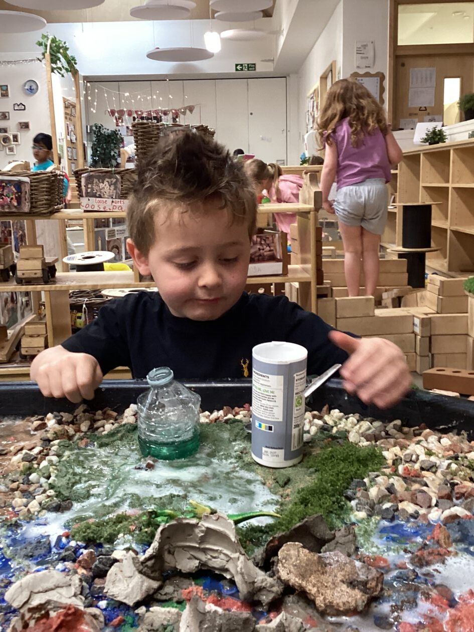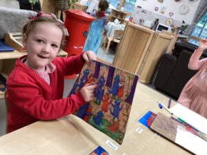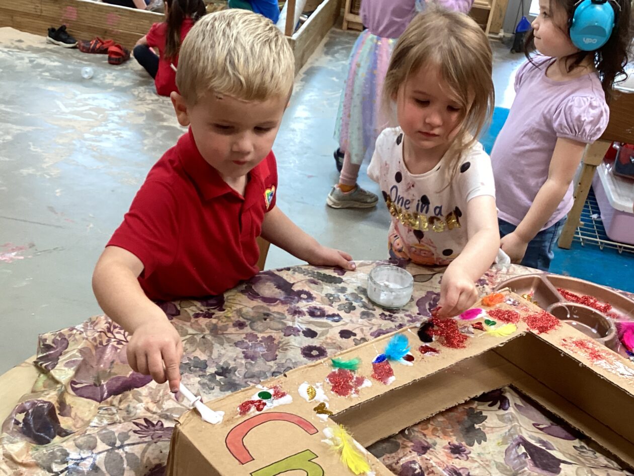 In our creative area this week the children have been spray water painting with spray bottles containing diluted paint. This is a fun, messy and engaging art activity which they sprayed on to boxes, almost as a target practice! This activity promotes fine motor skill development, hand-eye coordination, creativity, and colour exploration and as you can imagine the children thoroughly enjoyed it!