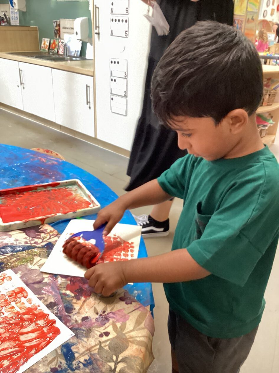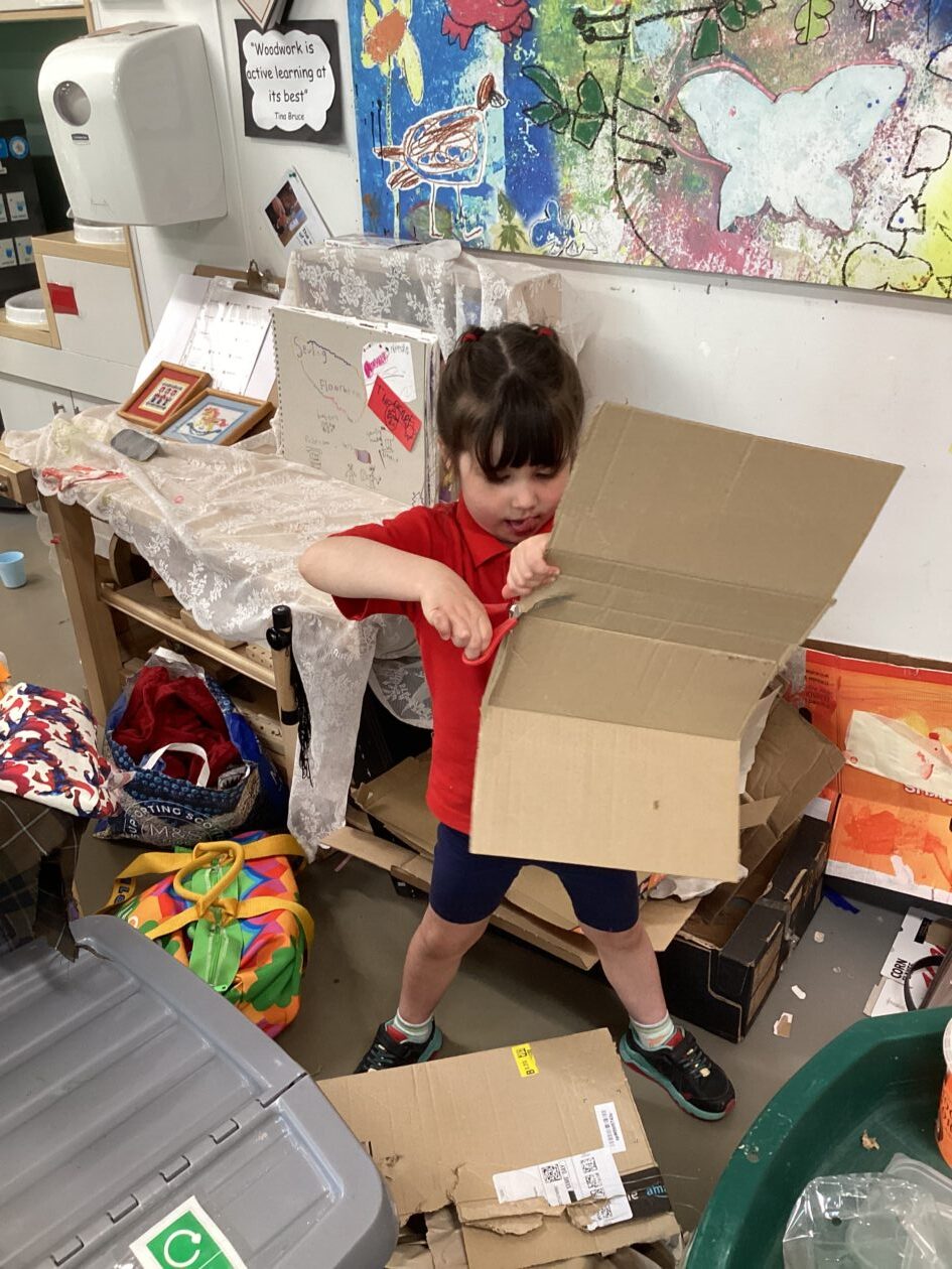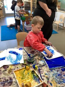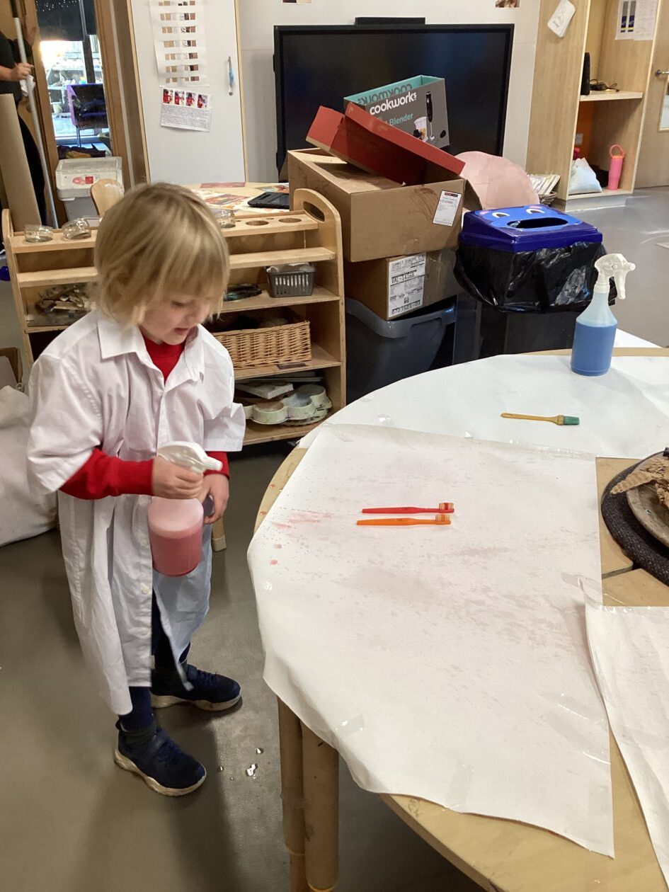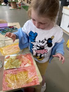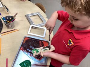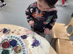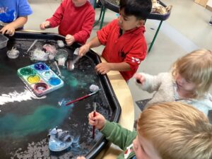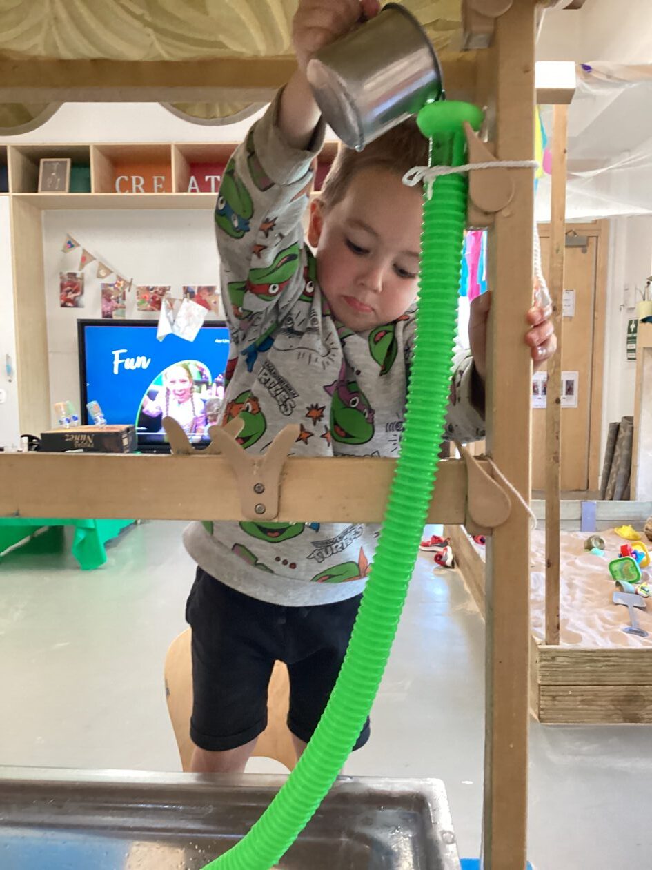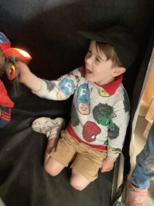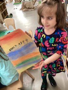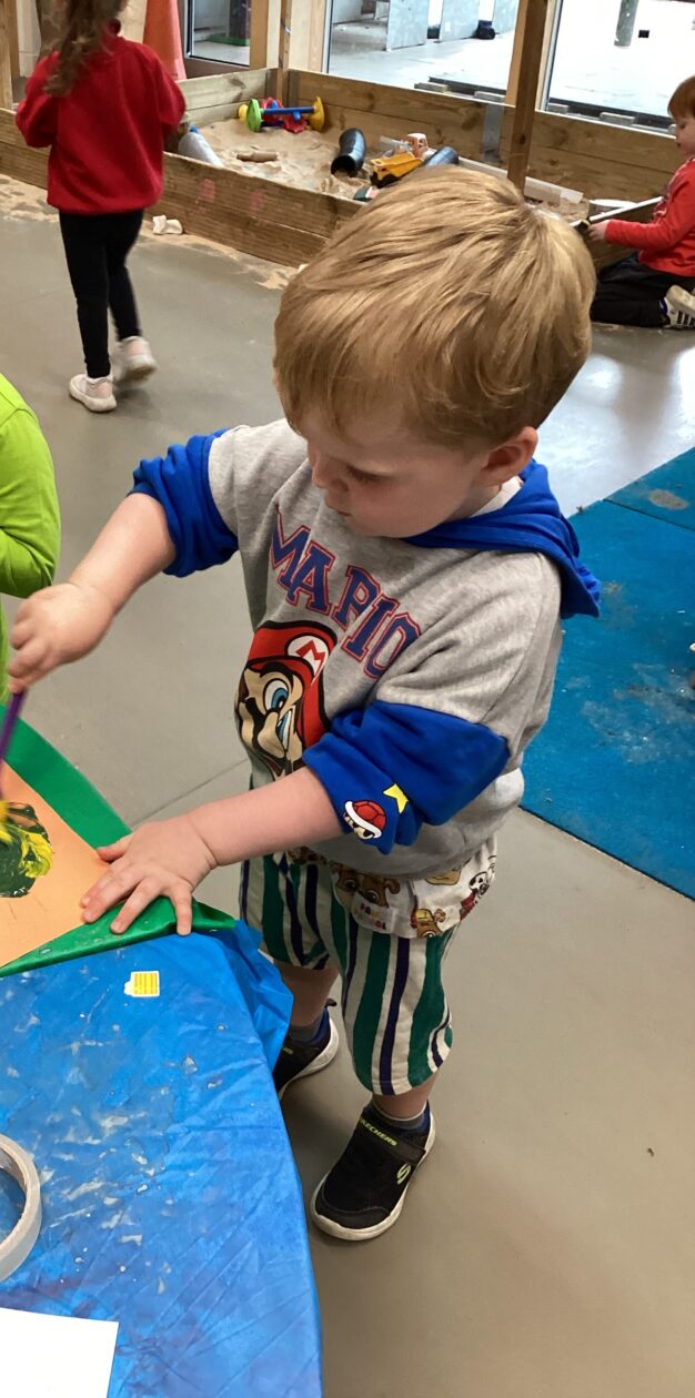 In our creative area this week the children have been spray water painting with spray bottles containing diluted paint. This is a fun, messy and engaging art activity which they sprayed on to boxes, almost as a target practice! This activity promotes fine motor skill development, hand-eye coordination, creativity, and colour exploration and as you can imagine the children thoroughly enjoyed it!
