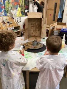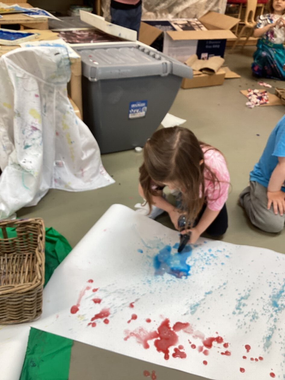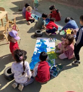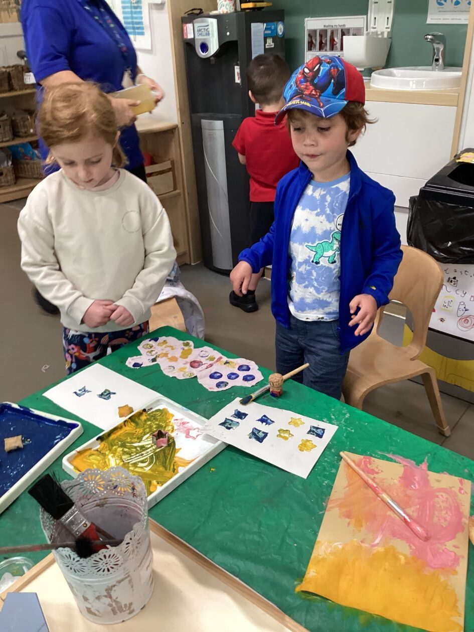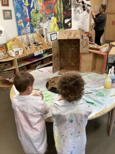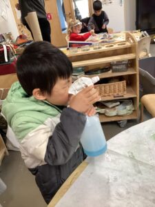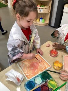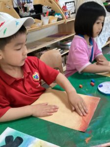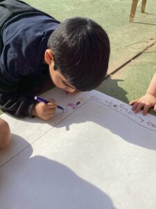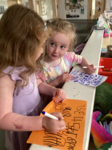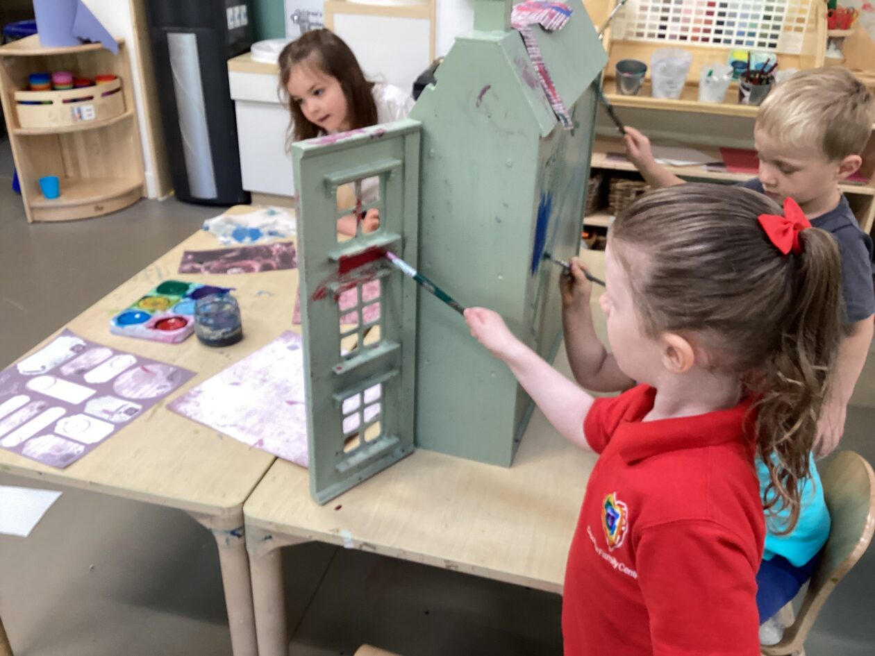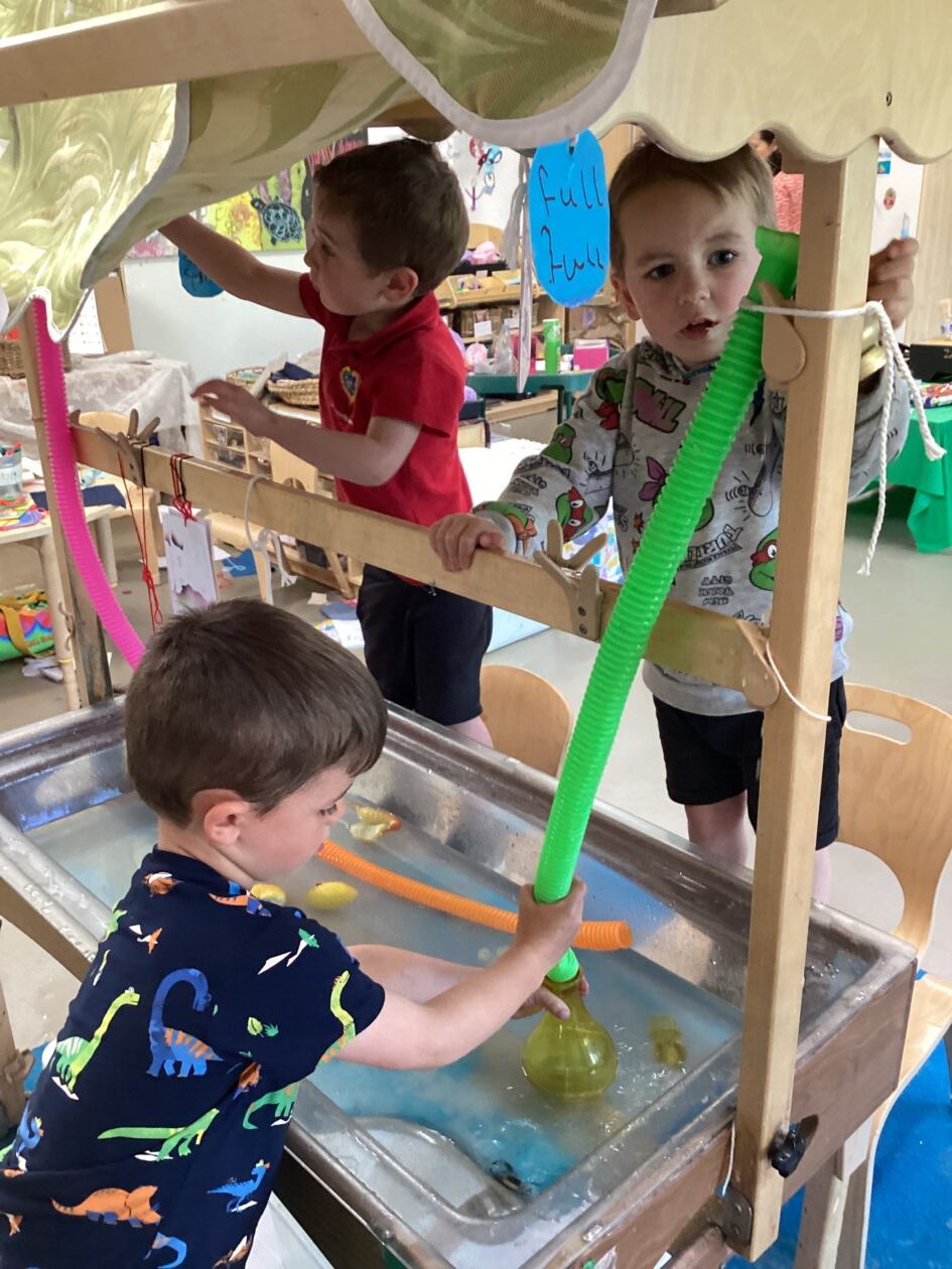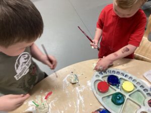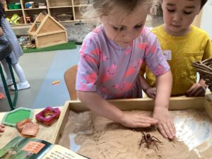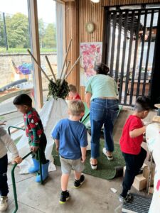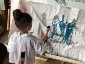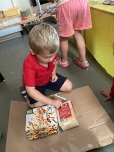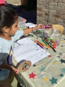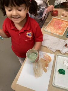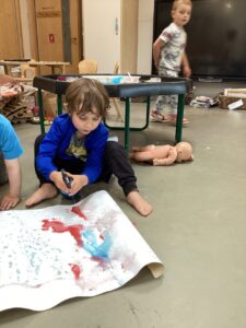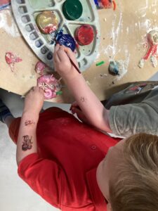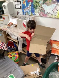 In our creative area this week the children have been spray water painting with spray bottles containing diluted paint. This is a fun, messy and engaging art activity which they sprayed on to boxes, almost as a target practice! This activity promotes fine motor skill development, hand-eye coordination, creativity, and colour exploration and as you can imagine the children thoroughly enjoyed it!