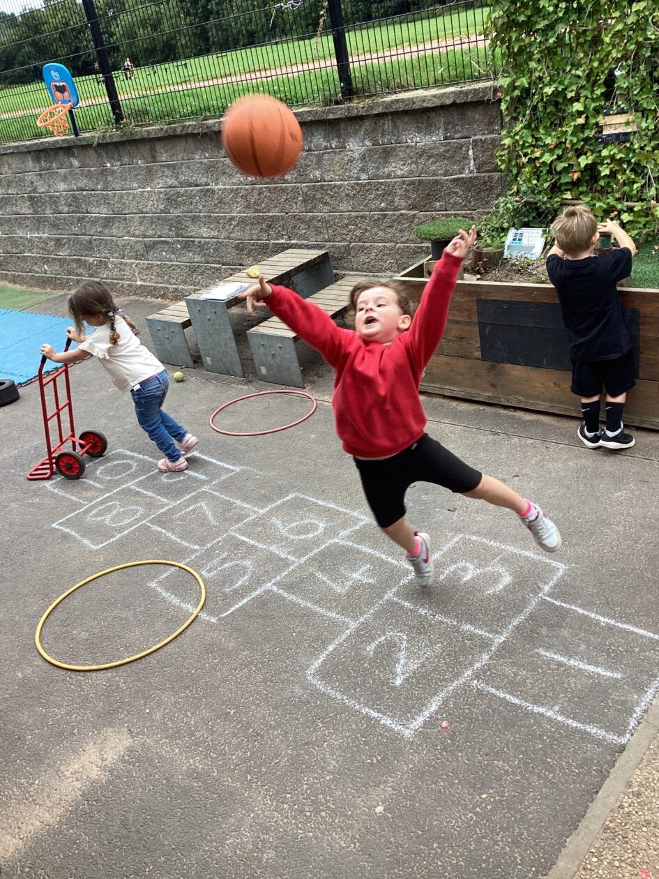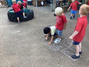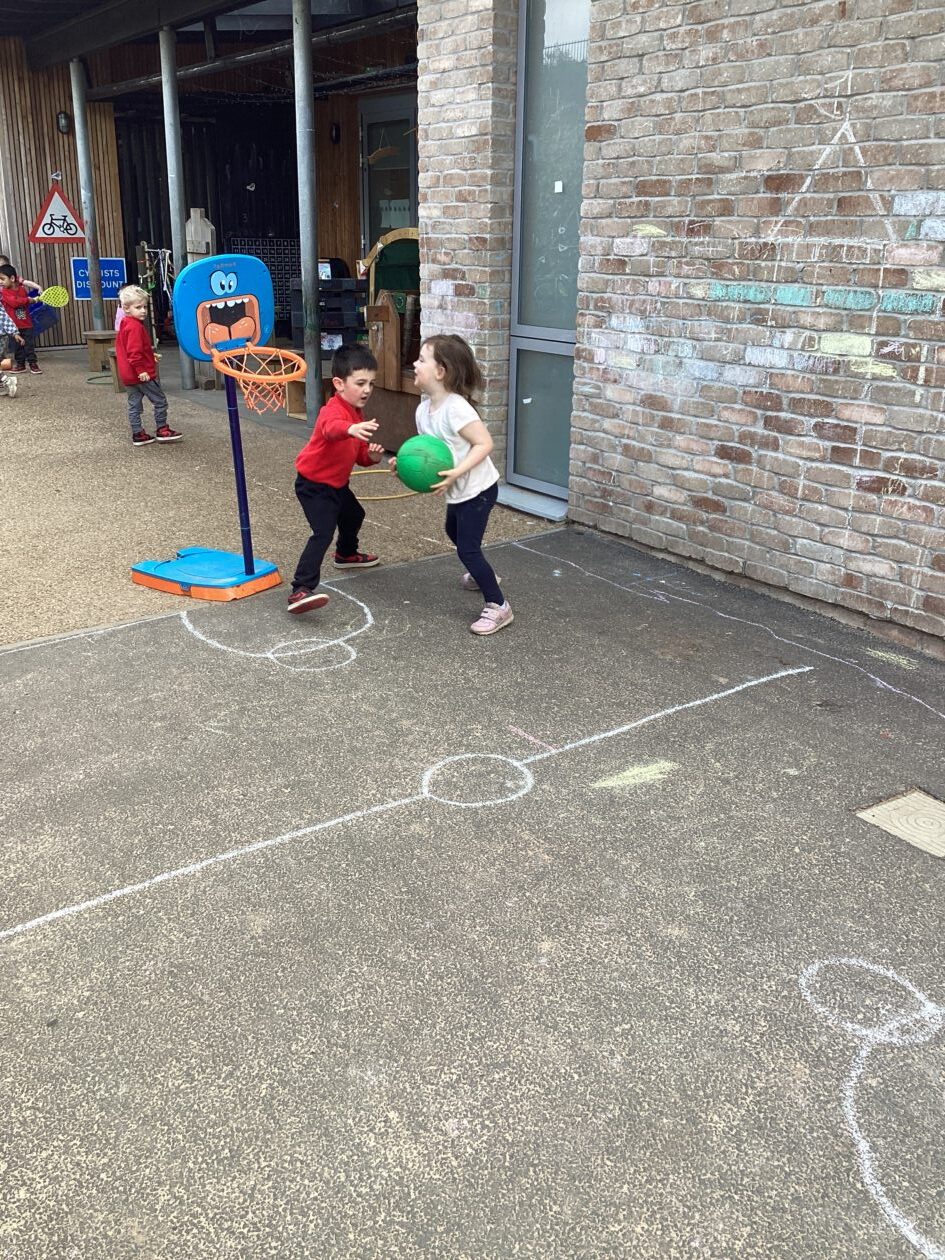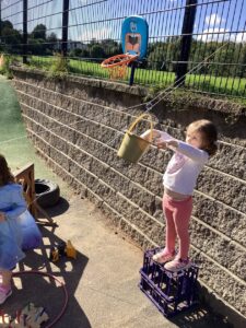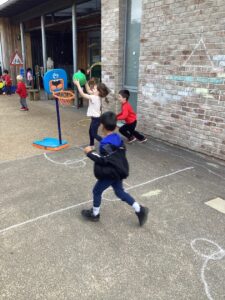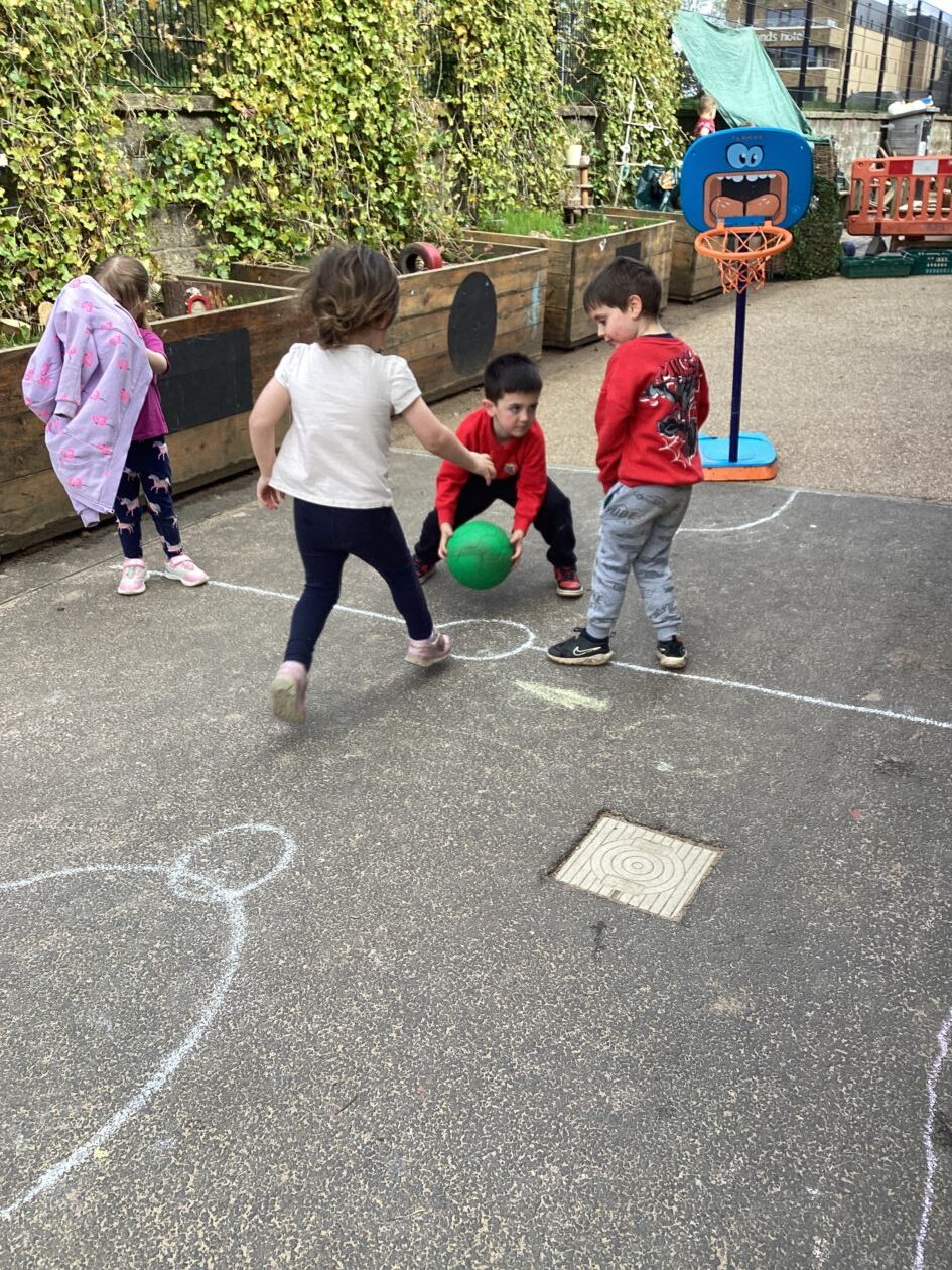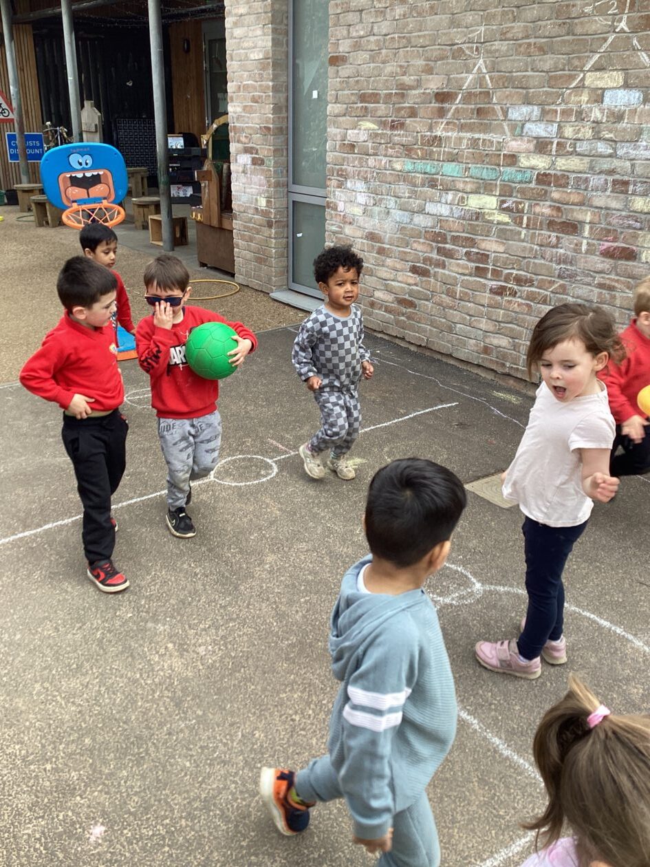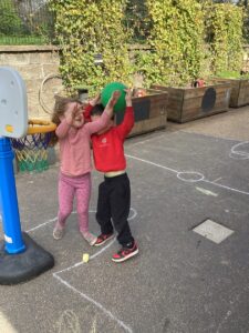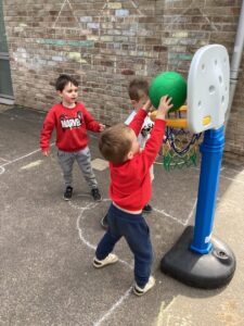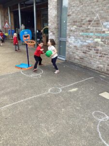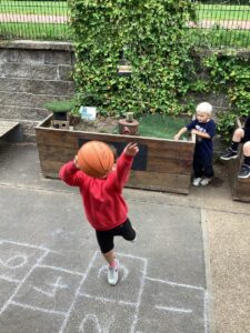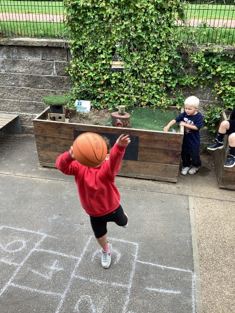 This week outdoors the children have been playing lots of different games. We have practised our throwing, catching and hitting a ball with a bat during ball games. One of our favourites has been basketball where the children formed their own teams and competed against each other. We have also enjoyed playing giant snakes and ladders out in the sunshine. We are learning to subitise and count, and also take turns with each other as we learn the rules of the game.