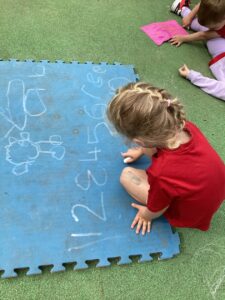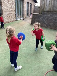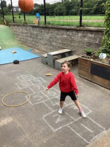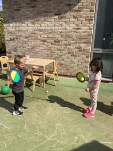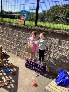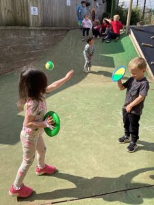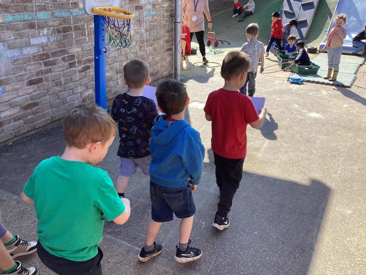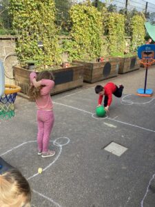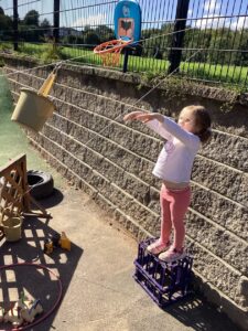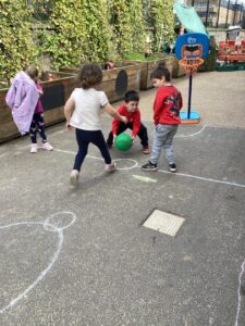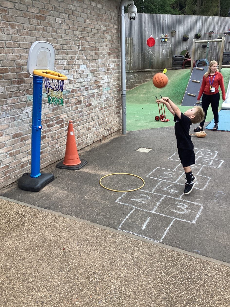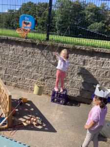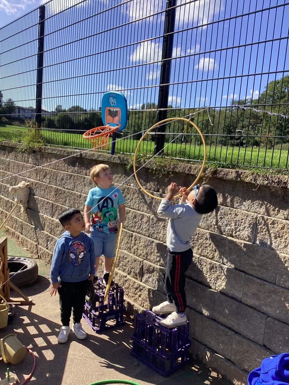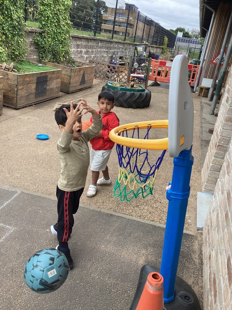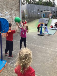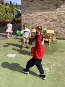 This week outdoors the children have been playing lots of different games. We have practised our throwing, catching and hitting a ball with a bat during ball games. One of our favourites has been basketball where the children formed their own teams and competed against each other. We have also enjoyed playing giant snakes and ladders out in the sunshine. We are learning to subitise and count, and also take turns with each other as we learn the rules of the game.