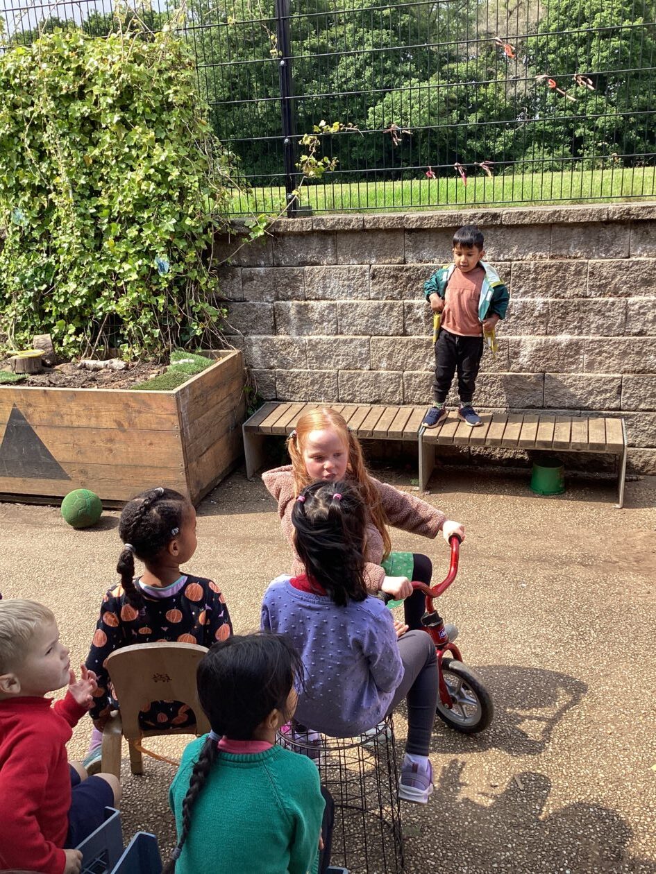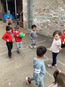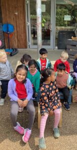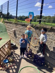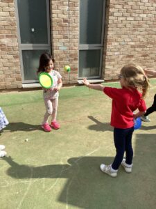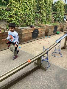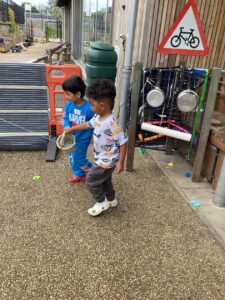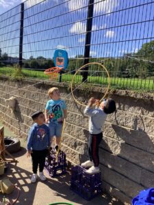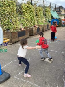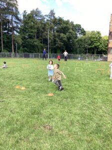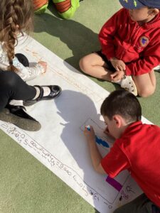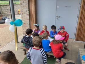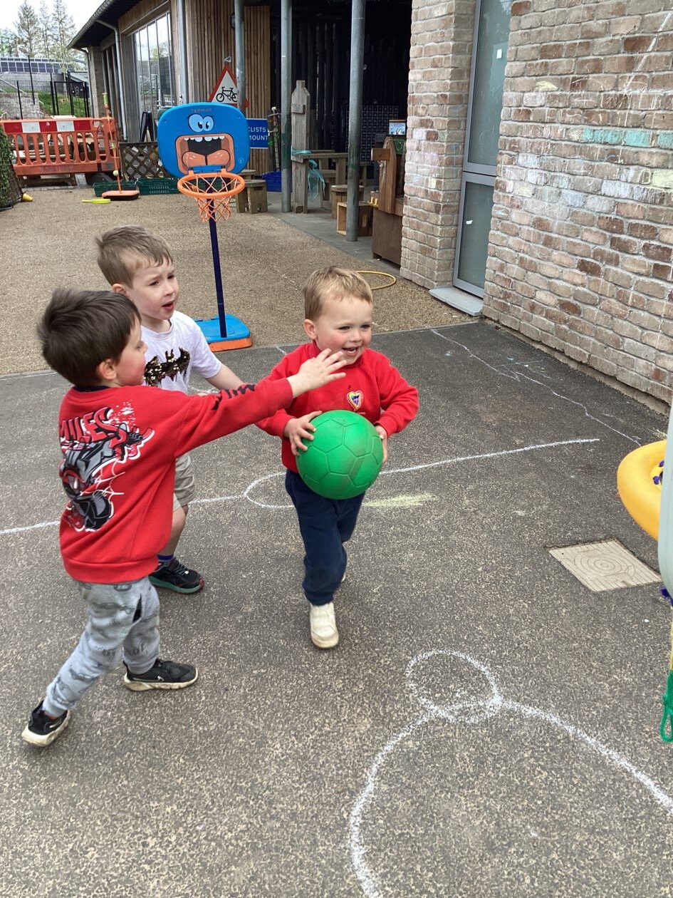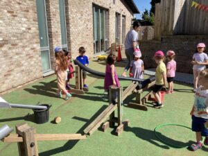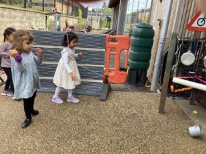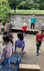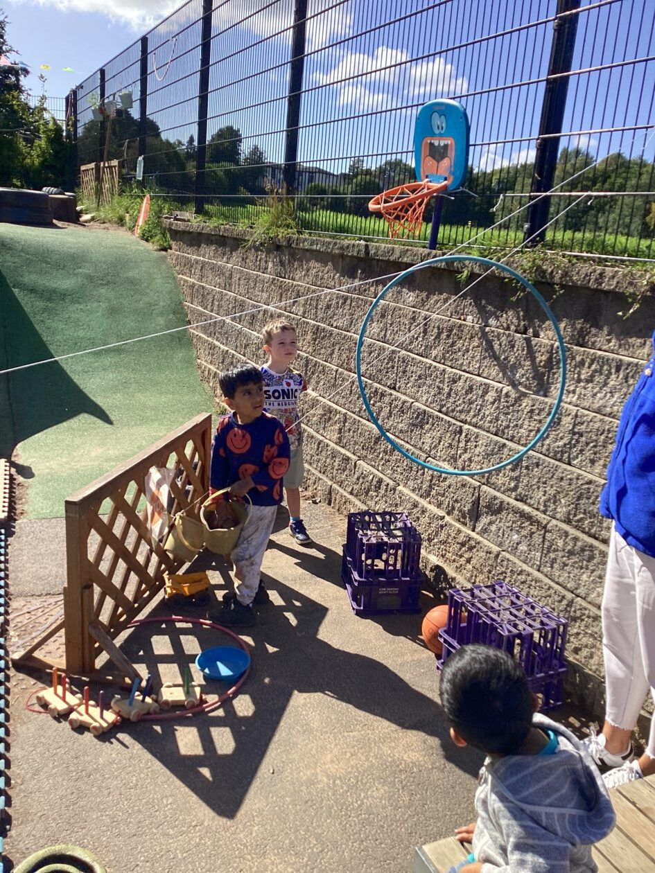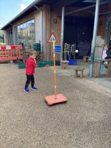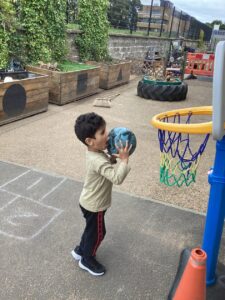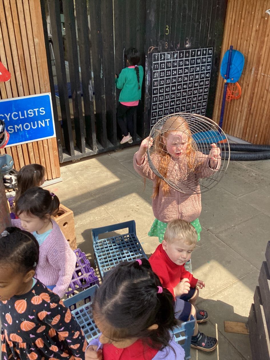 This week outdoors the children have been playing lots of different games. We have practised our throwing, catching and hitting a ball with a bat during ball games. One of our favourites has been basketball where the children formed their own teams and competed against each other. We have also enjoyed playing giant snakes and ladders out in the sunshine. We are learning to subitise and count, and also take turns with each other as we learn the rules of the game.