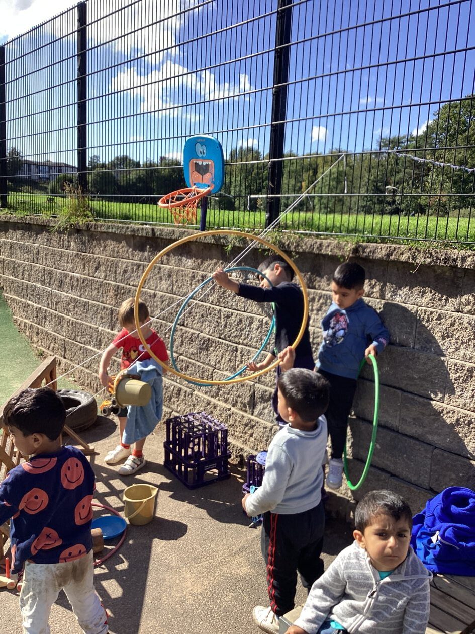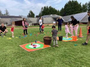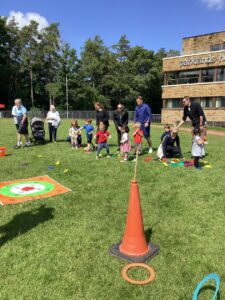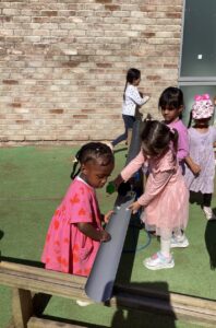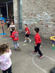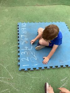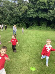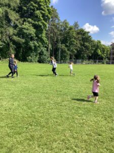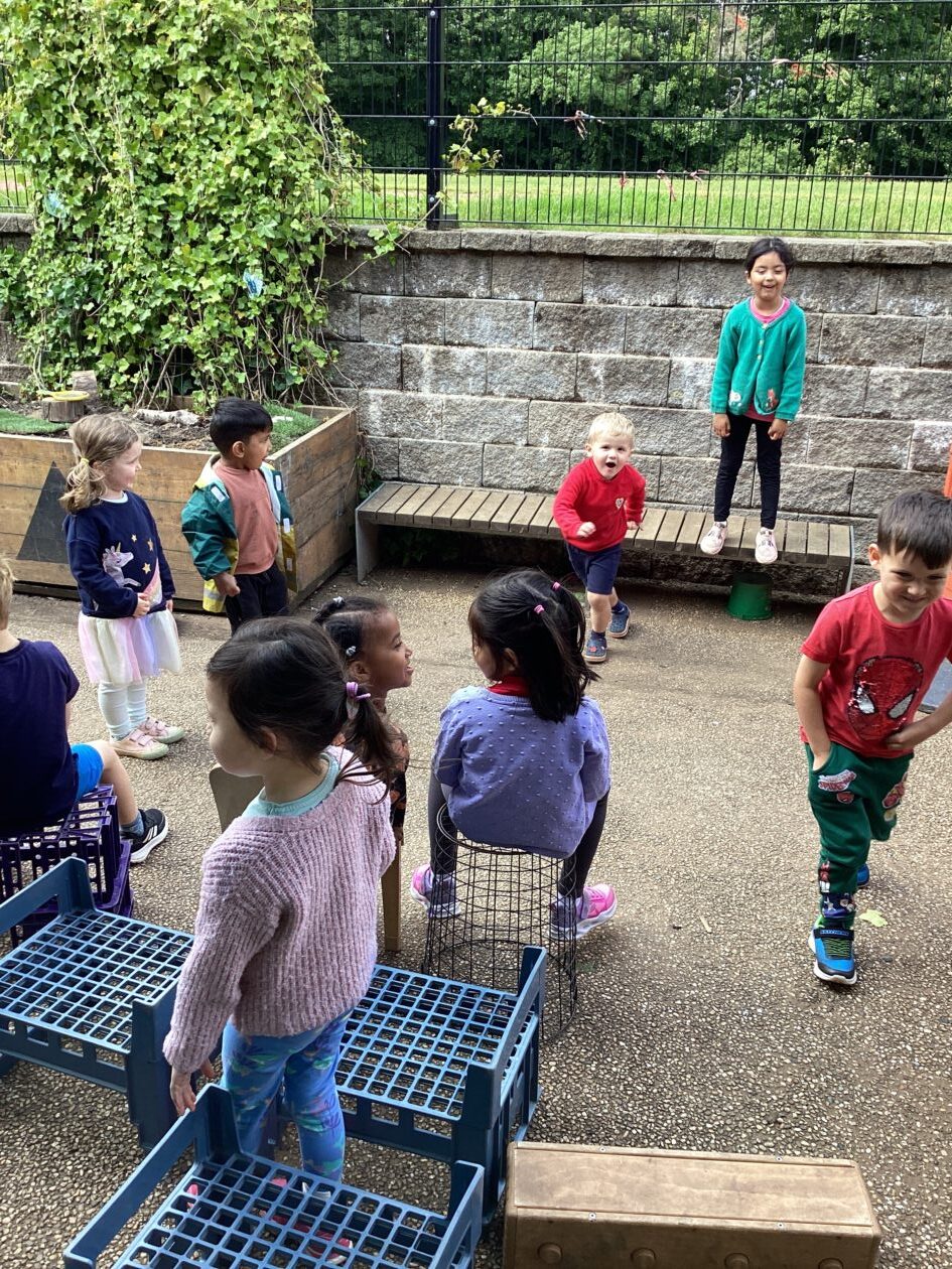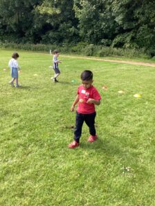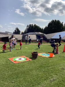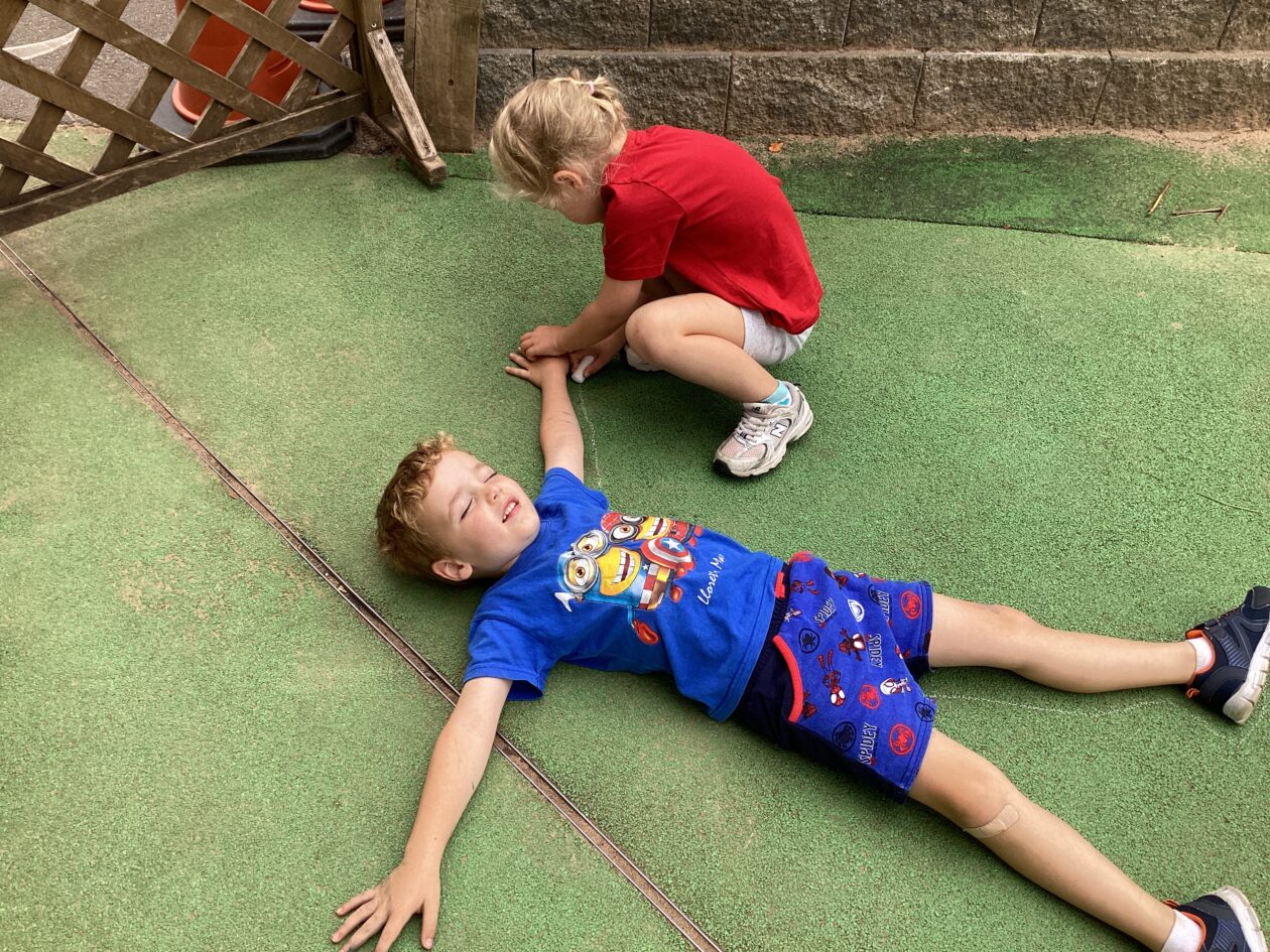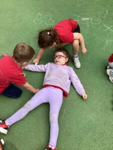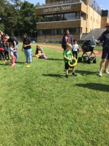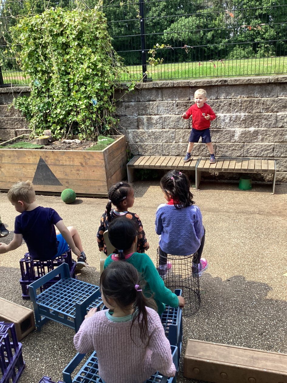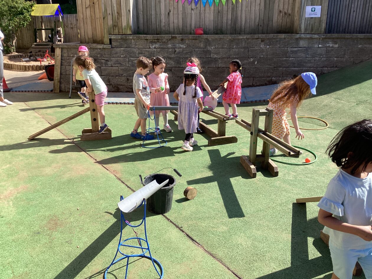 This week outdoors the children have been playing lots of different games. We have practised our throwing, catching and hitting a ball with a bat during ball games. One of our favourites has been basketball where the children formed their own teams and competed against each other. We have also enjoyed playing giant snakes and ladders out in the sunshine. We are learning to subitise and count, and also take turns with each other as we learn the rules of the game.