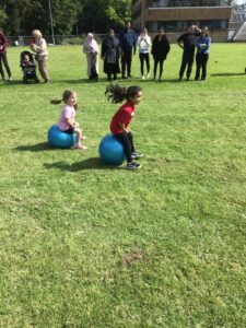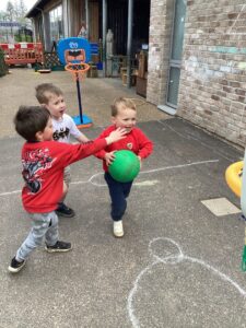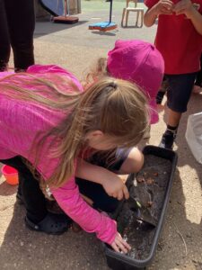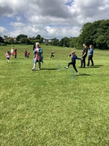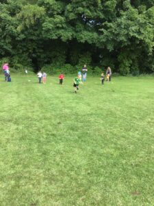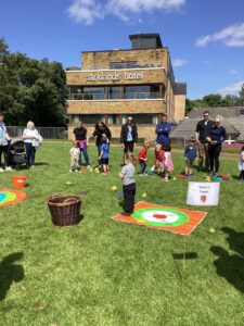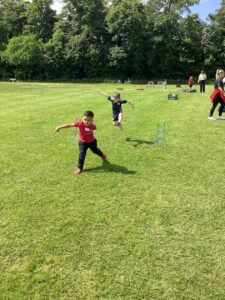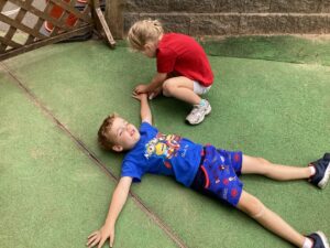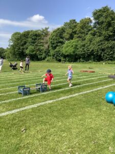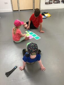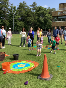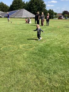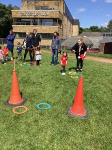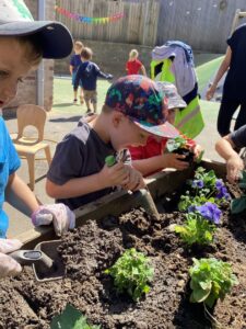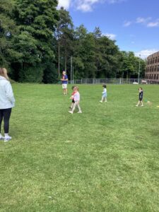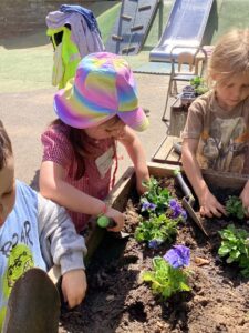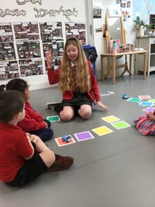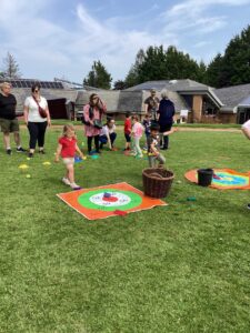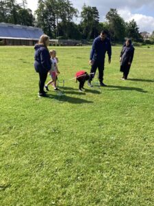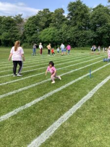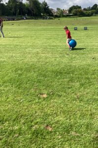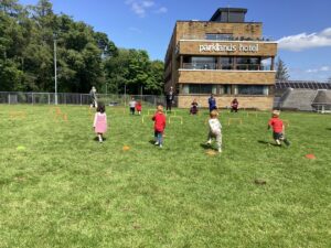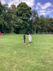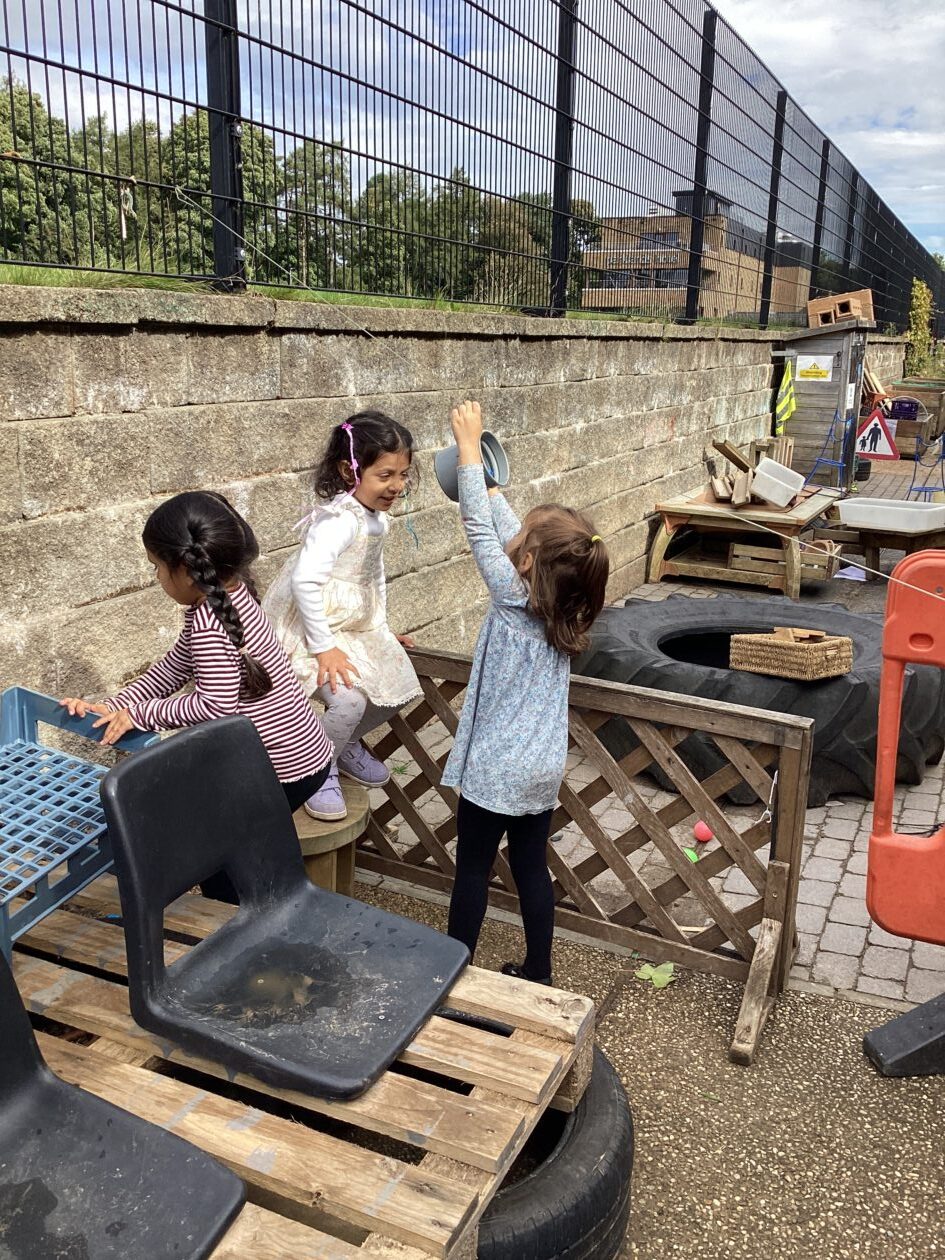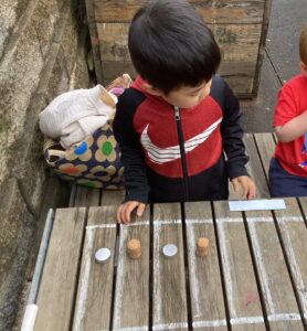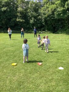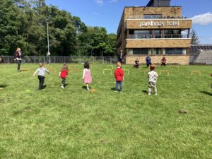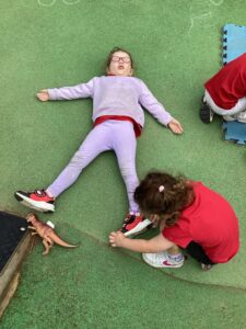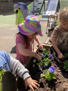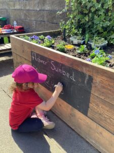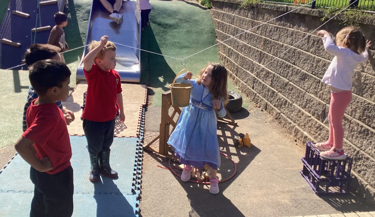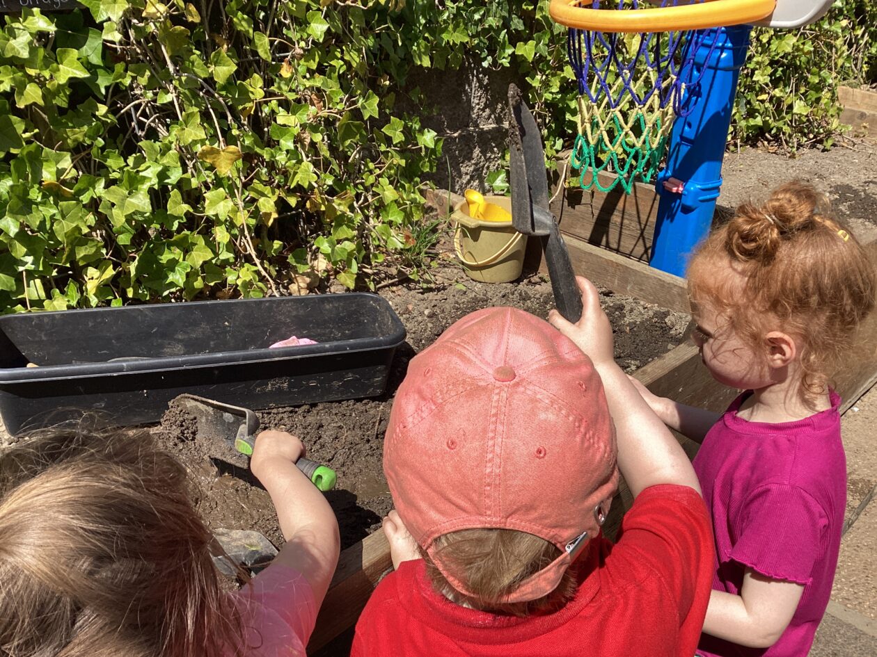 This week outdoors the children have been playing lots of different games. We have practised our throwing, catching and hitting a ball with a bat during ball games. One of our favourites has been basketball where the children formed their own teams and competed against each other. We have also enjoyed playing giant snakes and ladders out in the sunshine. We are learning to subitise and count, and also take turns with each other as we learn the rules of the game.