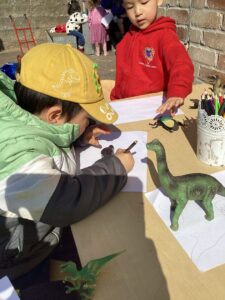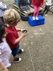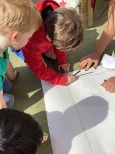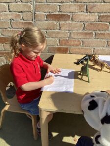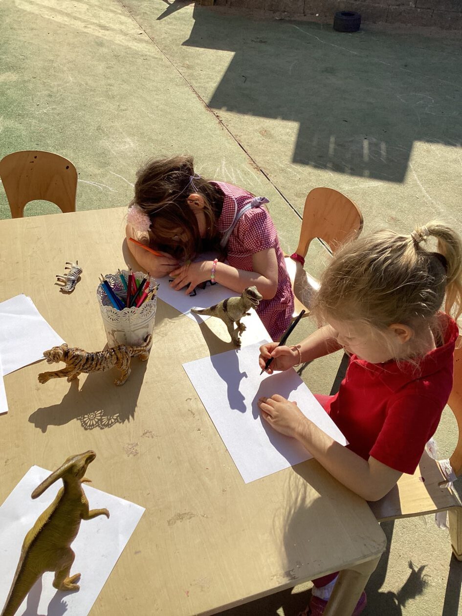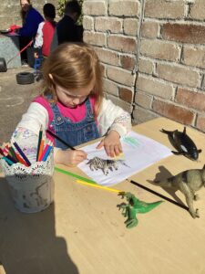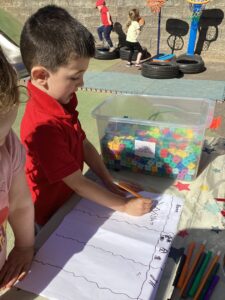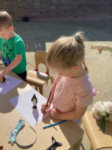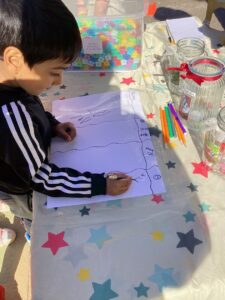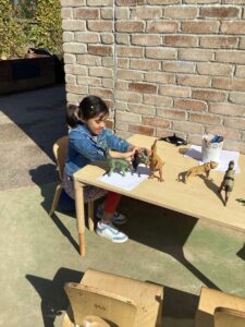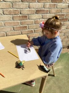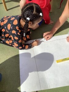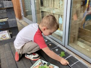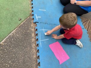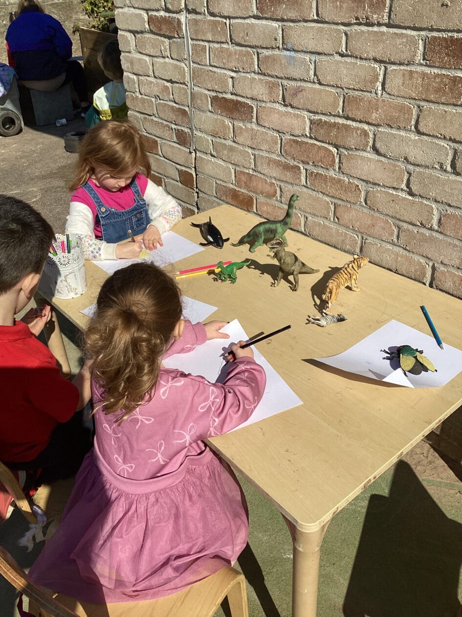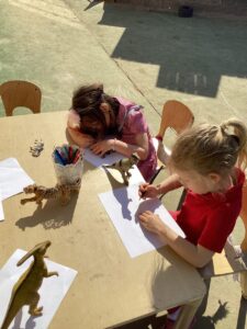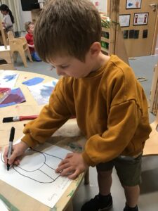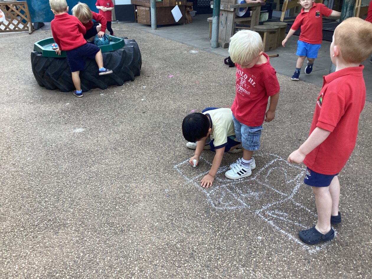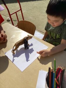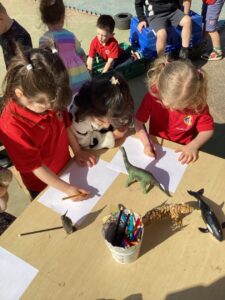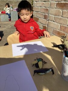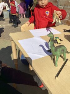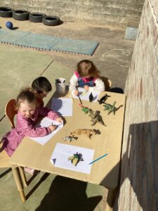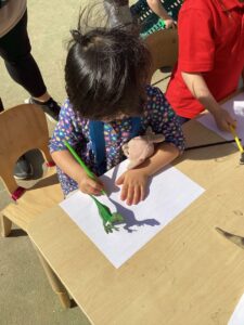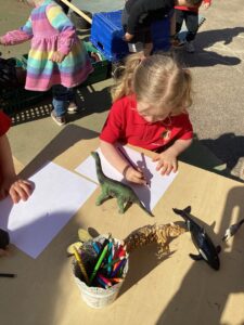 We have also been exploring what shadows are and where they come from. It was great to see the children’s problem solving skills as they figured out the best way to position the toys in the sun to create a shadow. They then had a go at drawing around the shadows, concentrating to form the shape of the animals. Some children then coloured these in or added more details to their drawings.