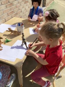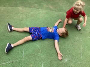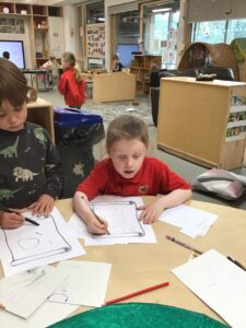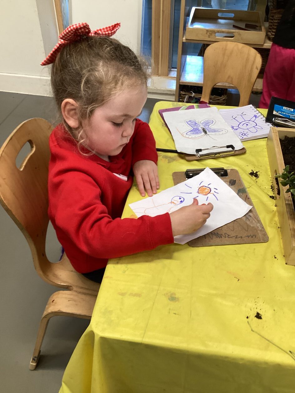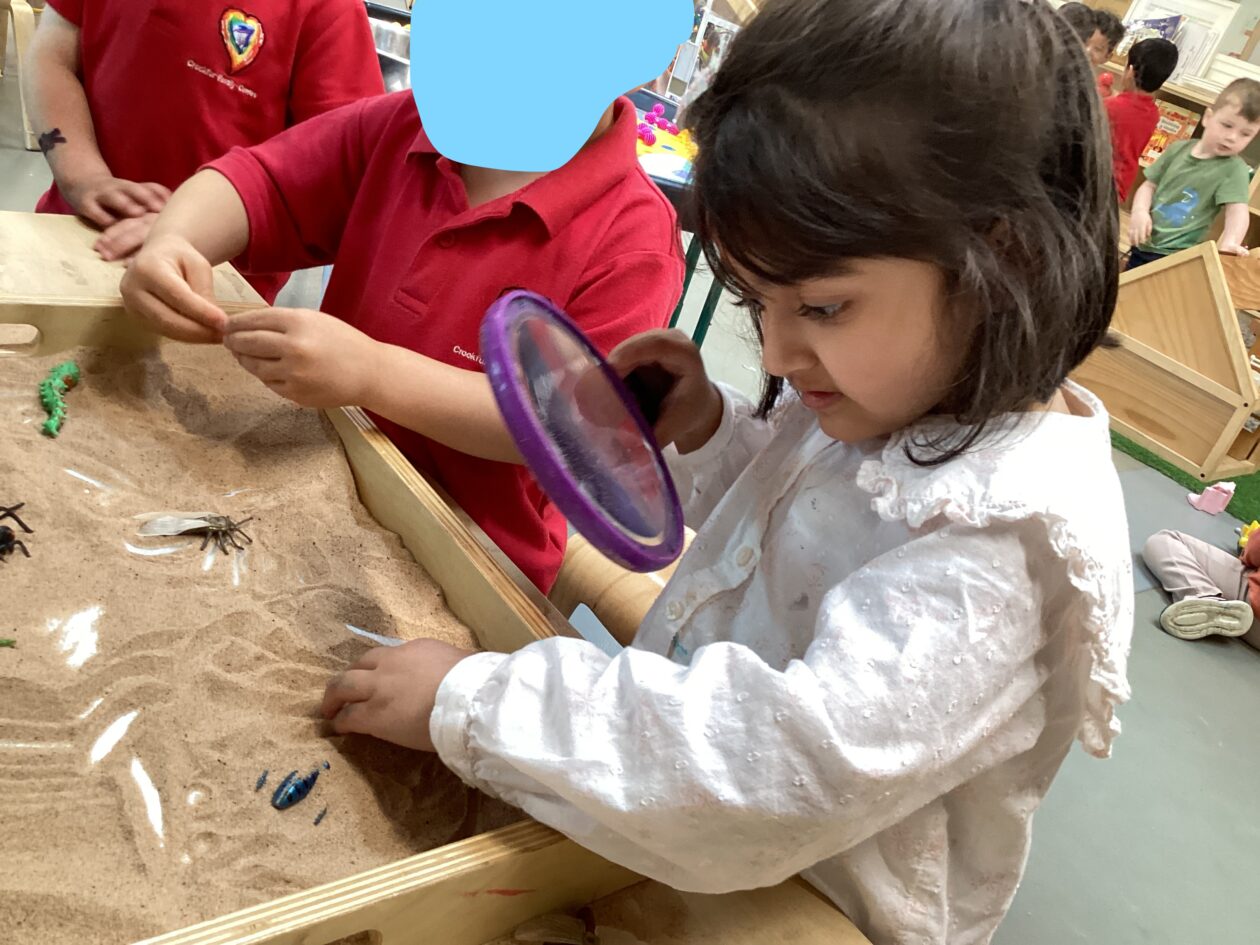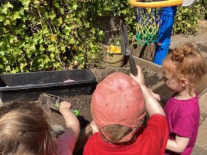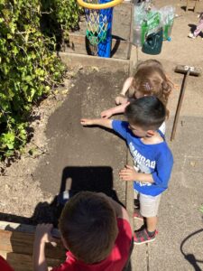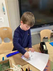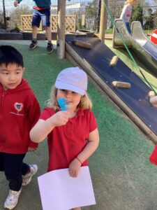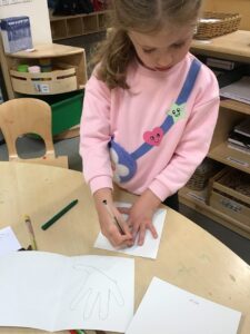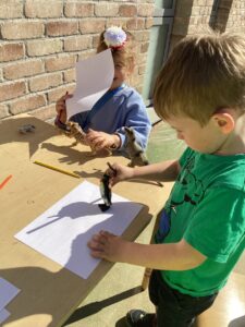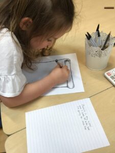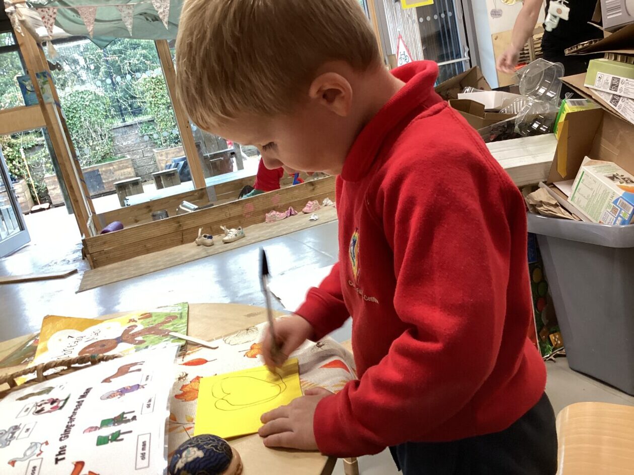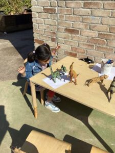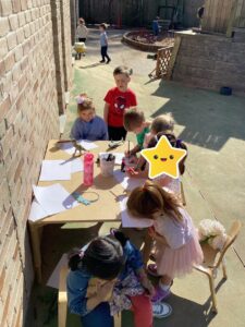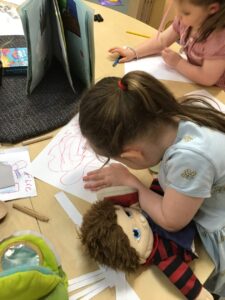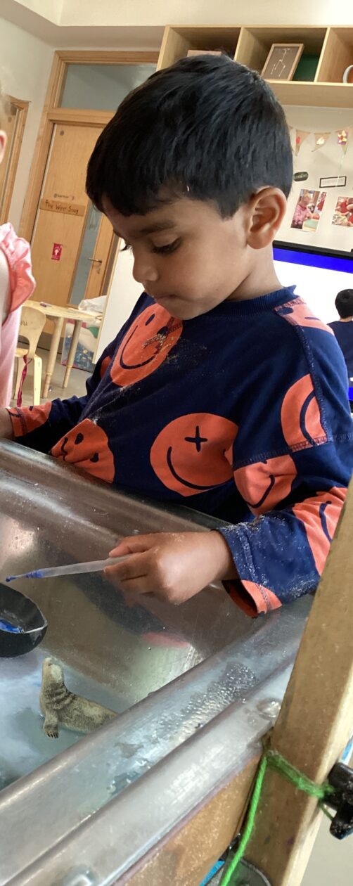 We have also been exploring what shadows are and where they come from. It was great to see the children’s problem solving skills as they figured out the best way to position the toys in the sun to create a shadow. They then had a go at drawing around the shadows, concentrating to form the shape of the animals. Some children then coloured these in or added more details to their drawings.