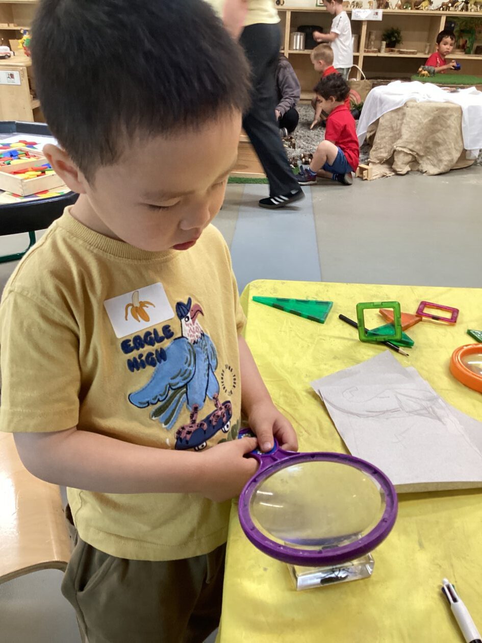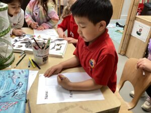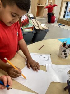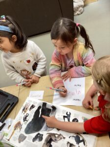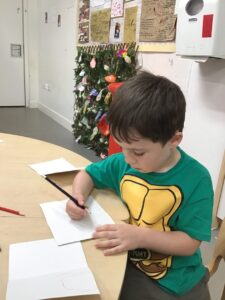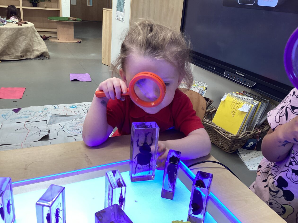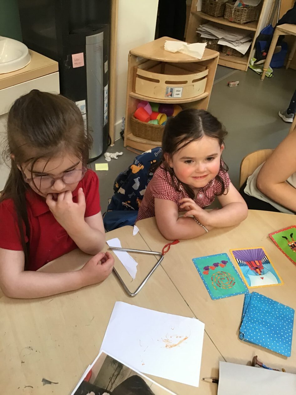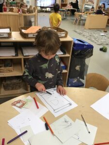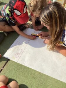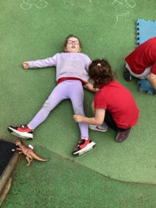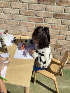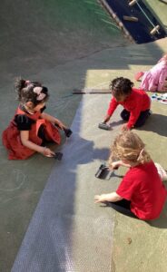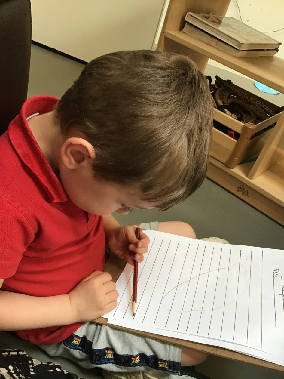 We have also been exploring what shadows are and where they come from. It was great to see the children’s problem solving skills as they figured out the best way to position the toys in the sun to create a shadow. They then had a go at drawing around the shadows, concentrating to form the shape of the animals. Some children then coloured these in or added more details to their drawings.