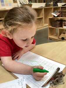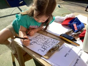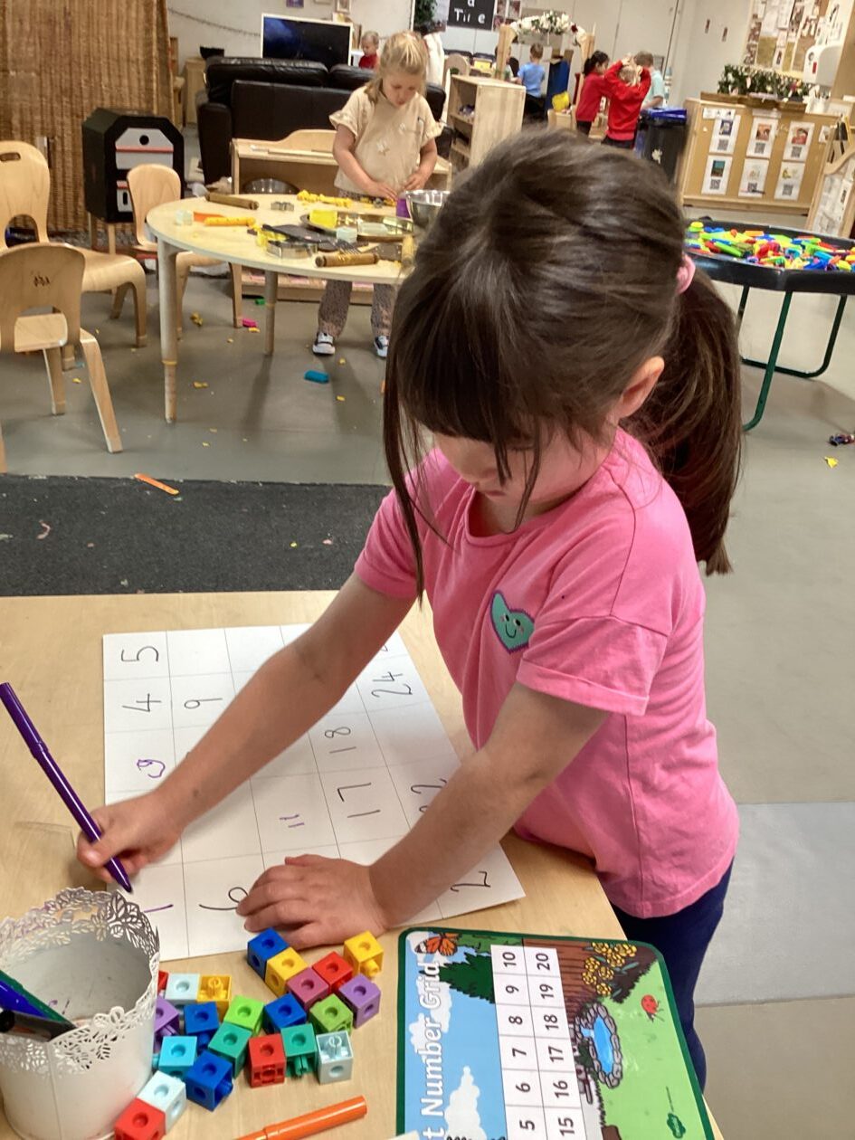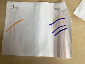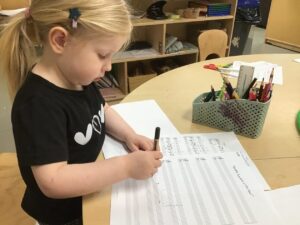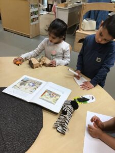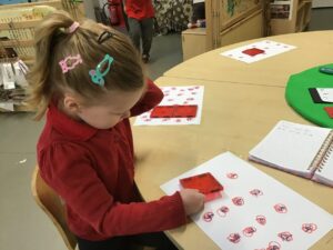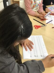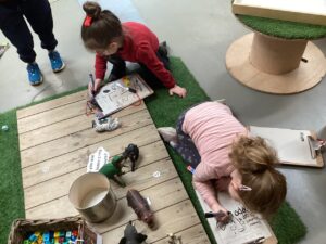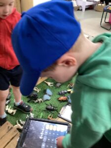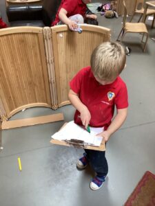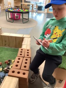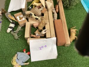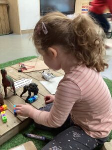 In the block and small world area this week we have been using charts for recording data. The children have been using non-standard units of measure to check animals height and length. They have been using comparative language to describe different sizes and mark making with purpose for displaying information on the charts. Some children also created a zoo and used the chart to record how many animals were in the zoo.