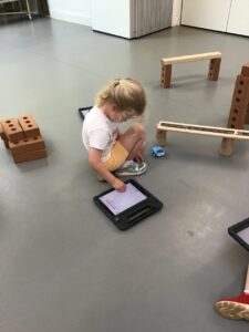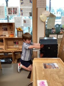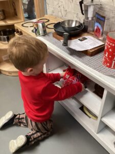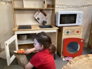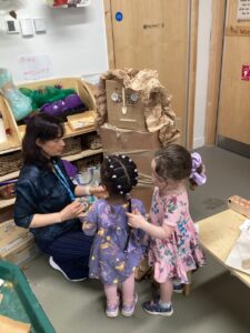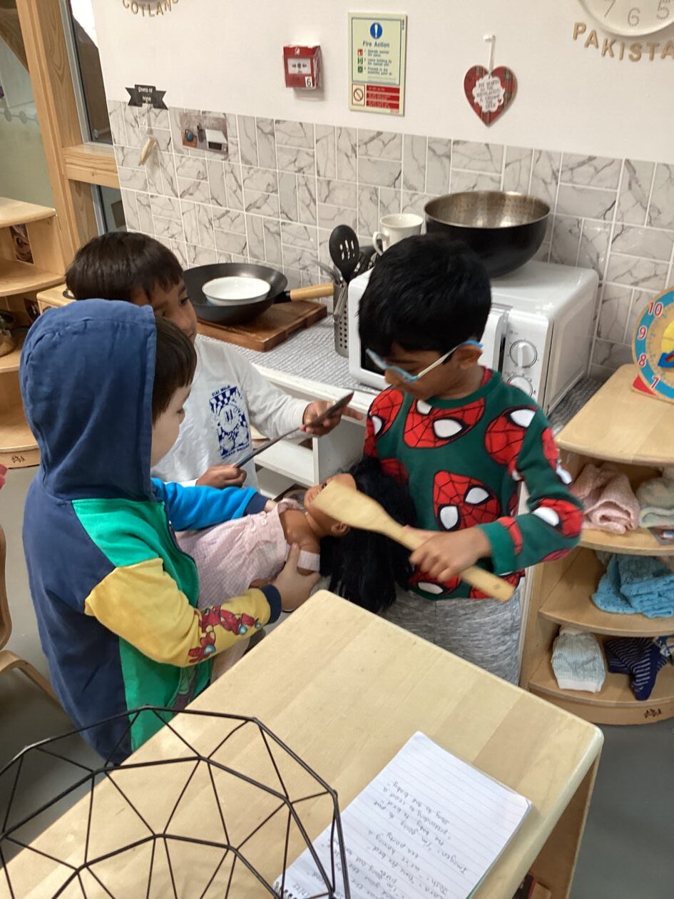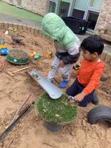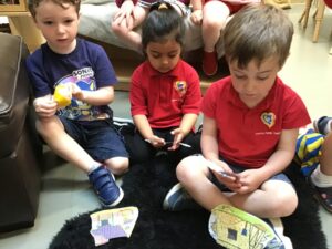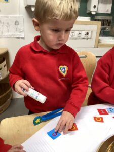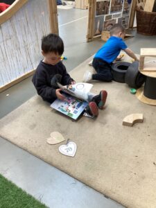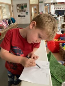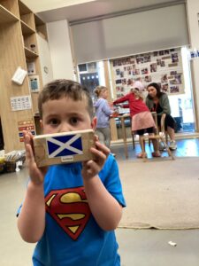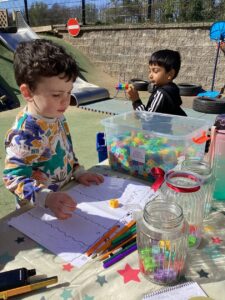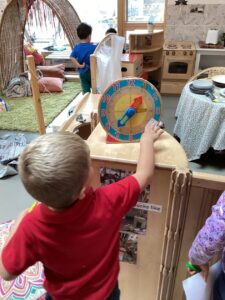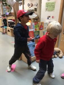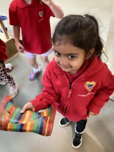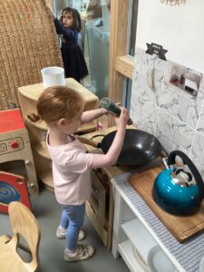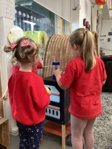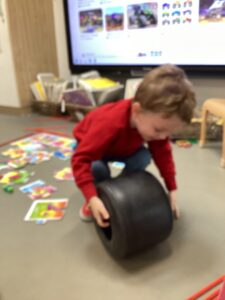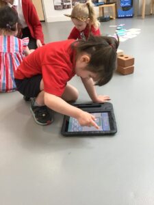In the small world area and blocks the children have been exploring transport and how different vehicles move. We have created an airport to support children’s interest surrounding this area. It has allowed children to explore movement of objects alongside various other areas of learning. This includes exploring different countries including their flags,  different iconic structures within different countries, environmental print of different airlines, times of departure and engaging in role play showing creativity, imagination and communication.