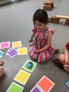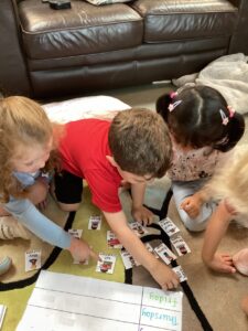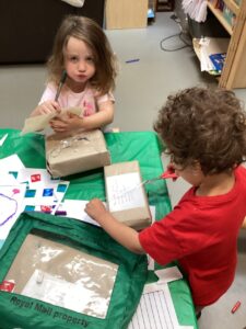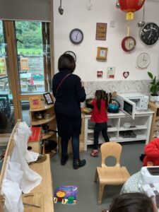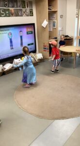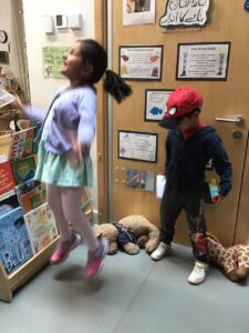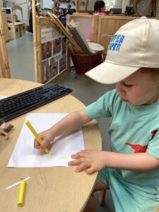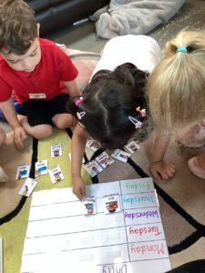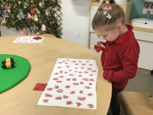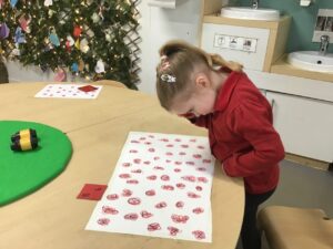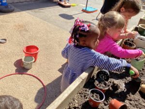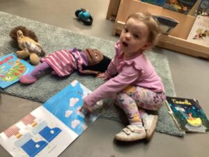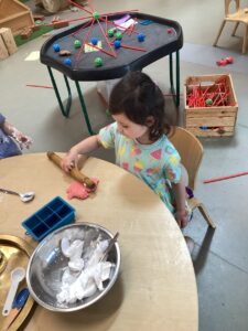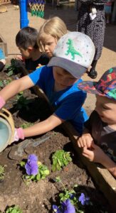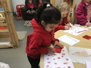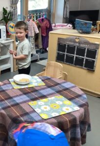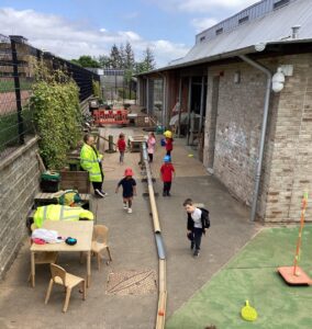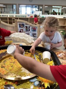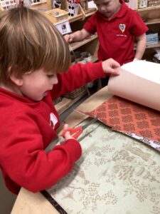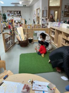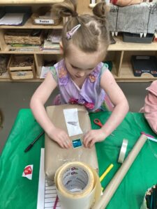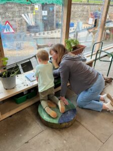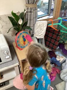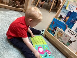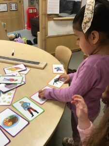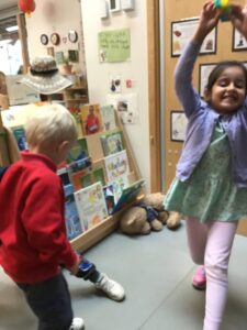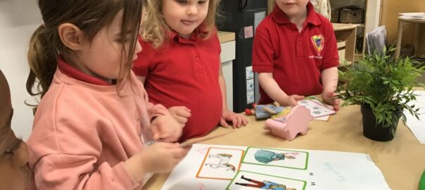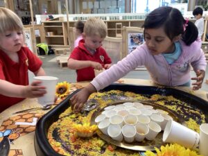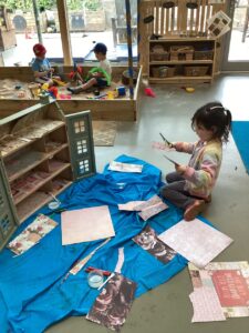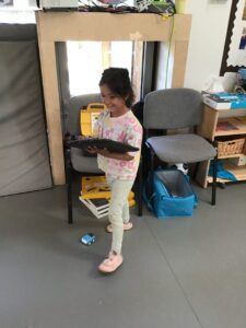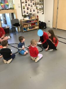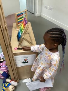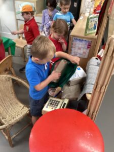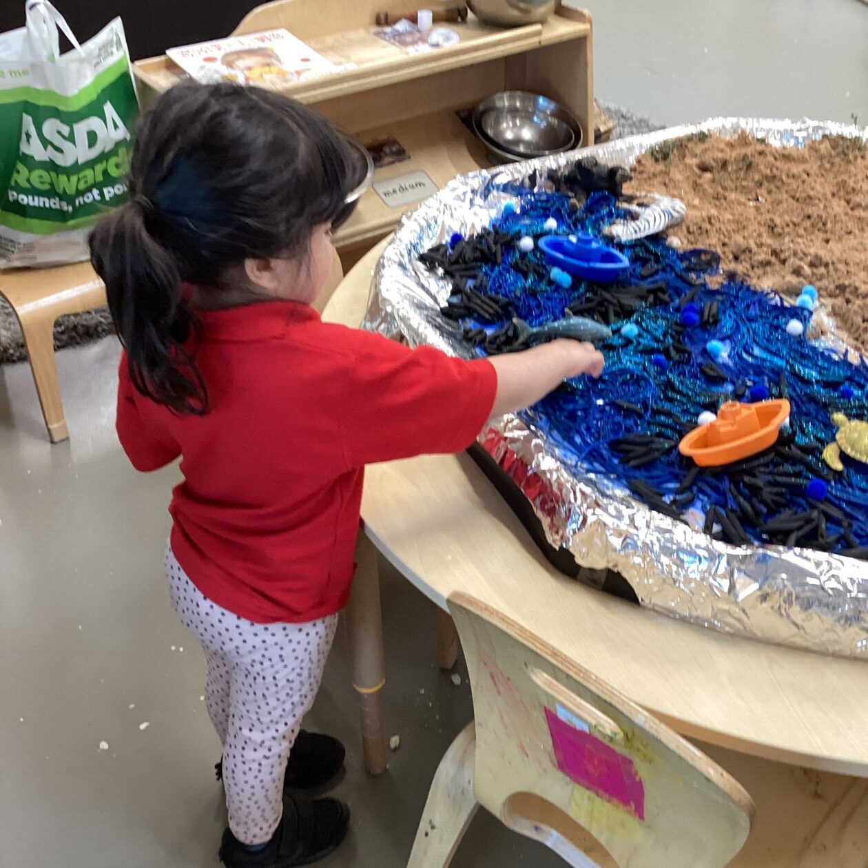 In the small world area and blocks the children have been exploring transport and how different vehicles move. We have created an airport to support children’s interest surrounding this area. It has allowed children to explore movement of objects alongside various other areas of learning. This includes exploring different countries including their flags,  different iconic structures within different countries, environmental print of different airlines, times of departure and engaging in role play showing creativity, imagination and communication.