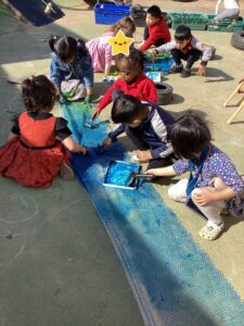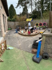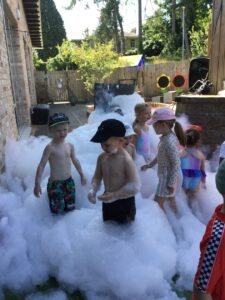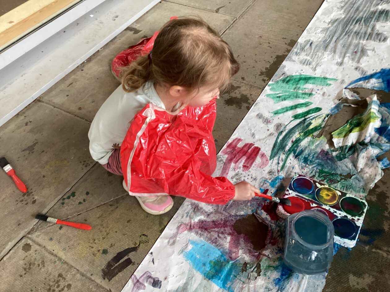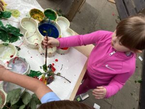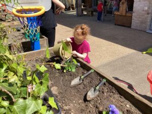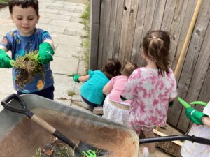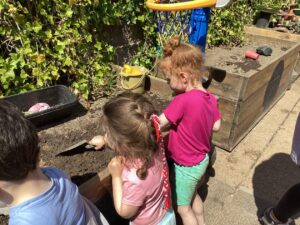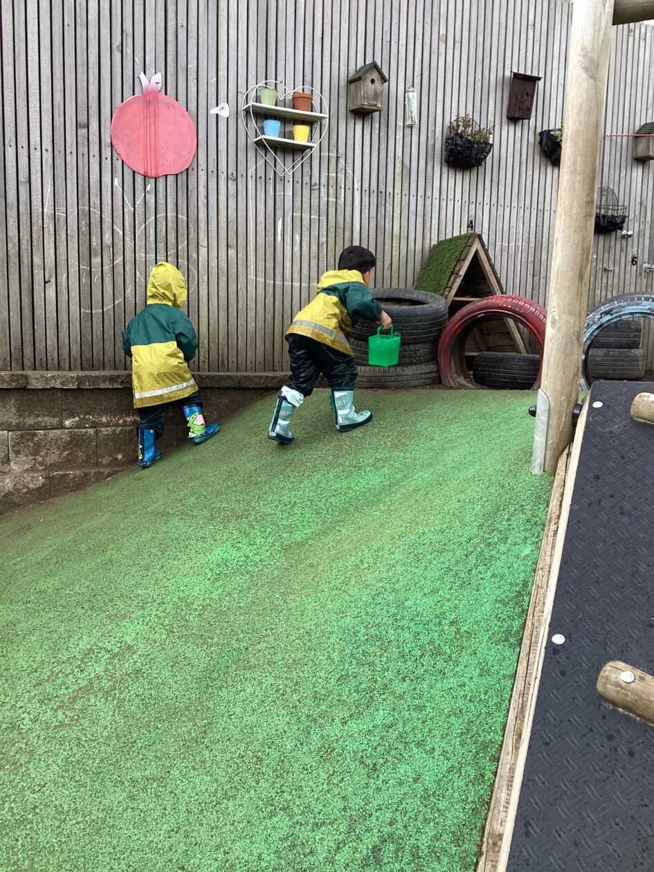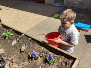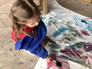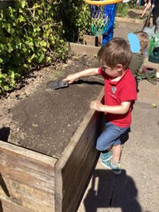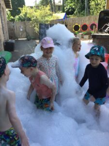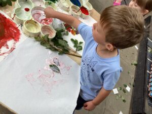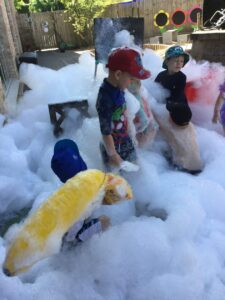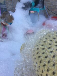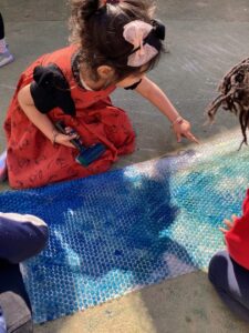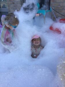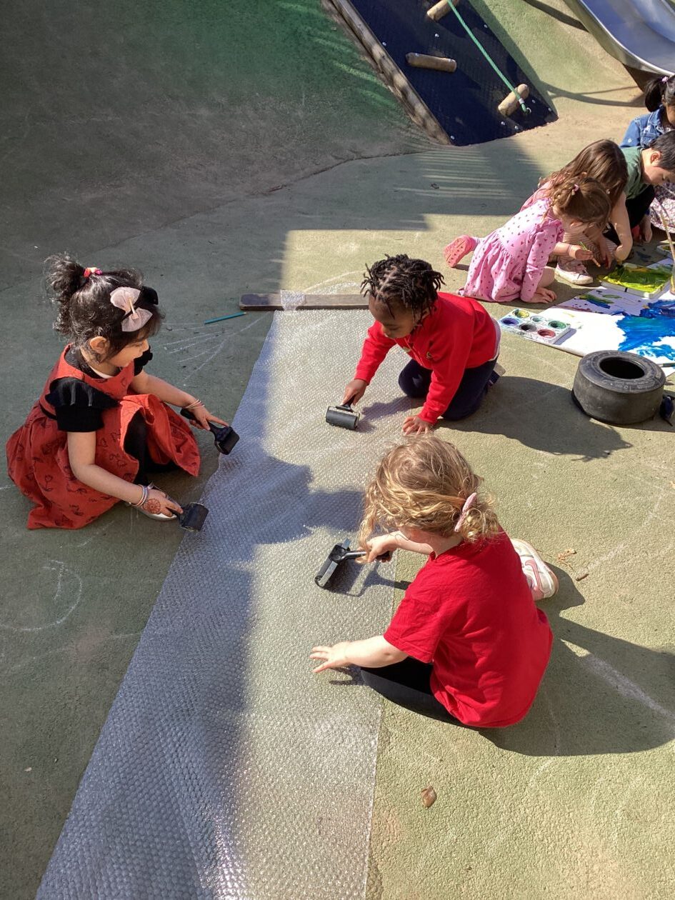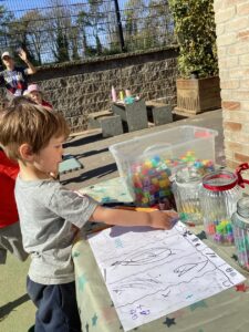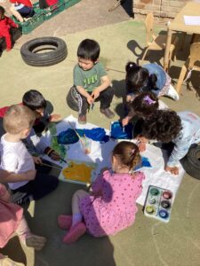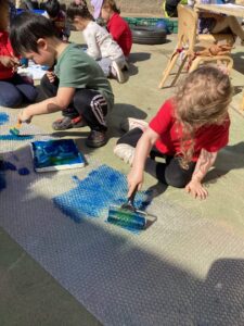 This week in the garden we have been enjoying the lovely sunshine!. The children have been continuing to work on their gross motor skills as they used big arm movements to paint on the bubble wrap and paper using the rollers and paintbrushes. It was also great fun to pop the bubble wrap afterwards, using the small muscles in our fingers.