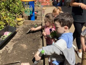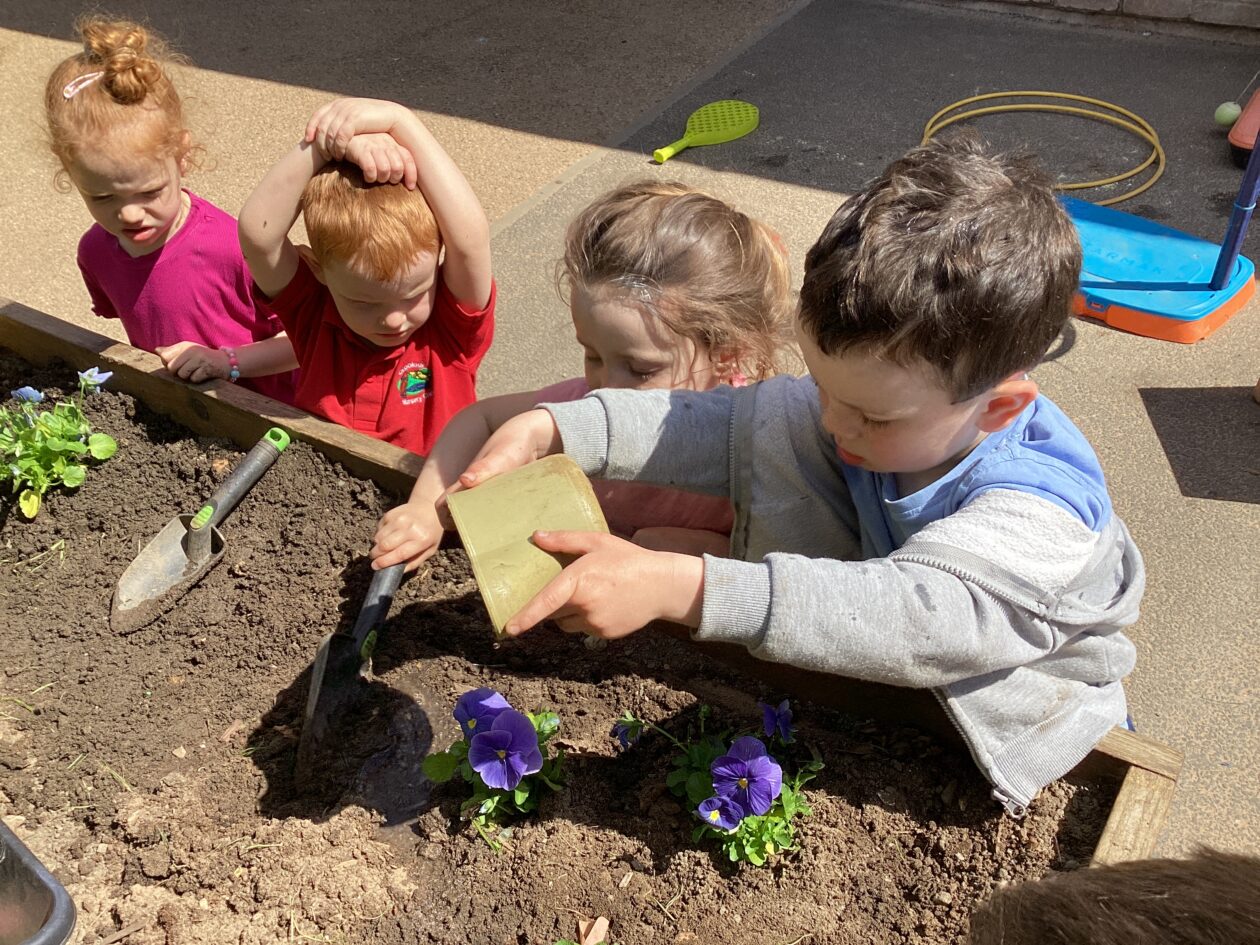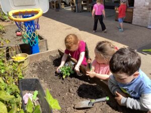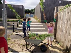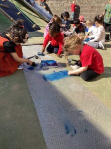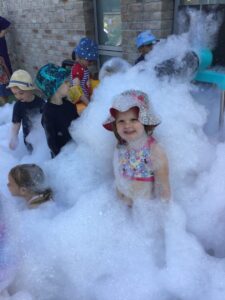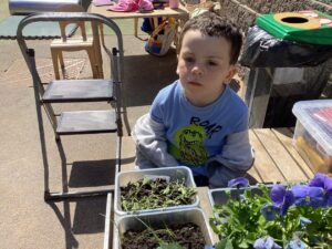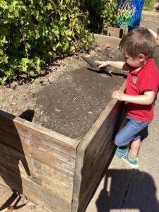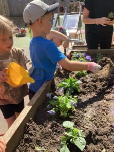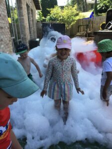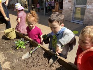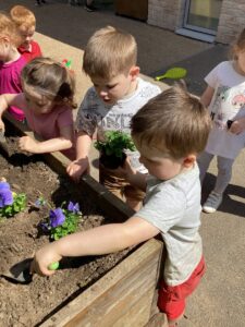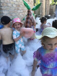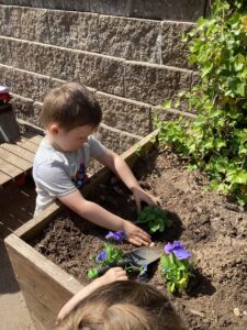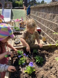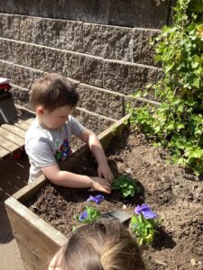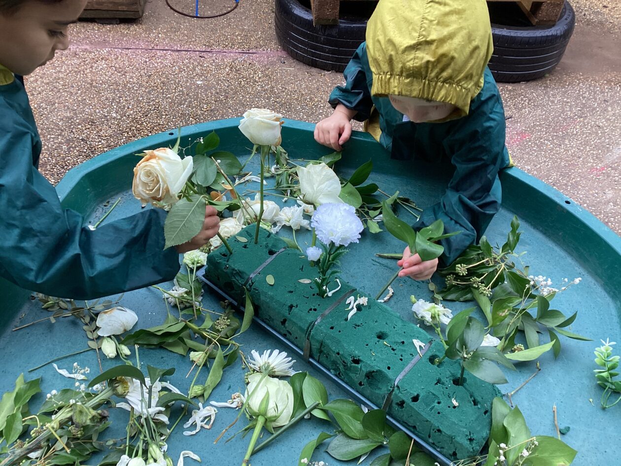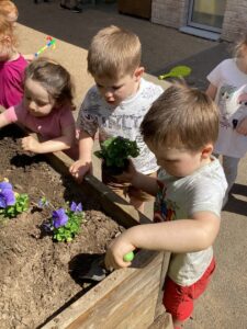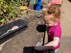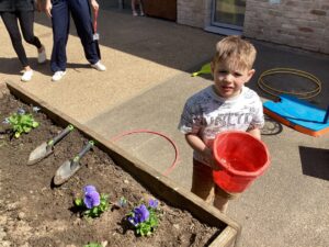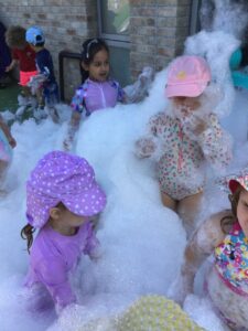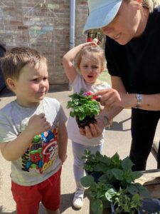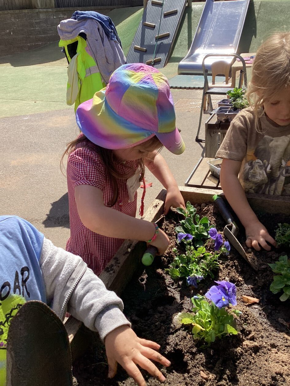 This week in the garden we have been enjoying the lovely sunshine!. The children have been continuing to work on their gross motor skills as they used big arm movements to paint on the bubble wrap and paper using the rollers and paintbrushes. It was also great fun to pop the bubble wrap afterwards, using the small muscles in our fingers.