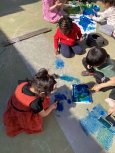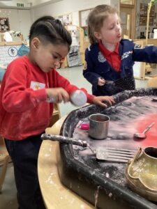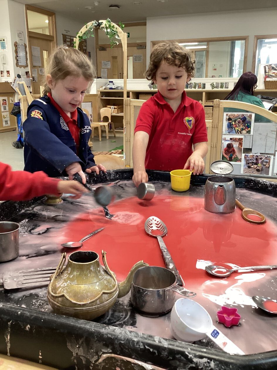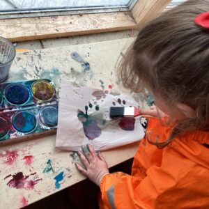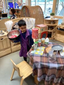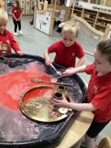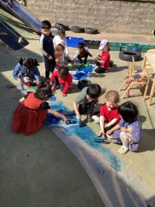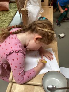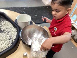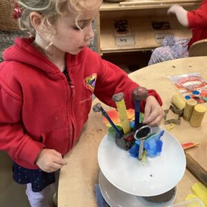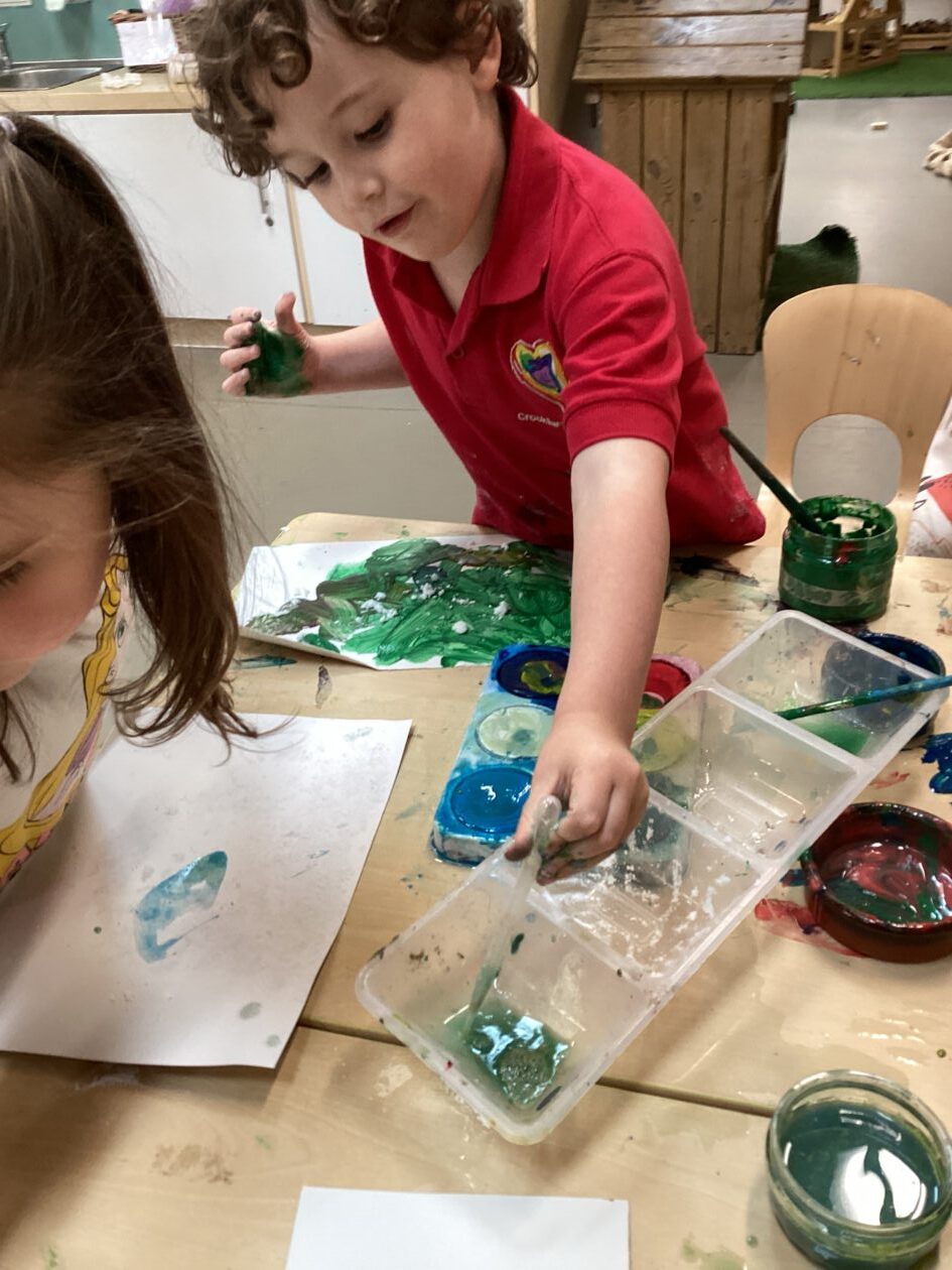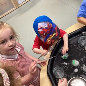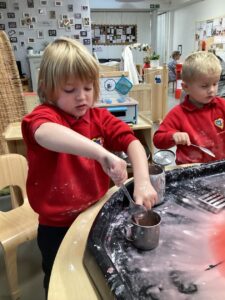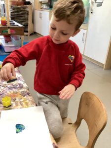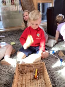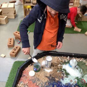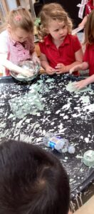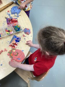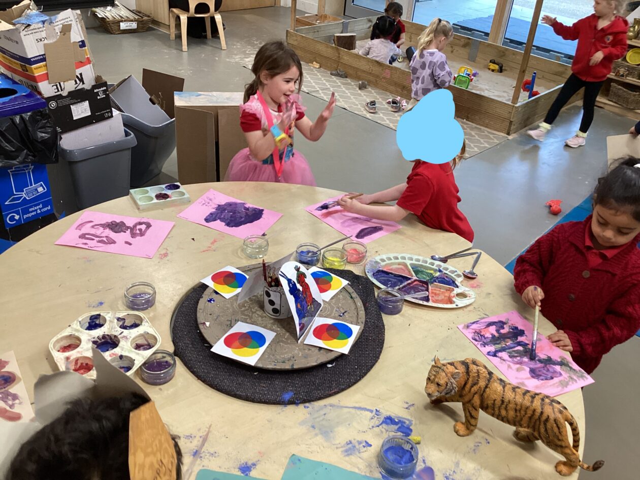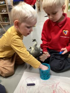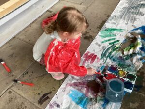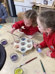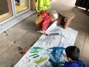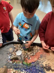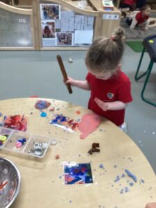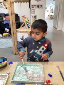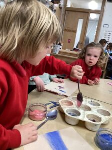 In the creative area we have been exploring colours through colour mixing. We have been exploring primary colours and mixing them to make a variety of shades. We have also been creating our own paint by crushing chalk, mixing the chalk colours and adding water. The children have been enjoying the process of this.