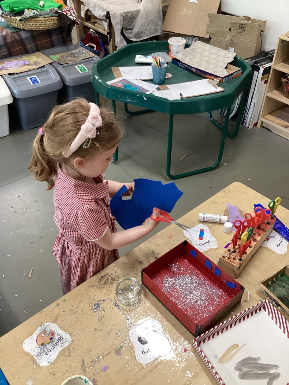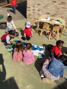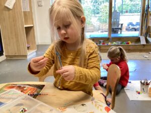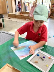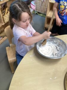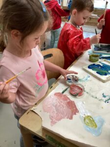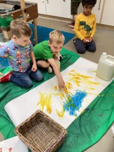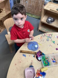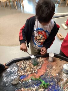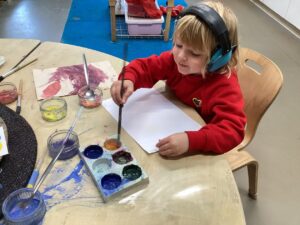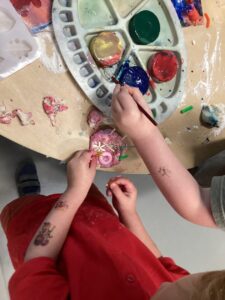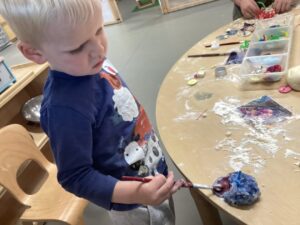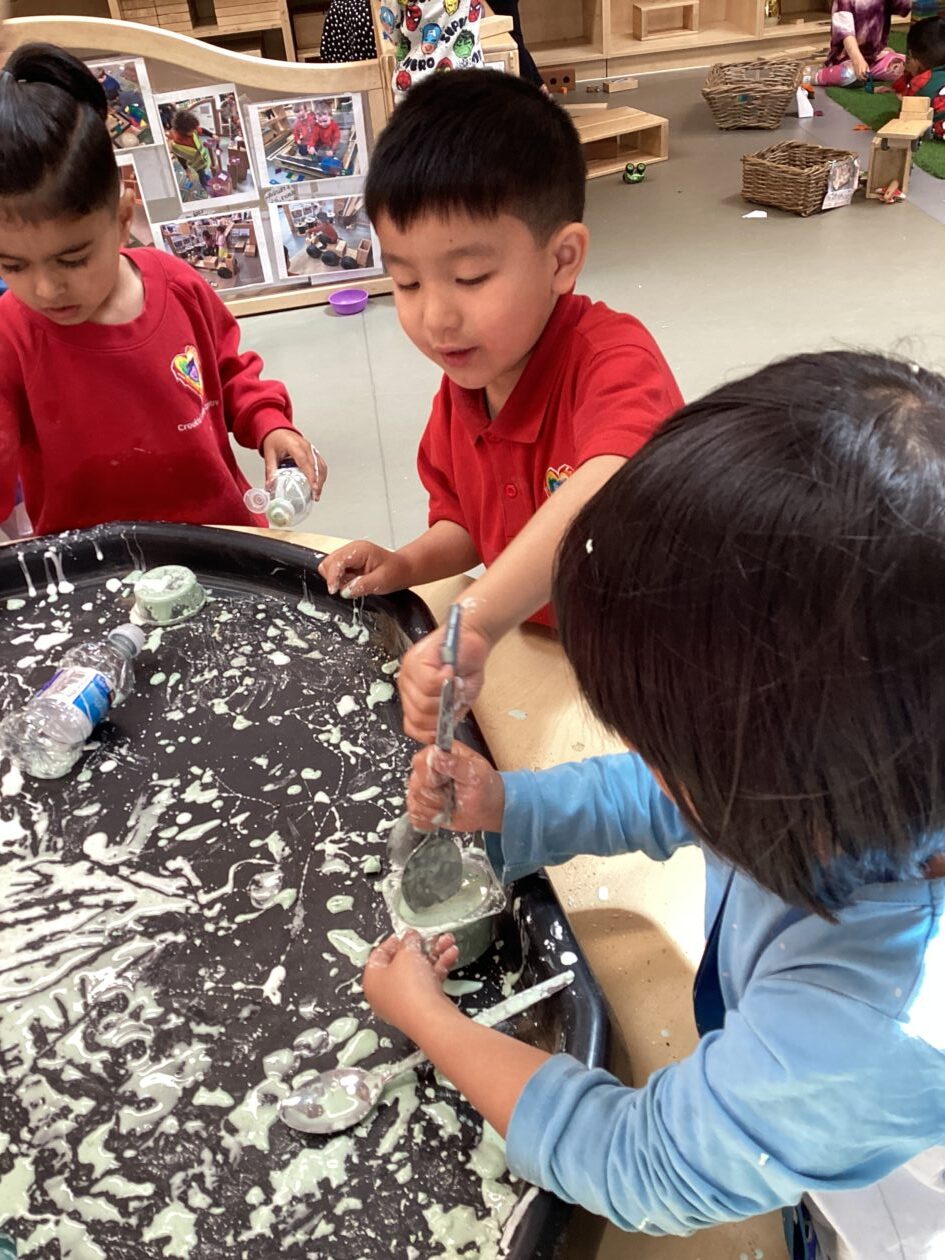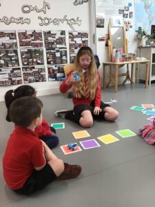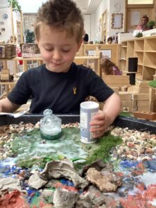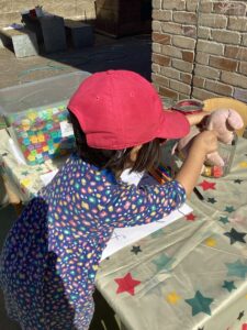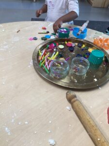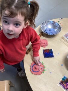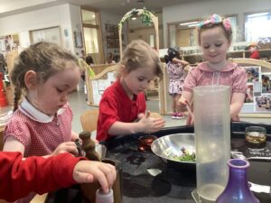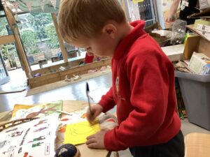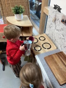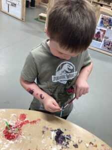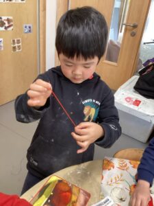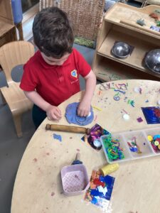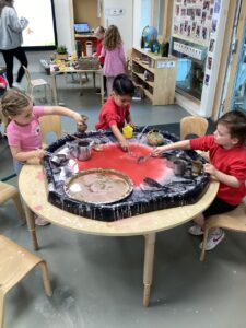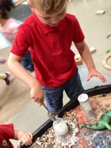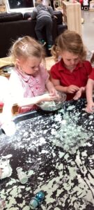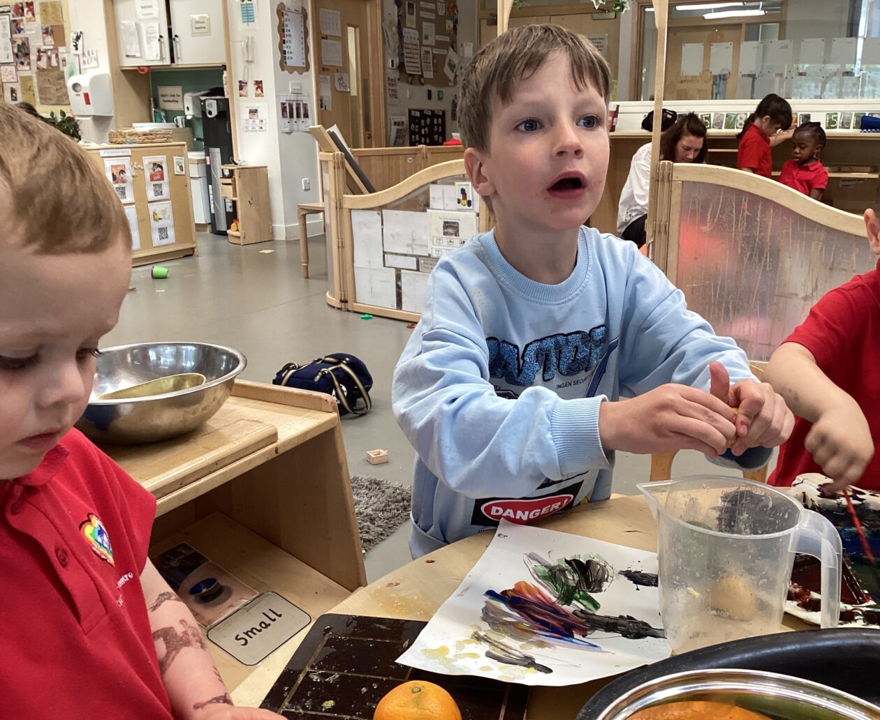 In the creative area we have been exploring colours through colour mixing. We have been exploring primary colours and mixing them to make a variety of shades. We have also been creating our own paint by crushing chalk, mixing the chalk colours and adding water. The children have been enjoying the process of this.