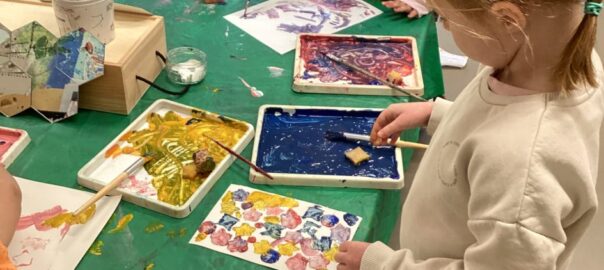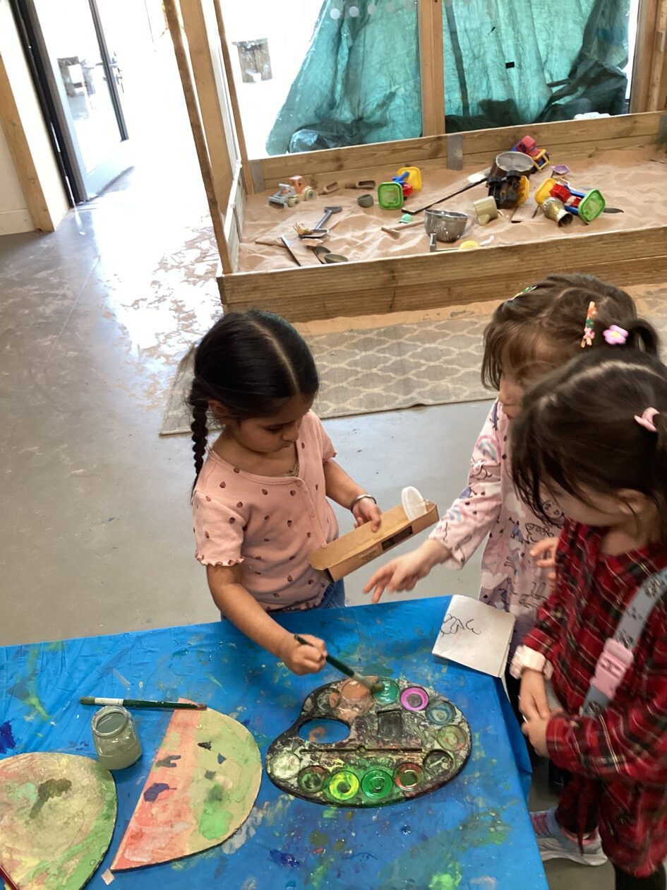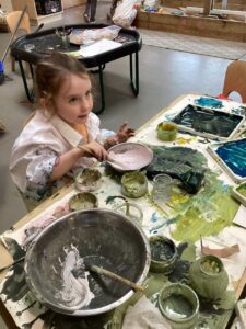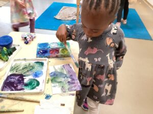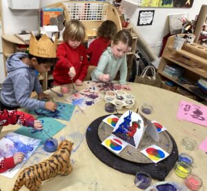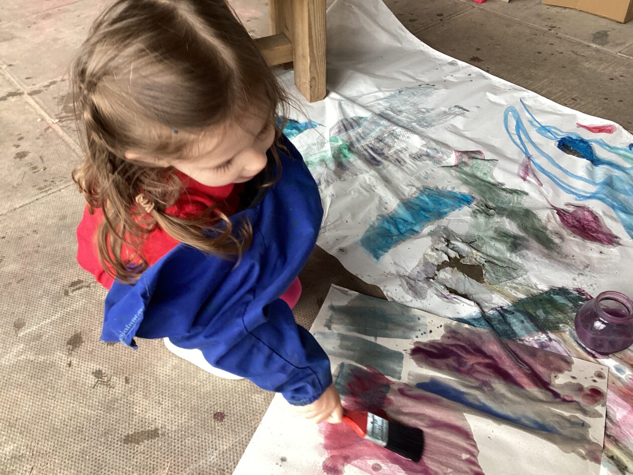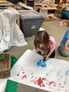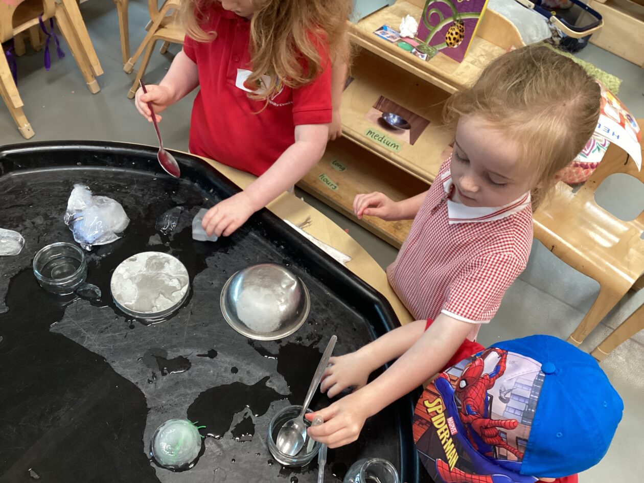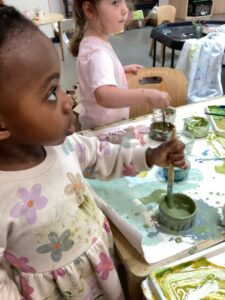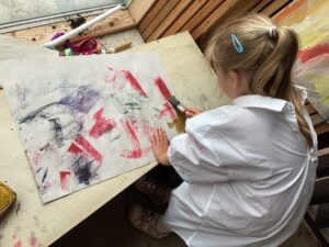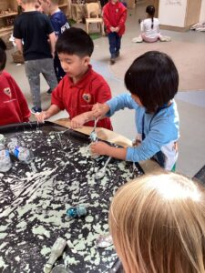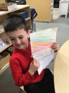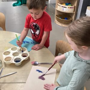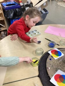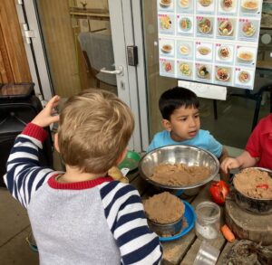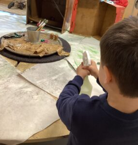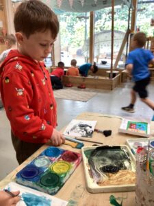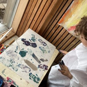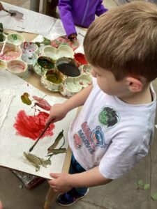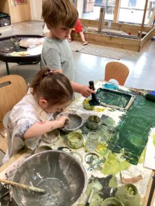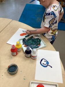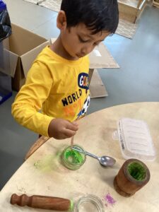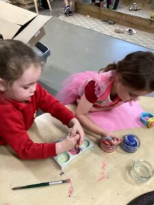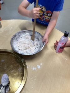 In the creative area we have been exploring colours through colour mixing. We have been exploring primary colours and mixing them to make a variety of shades. We have also been creating our own paint by crushing chalk, mixing the chalk colours and adding water. The children have been enjoying the process of this.