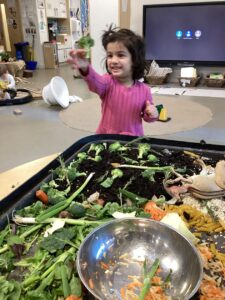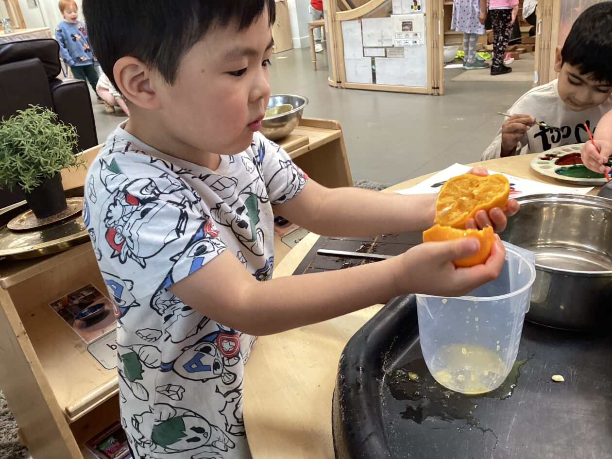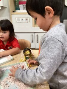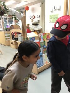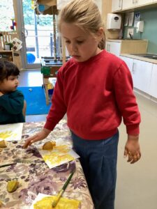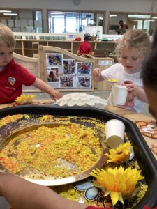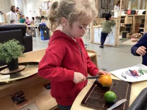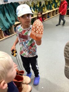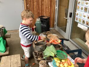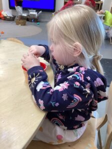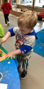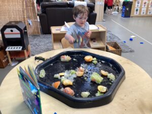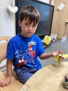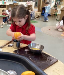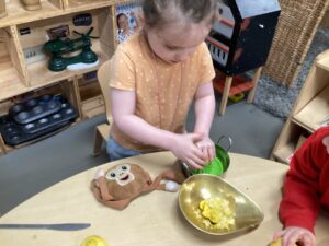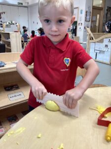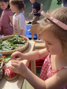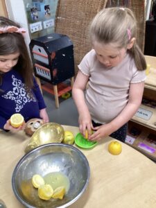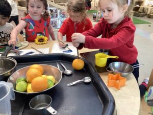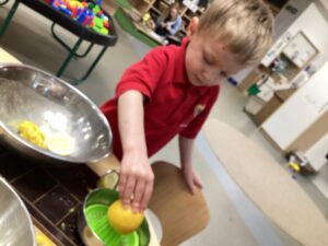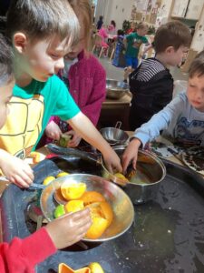 In the malleable area we have been exploring the book “Supertato” by Sue Hendra and Paul Linnet. The children have been listening to stories of Supertato and we have been exploring different fruits and vegetables, we have been using our senses: sight, touch and smell to do this. We especially enjoyed smelling the lemons and oranges!