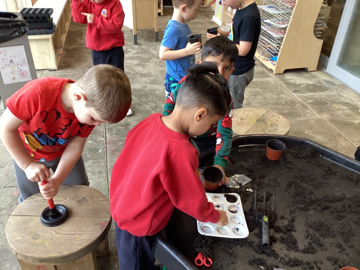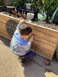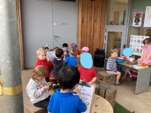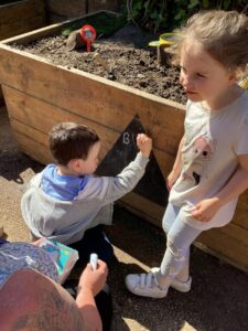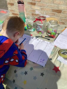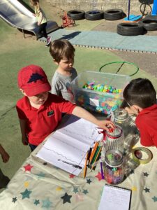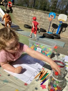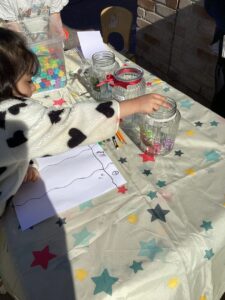 This week in the garden we’ve been continuing to enjoy the sunshine and finding out what the children would like to do for their spring experiences next week. We set up a voting system with some ideas and the choices included a spring walk, giant snakes and ladders and an Easter egg hunt. The children then explored how to record their choices and organise information through mark making. We discussed which jars had the most and least number of cubes and had a go at estimating how many were in each jar. The children have been busy counting the votes so look out next week for the results!