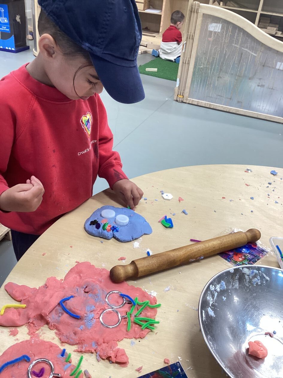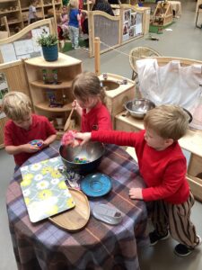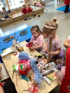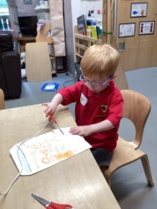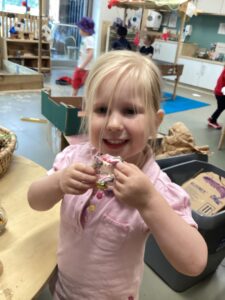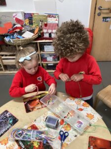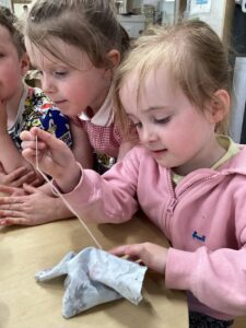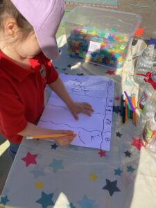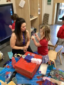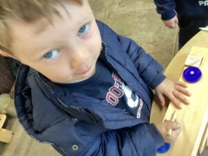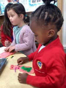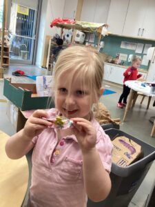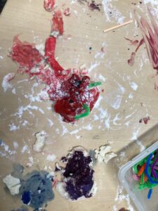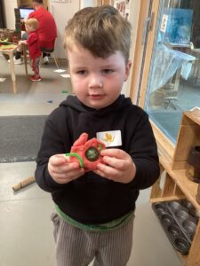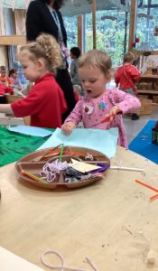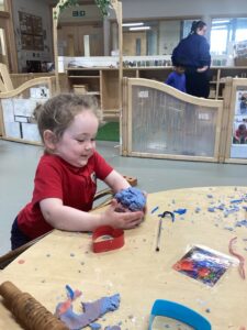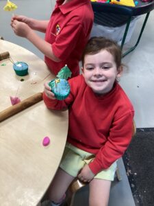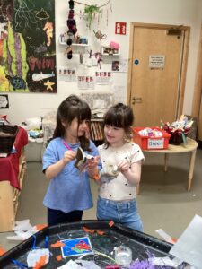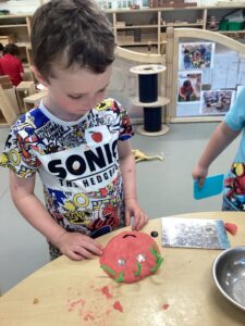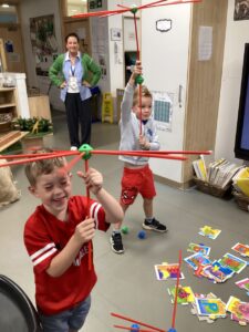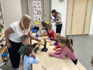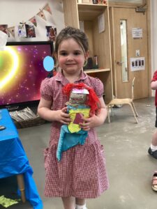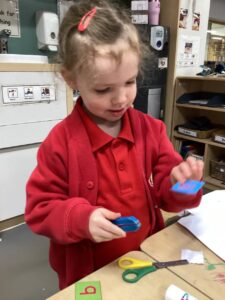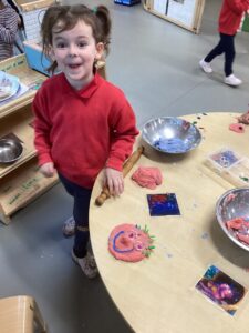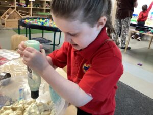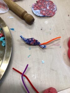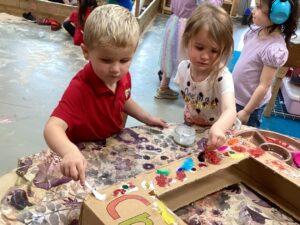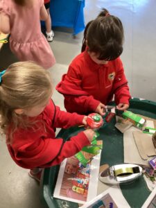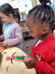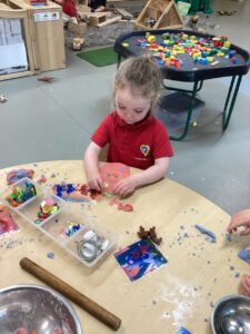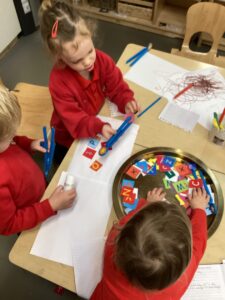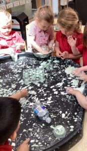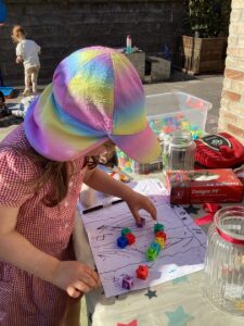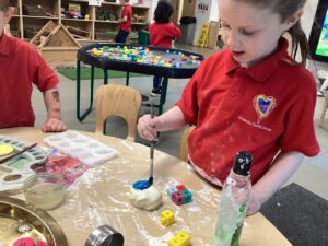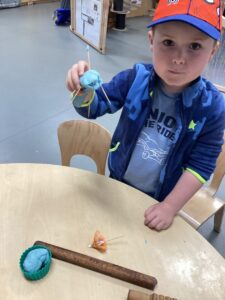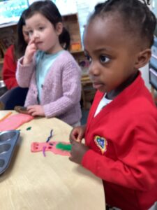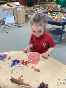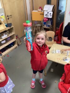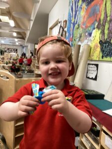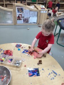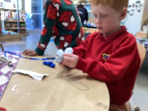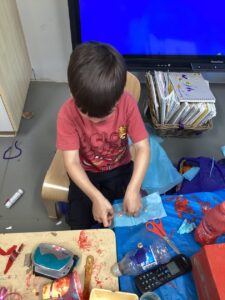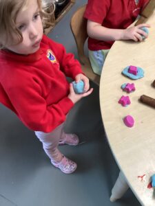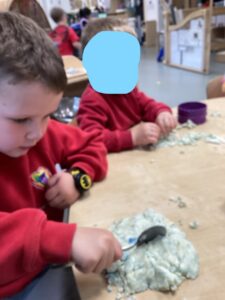 This week the children have been reading The Smeds and The Smoos. They decided to  make a batch of blue playdough, a batch of red playdough and then got creative with some loose parts, making their very own Smeds and Smoos. Some of the children even made some of their own aliens “mine’s called wiggly tickly wiggly” AY