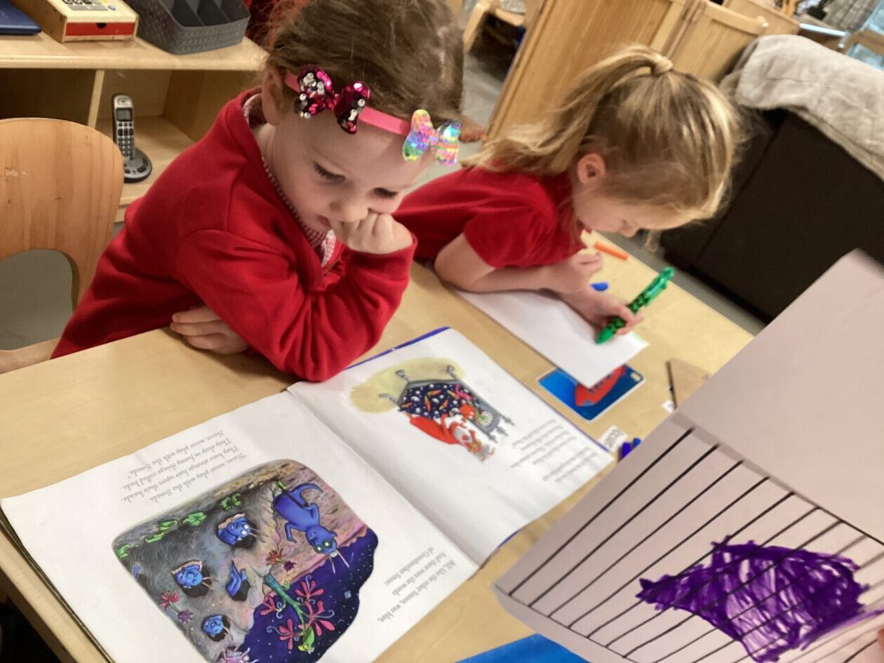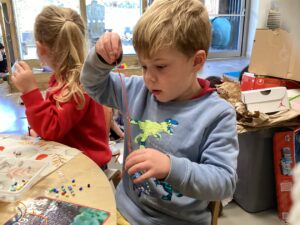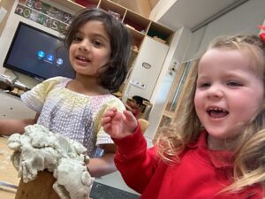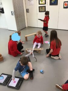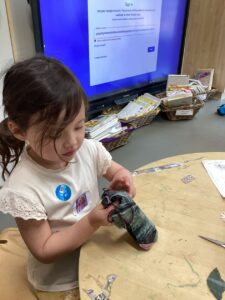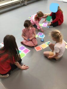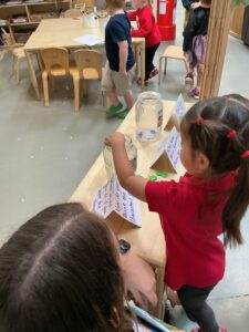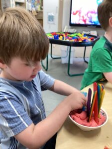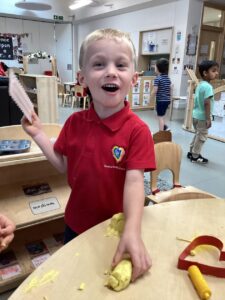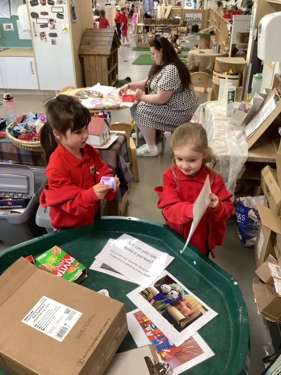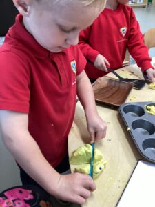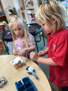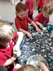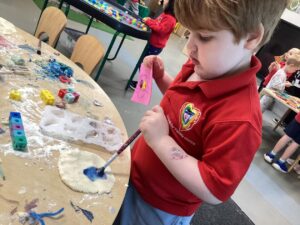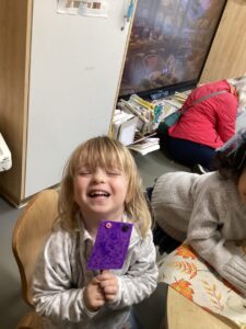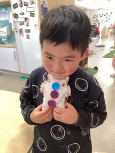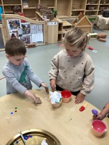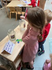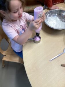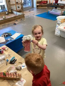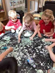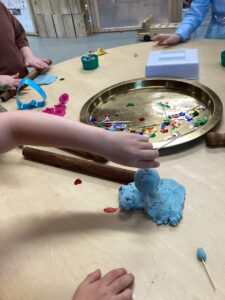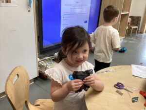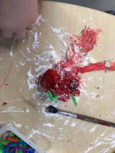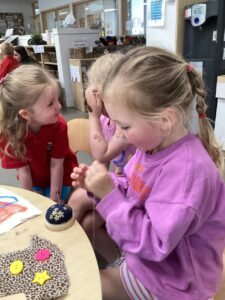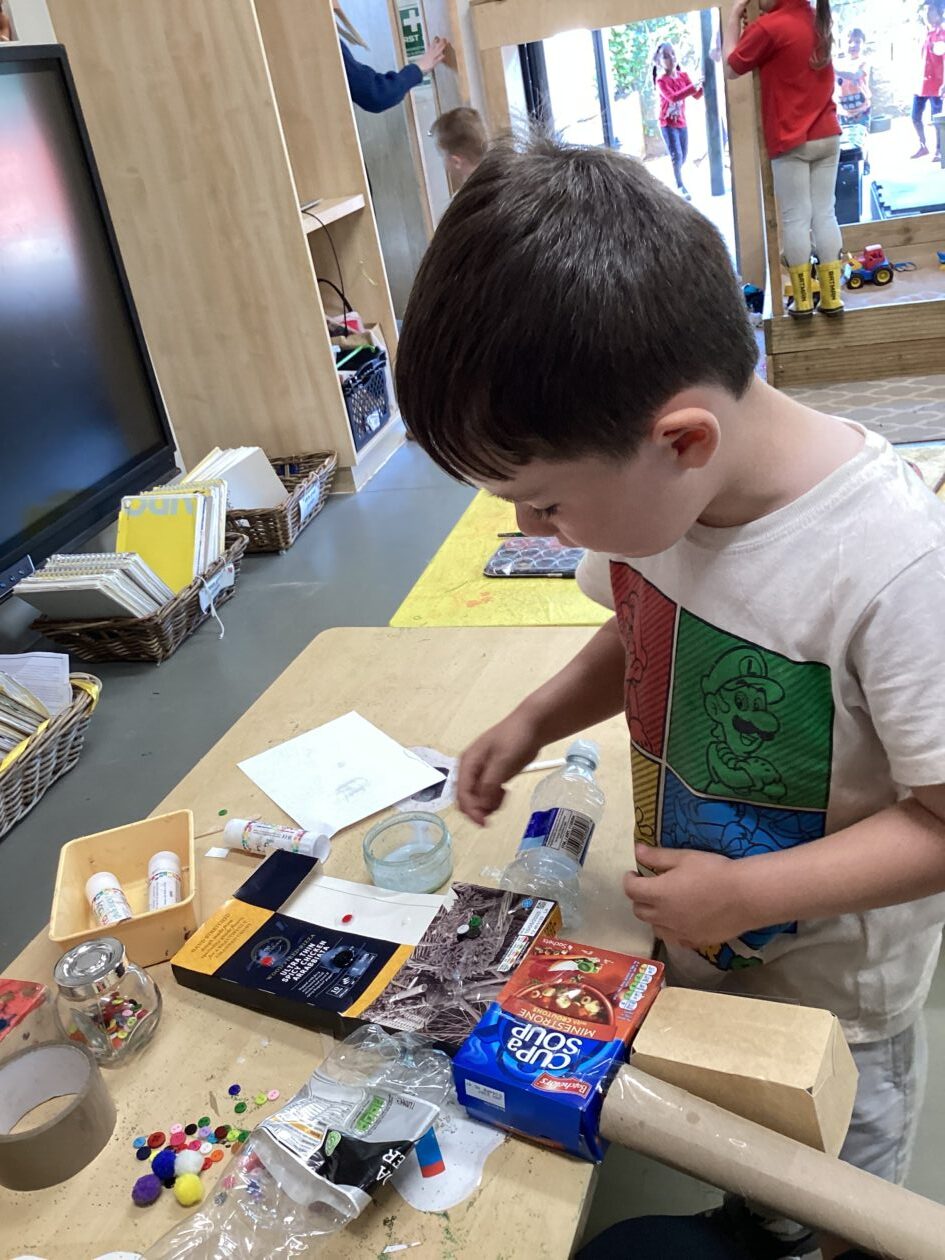 This week the children have been reading The Smeds and The Smoos. They decided to  make a batch of blue playdough, a batch of red playdough and then got creative with some loose parts, making their very own Smeds and Smoos. Some of the children even made some of their own aliens “mine’s called wiggly tickly wiggly” AY