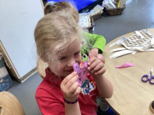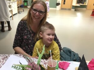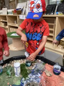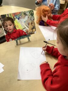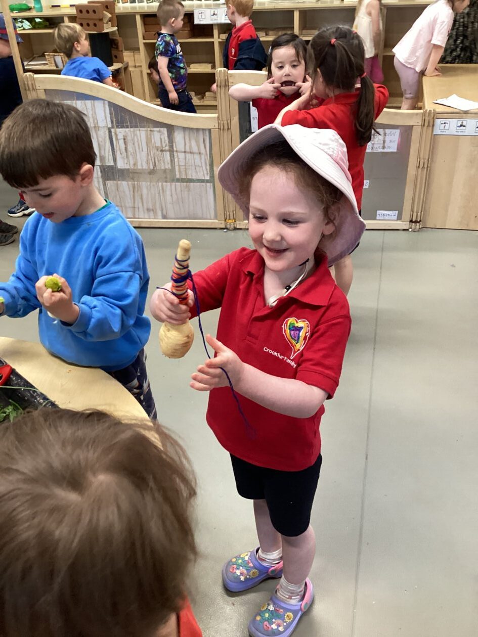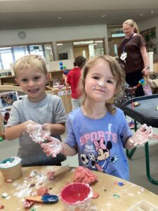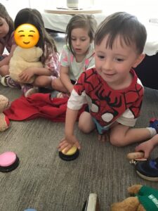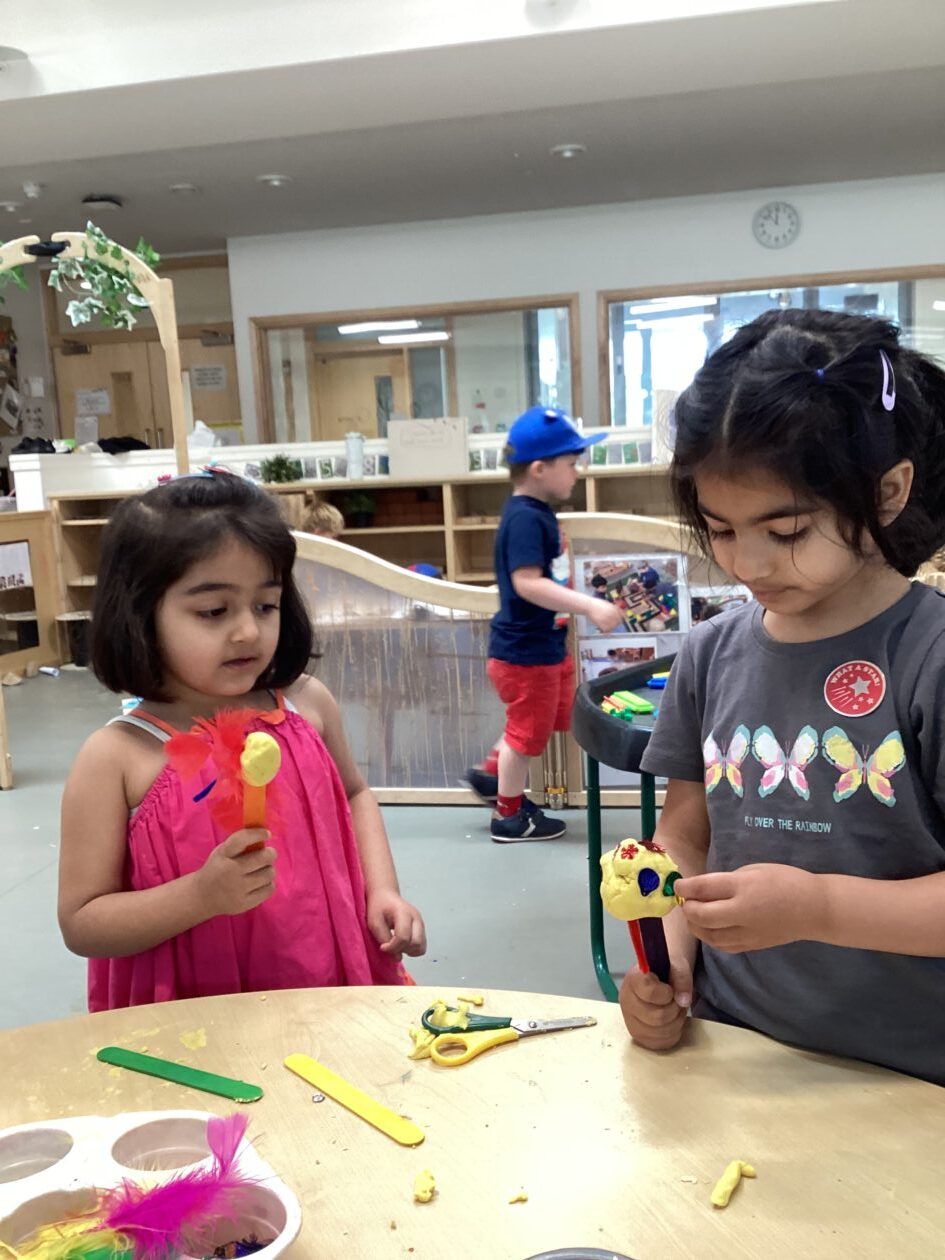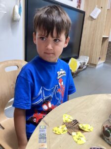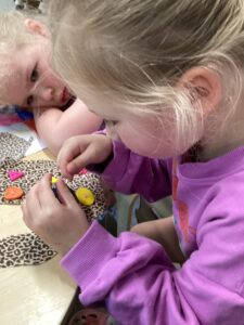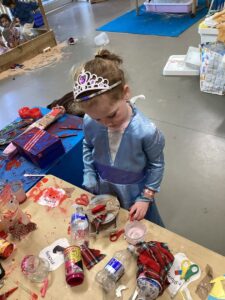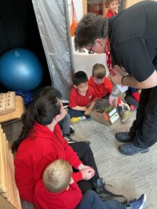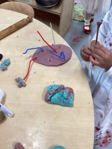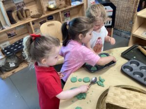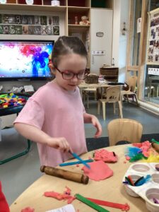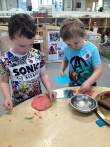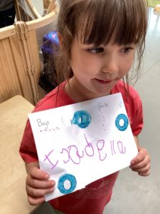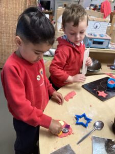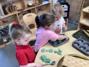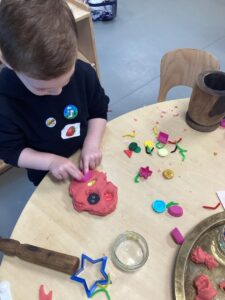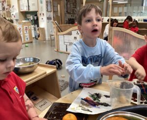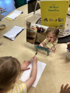 This week the children have been reading The Smeds and The Smoos. They decided to  make a batch of blue playdough, a batch of red playdough and then got creative with some loose parts, making their very own Smeds and Smoos. Some of the children even made some of their own aliens “mine’s called wiggly tickly wiggly” AY