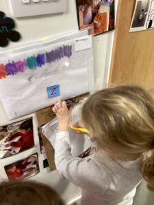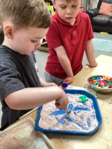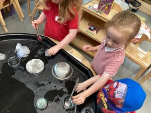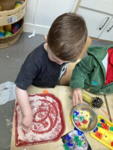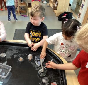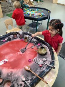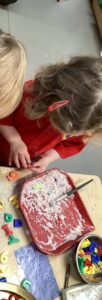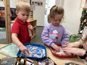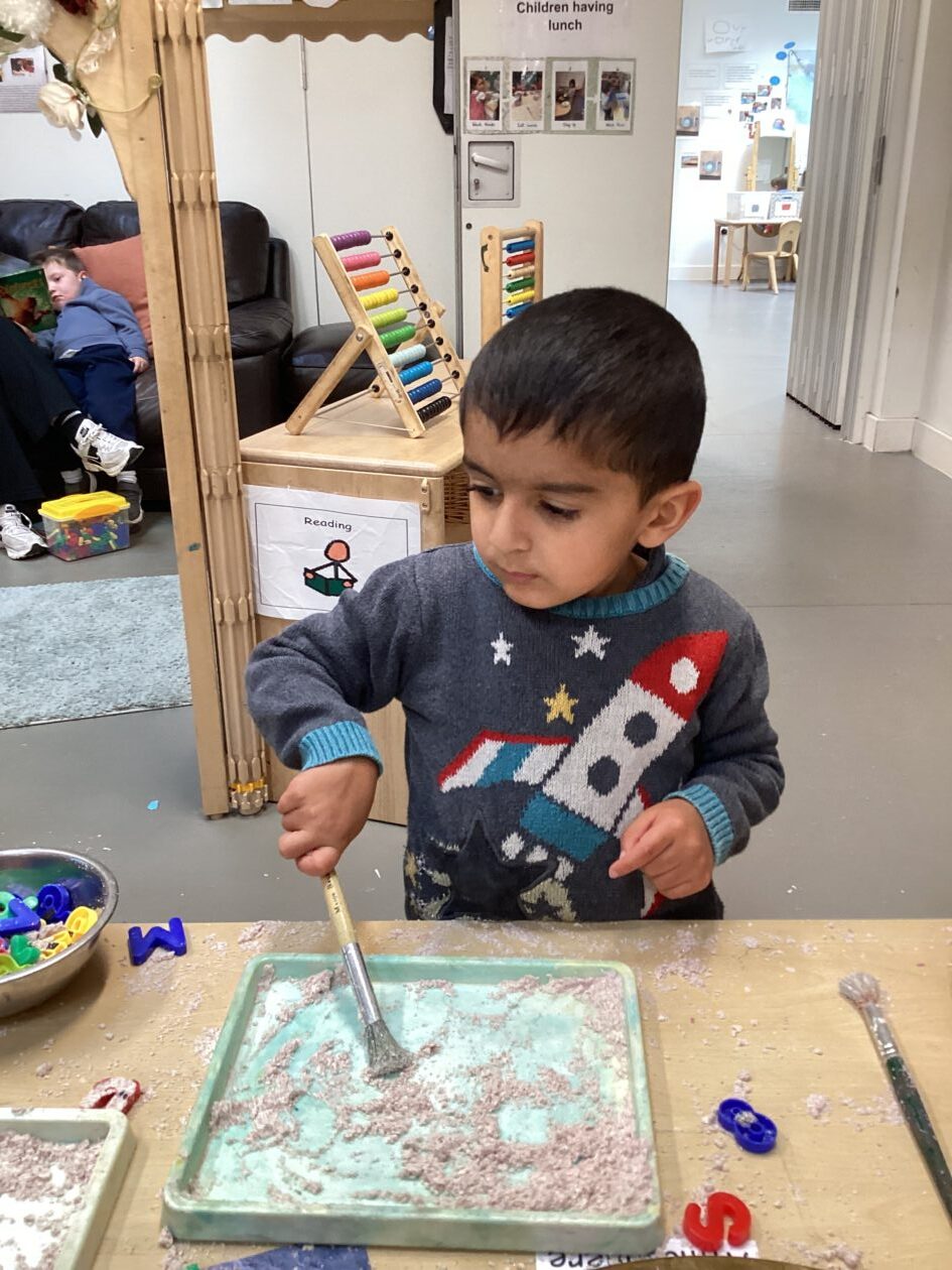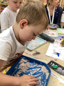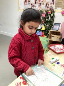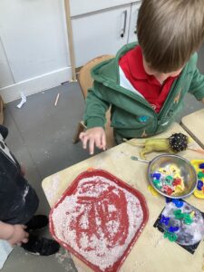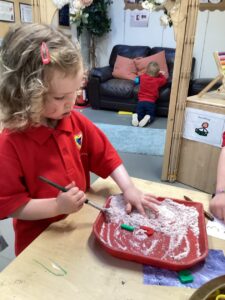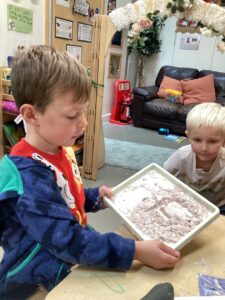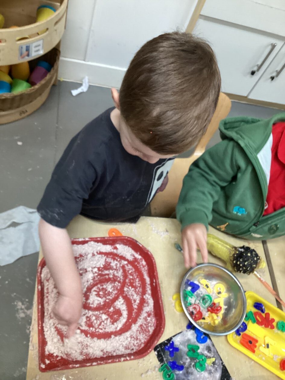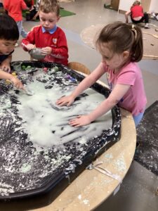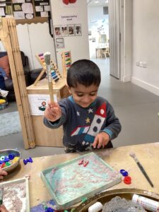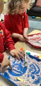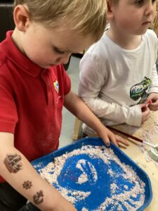 This week in the literacy area the children have continued to show an interest in space. The children were excited to discover that their ladies and Mr McIntosh had taken a trip to the moon and brought back some special moon dust for them to explore. The children engaged in a sensory exploration of the materials they used their fingers and brushes to create their marks. The children attempted to replicate upper and lower case letters, shapes, patterns, and numbers and some of  learners were able to differentiate between the letters and numbers and even match the ‘mummy letters’ with the ‘baby’ letters.
