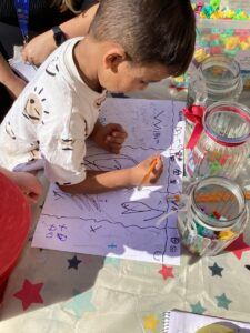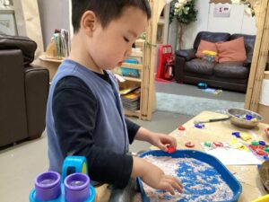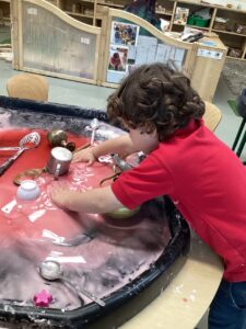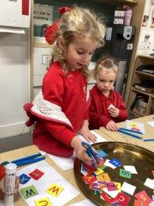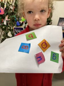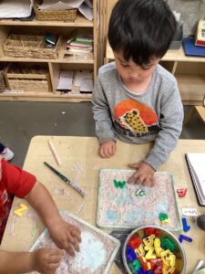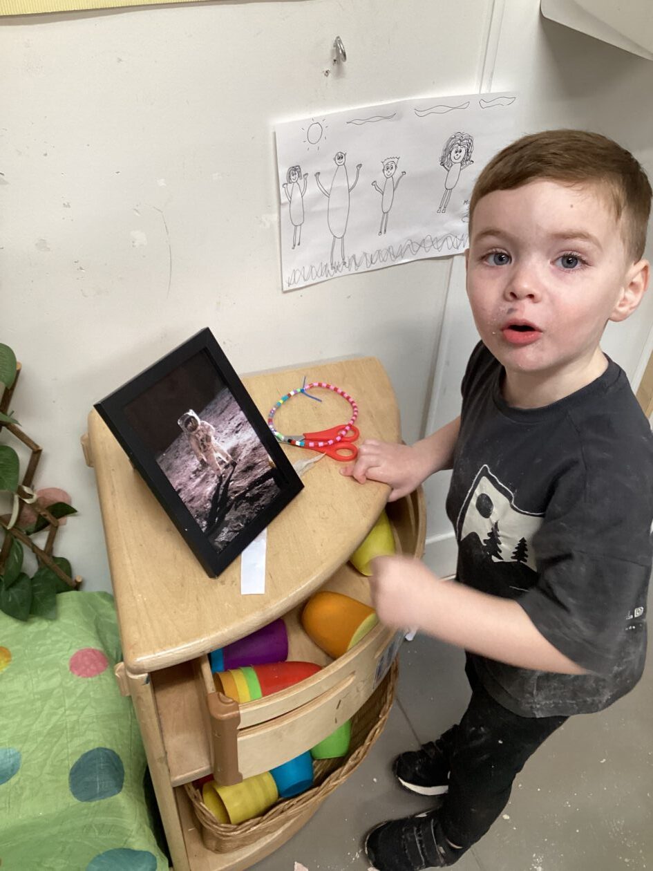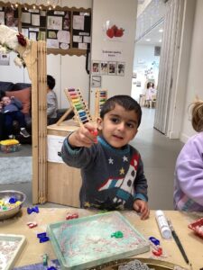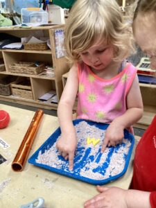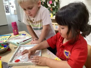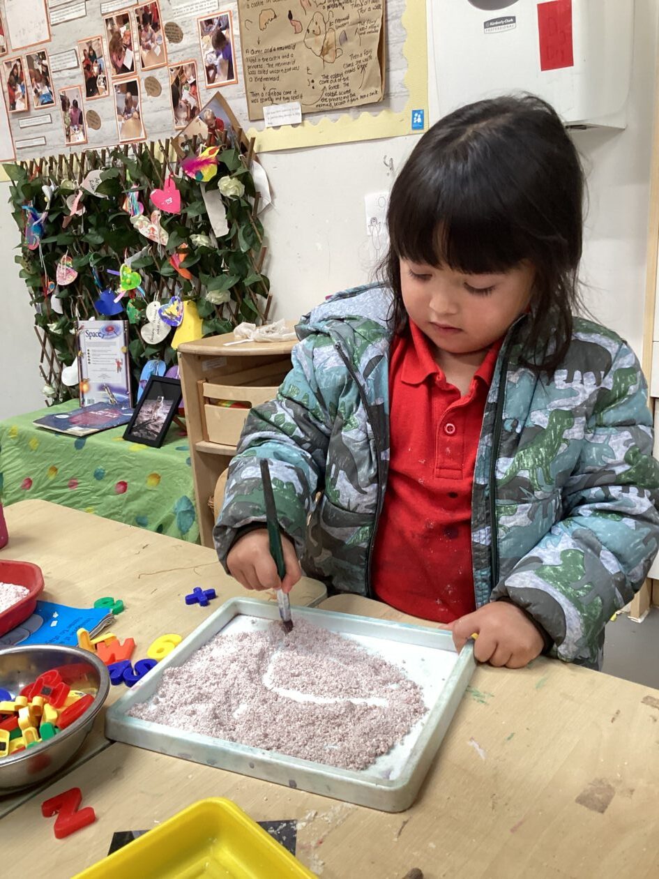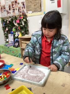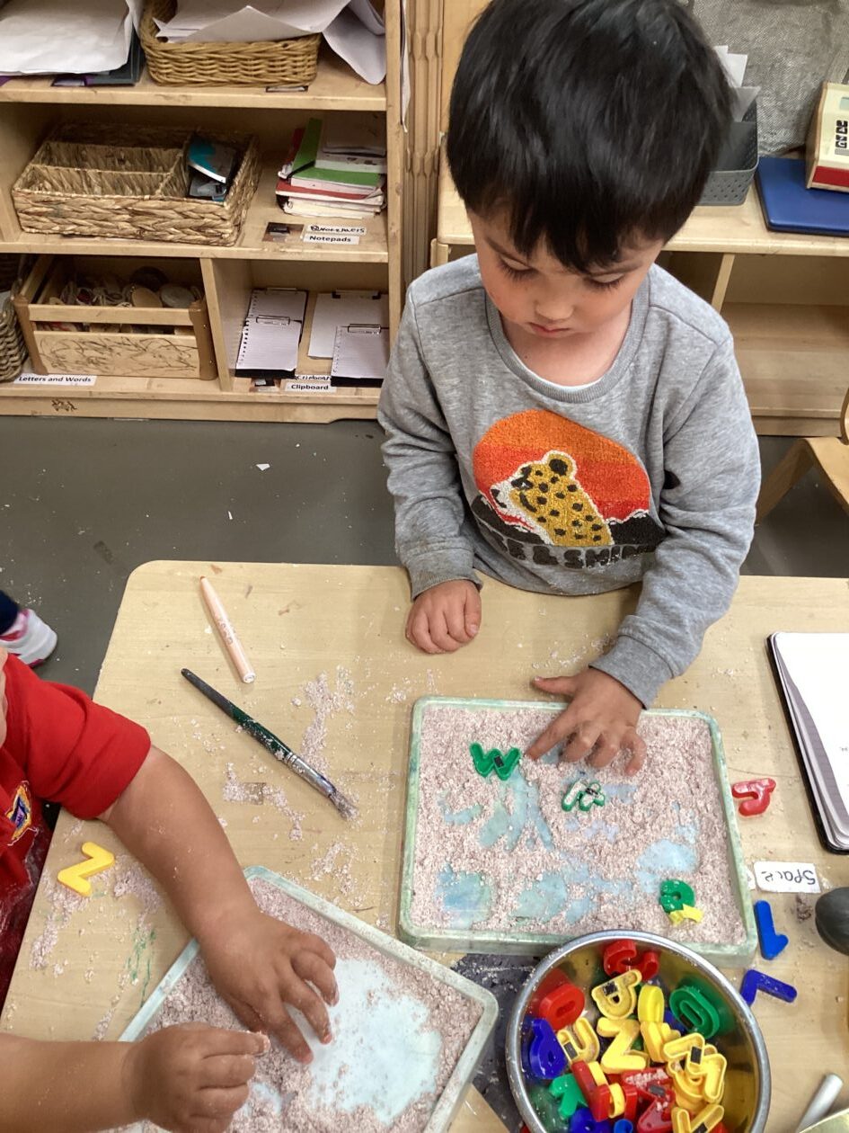 This week in the literacy area the children have continued to show an interest in space. The children were excited to discover that their ladies and Mr McIntosh had taken a trip to the moon and brought back some special moon dust for them to explore. The children engaged in a sensory exploration of the materials they used their fingers and brushes to create their marks. The children attempted to replicate upper and lower case letters, shapes, patterns, and numbers and some of  learners were able to differentiate between the letters and numbers and even match the ‘mummy letters’ with the ‘baby’ letters.