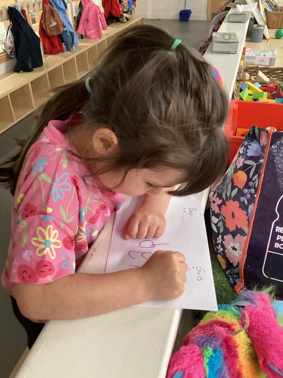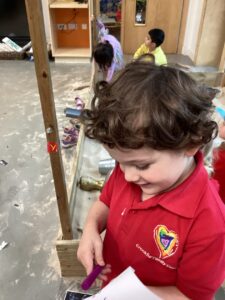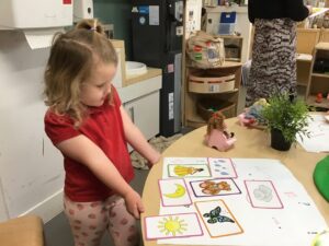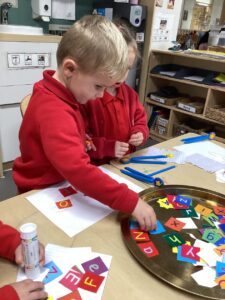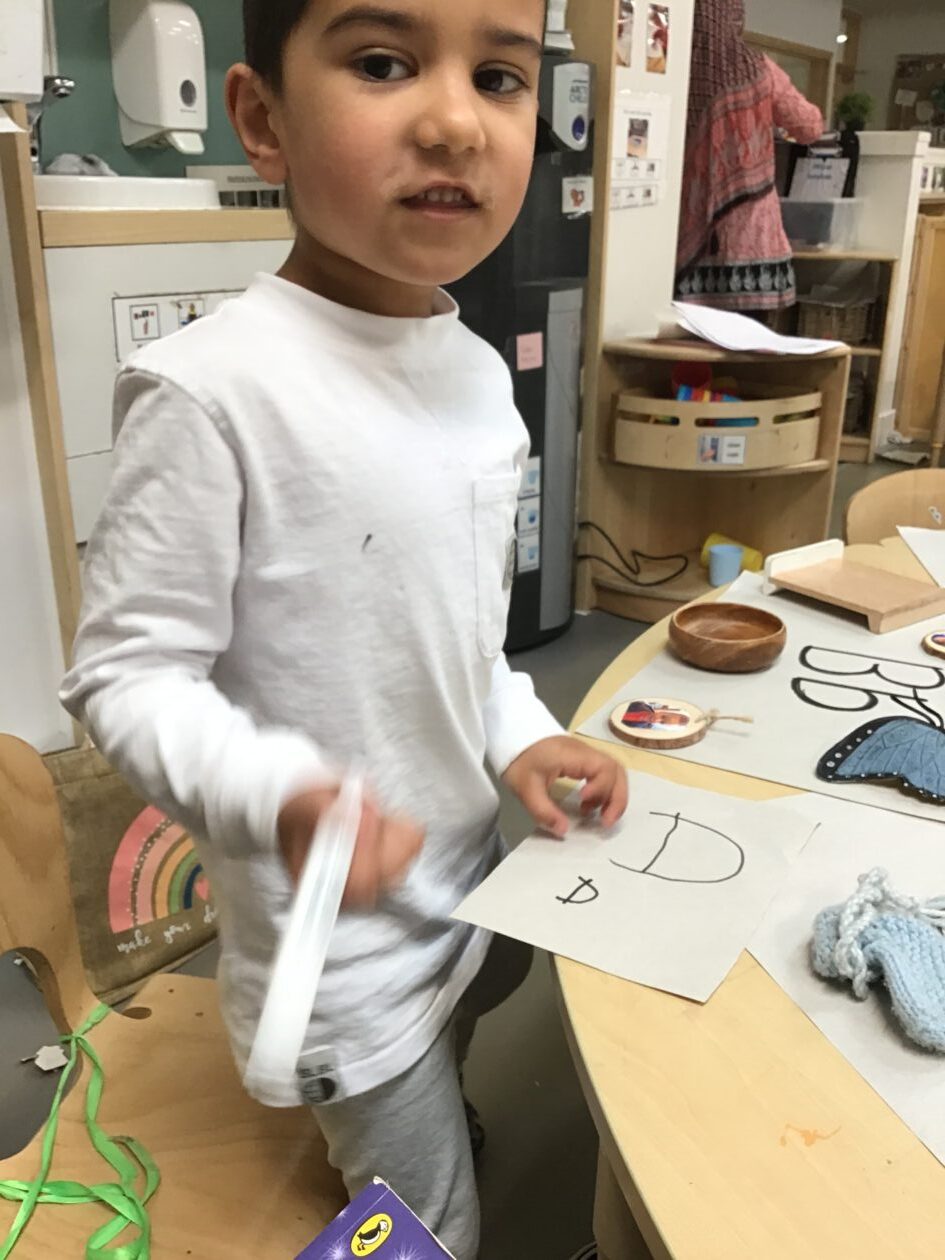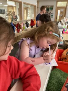 This week in the literacy area the children have been exploring letters of the alphabet.They continued to match their upper case letters and their case lower case letters (big letters to baby letters). The children also went on a letter hunt around the playroom and the garden and made positive attempts within their mark making to replicate the letters that they found developing their letter formation.