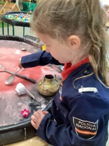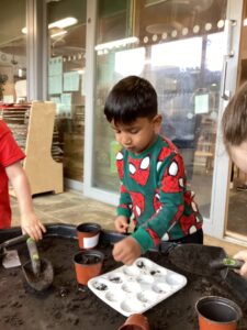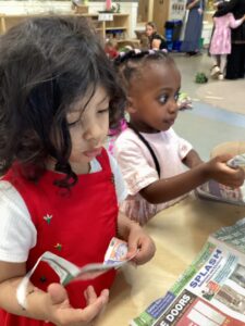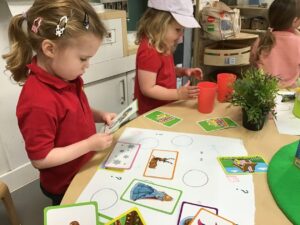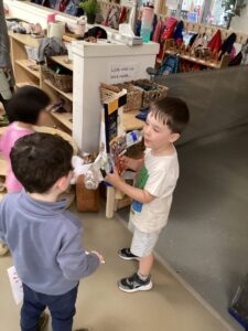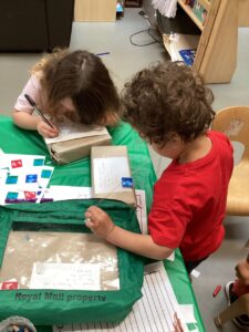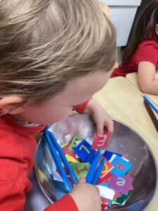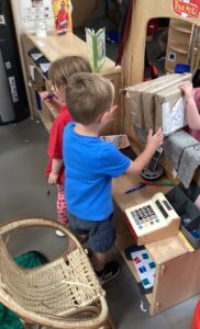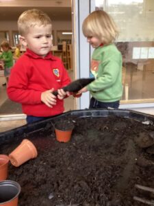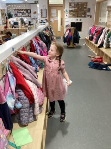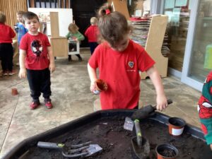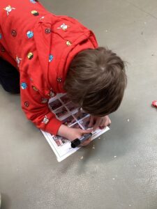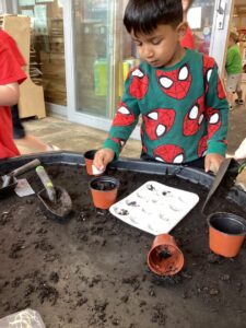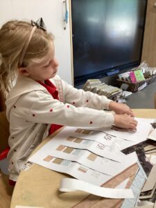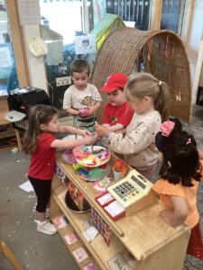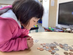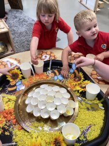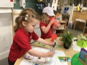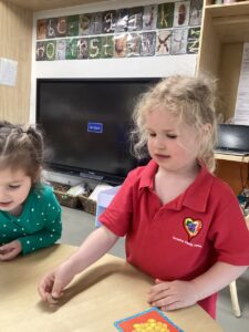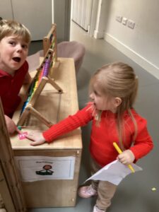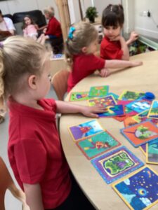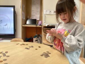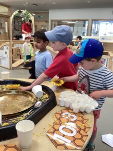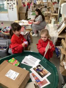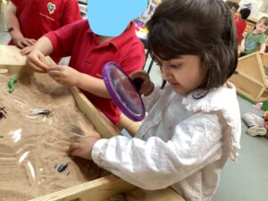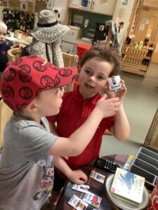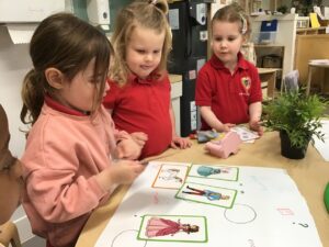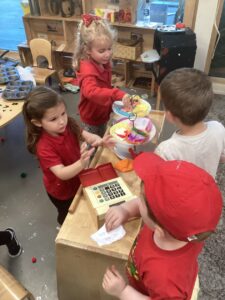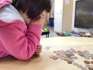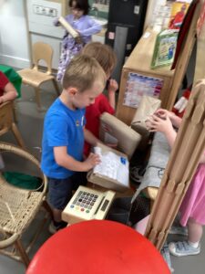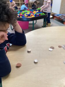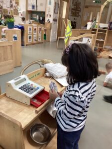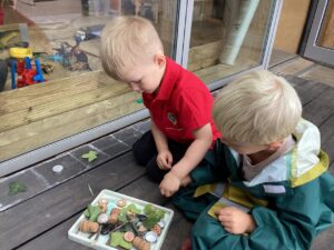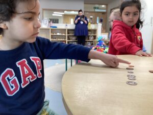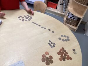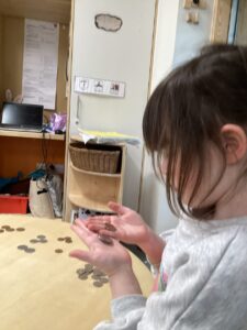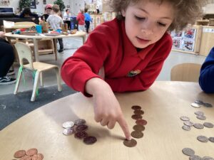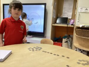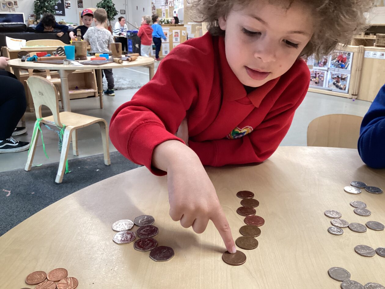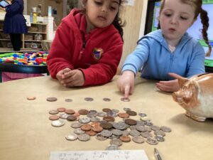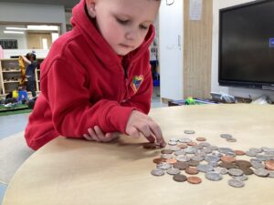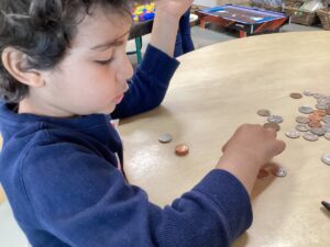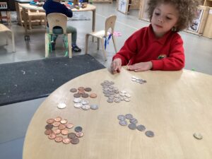 The children are beginning to look at money and currency. The children started by sorting the money by size, shape and colour. The children counted the bundles of money but couldn’t count the multiple values of the coins. Some of the children also read the numbers on the coins to sort them, this resulted in some children finding out that there were some euro coins hidden in the money! They identified that they were the same shape and colour as the UK one pence and five pence.