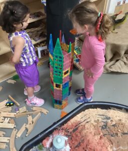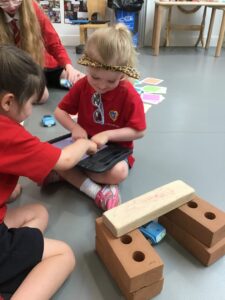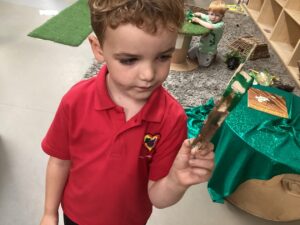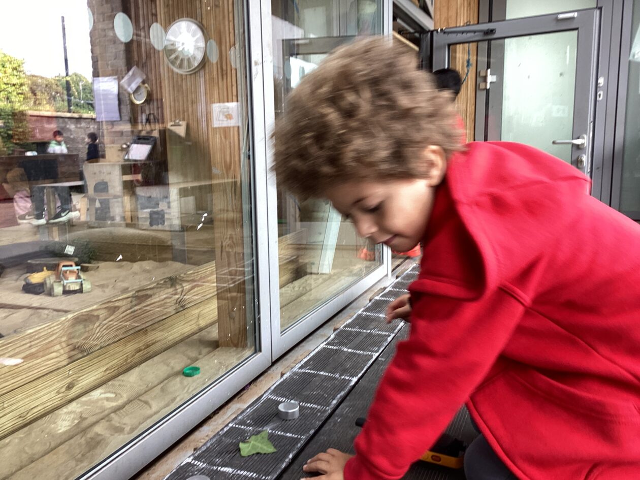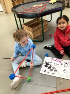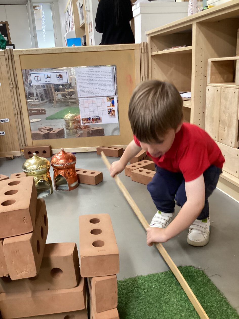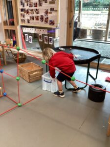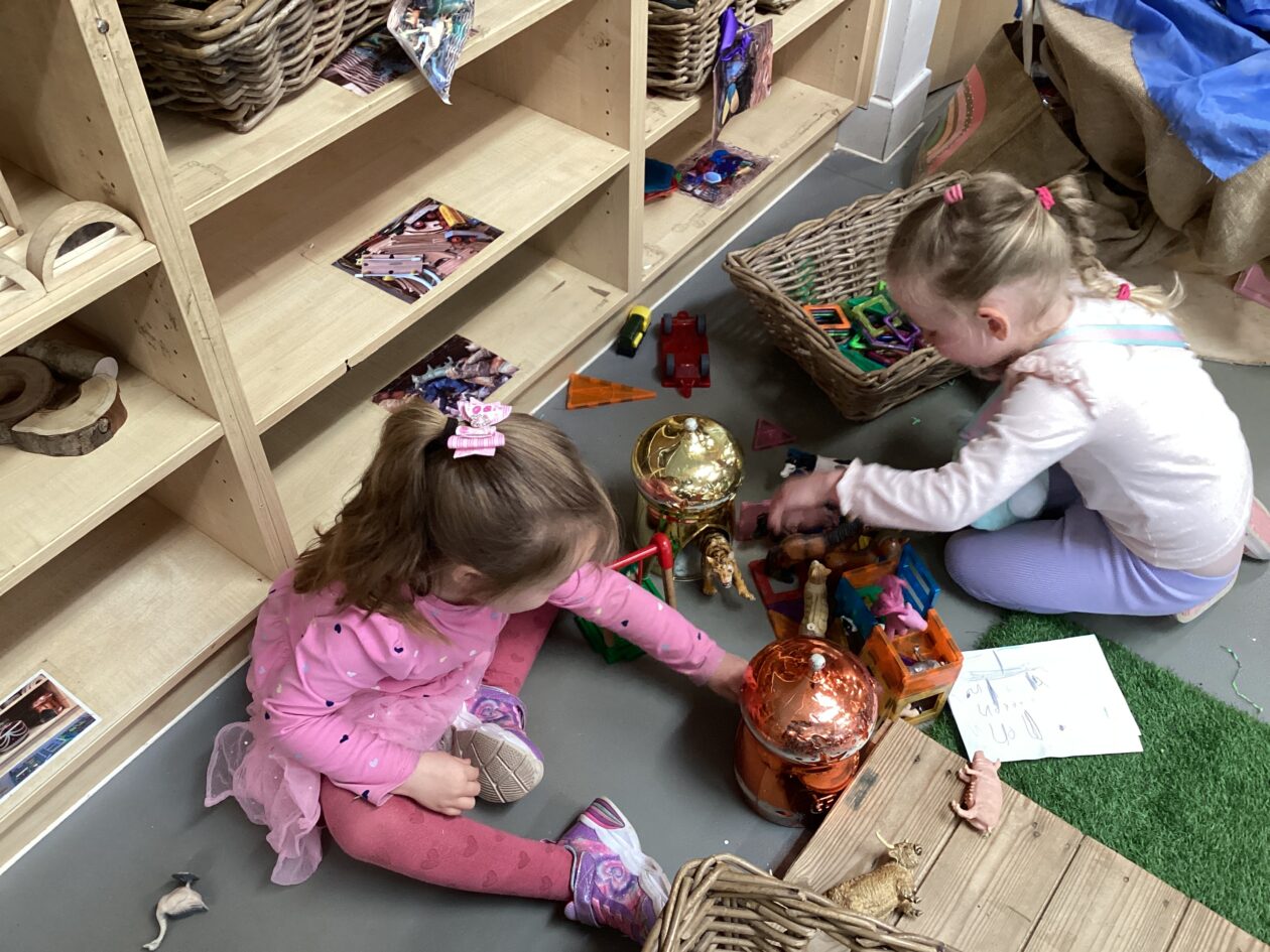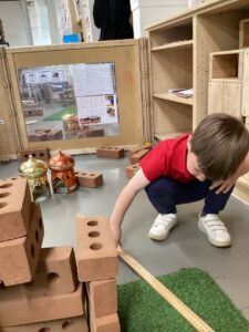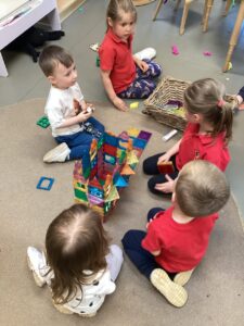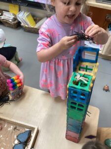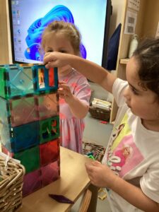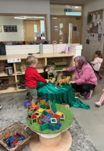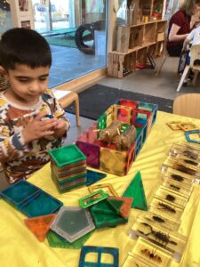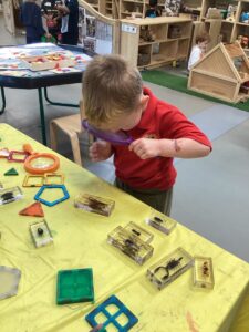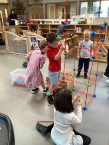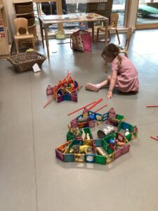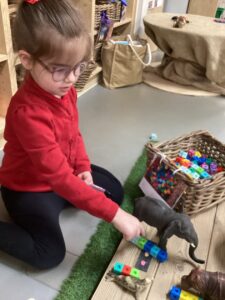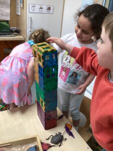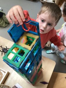 In our small world area this week the children have been further developing their measuring, designing and building skills. The children explored with small world and magnetic tiles, using the magnets to make creations to extend their play. Small world naturally encourages the creation of stories. Adding magnetic tiles allows children to build settings which will inspire deeper narratives. The children were experimenting with building stable structures using magnetic tiles and then spent time figuring out how these interact with the small world characters!