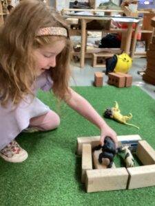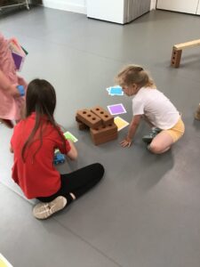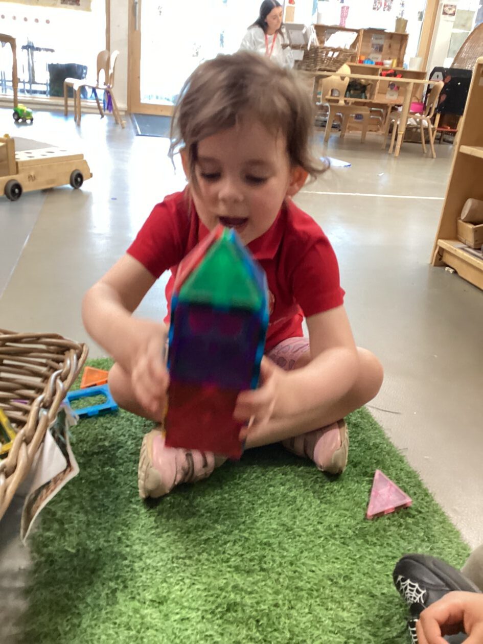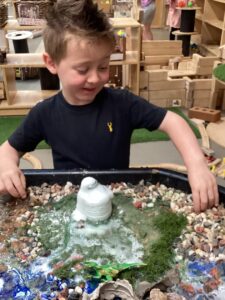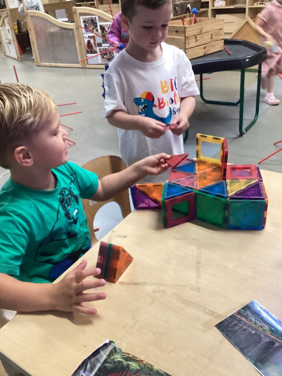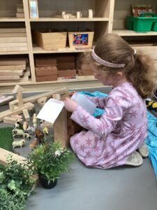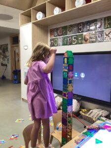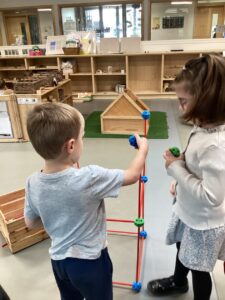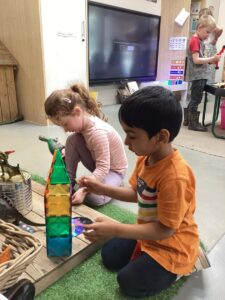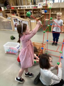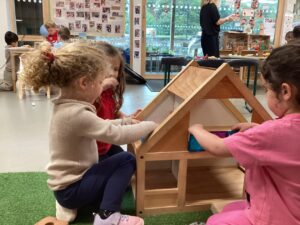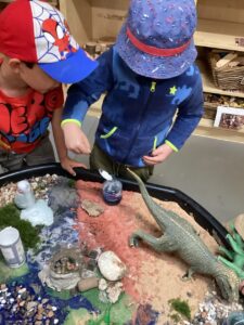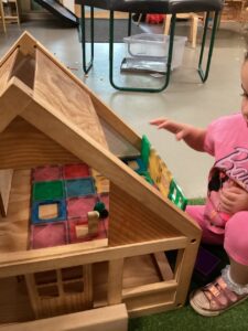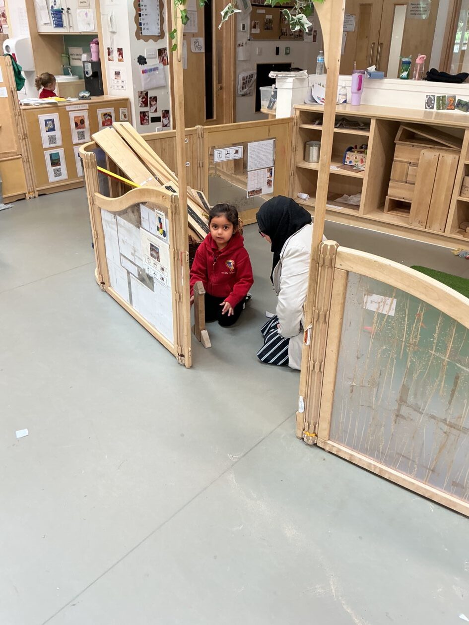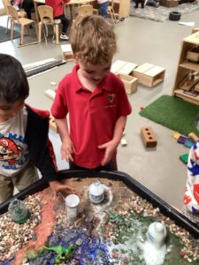 In our small world area this week the children have been further developing their measuring, designing and building skills. The children explored with small world and magnetic tiles, using the magnets to make creations to extend their play. Small world naturally encourages the creation of stories. Adding magnetic tiles allows children to build settings which will inspire deeper narratives. The children were experimenting with building stable structures using magnetic tiles and then spent time figuring out how these interact with the small world characters!