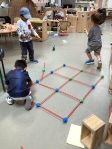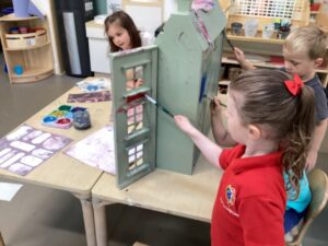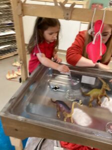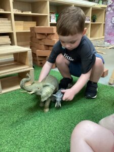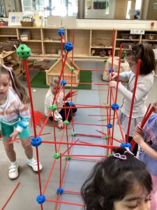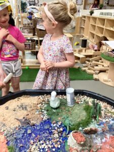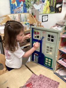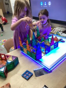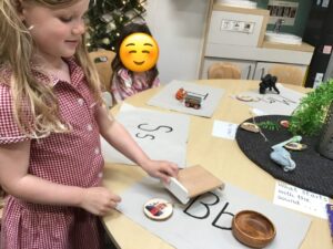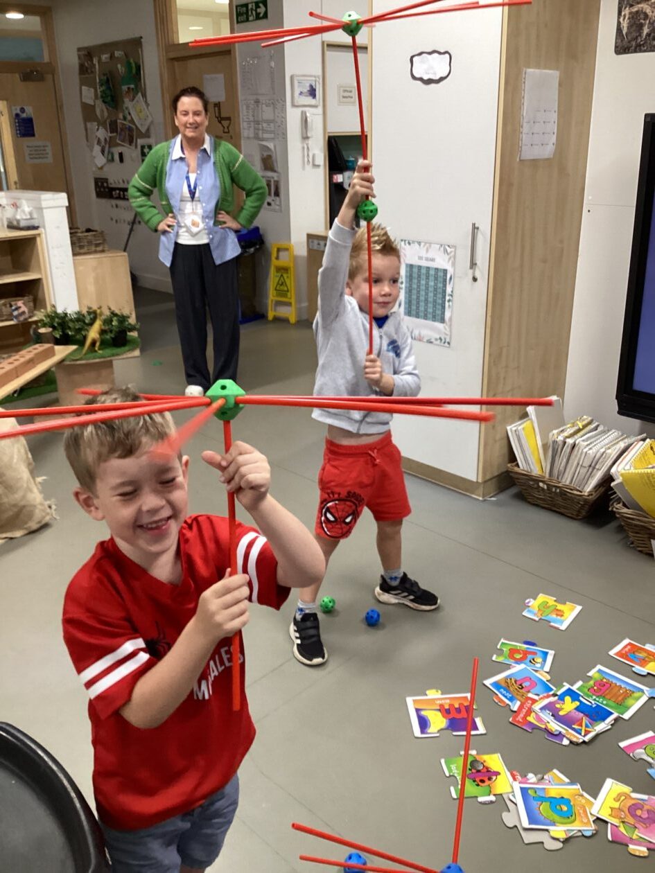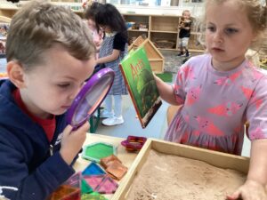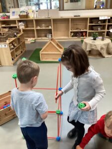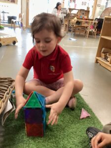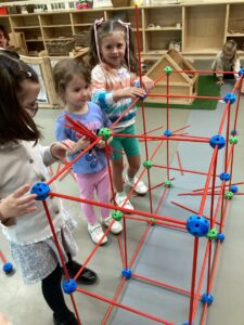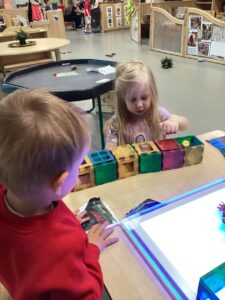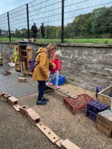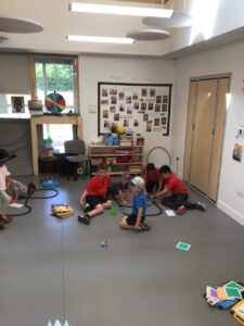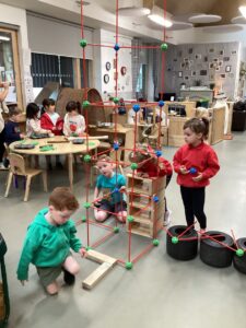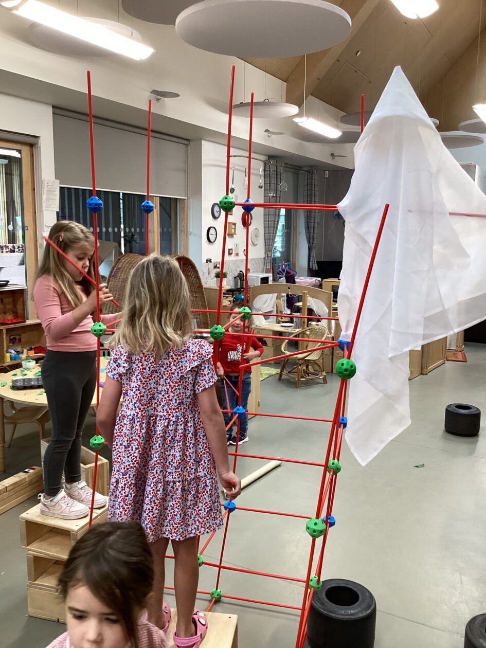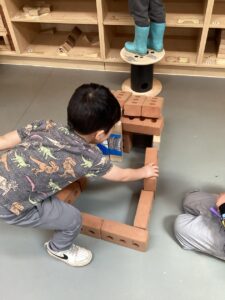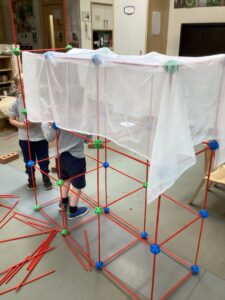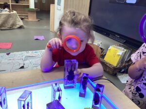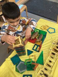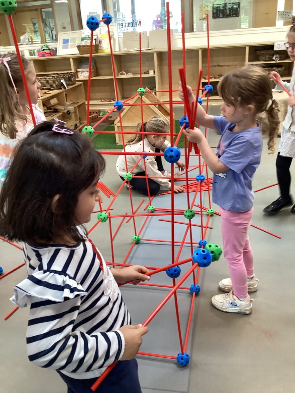 In our small world area this week the children have been further developing their measuring, designing and building skills. The children explored with small world and magnetic tiles, using the magnets to make creations to extend their play. Small world naturally encourages the creation of stories. Adding magnetic tiles allows children to build settings which will inspire deeper narratives. The children were experimenting with building stable structures using magnetic tiles and then spent time figuring out how these interact with the small world characters!