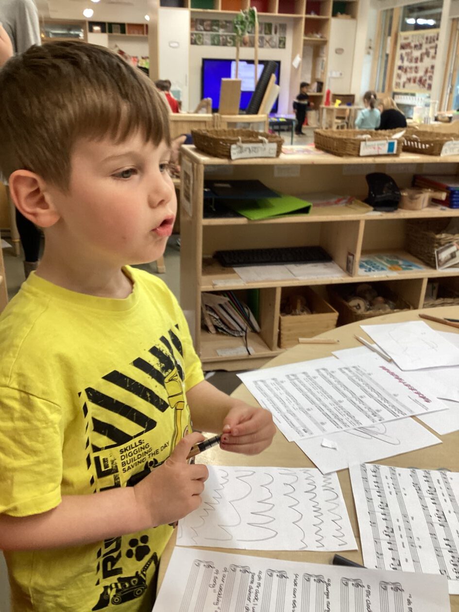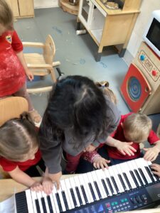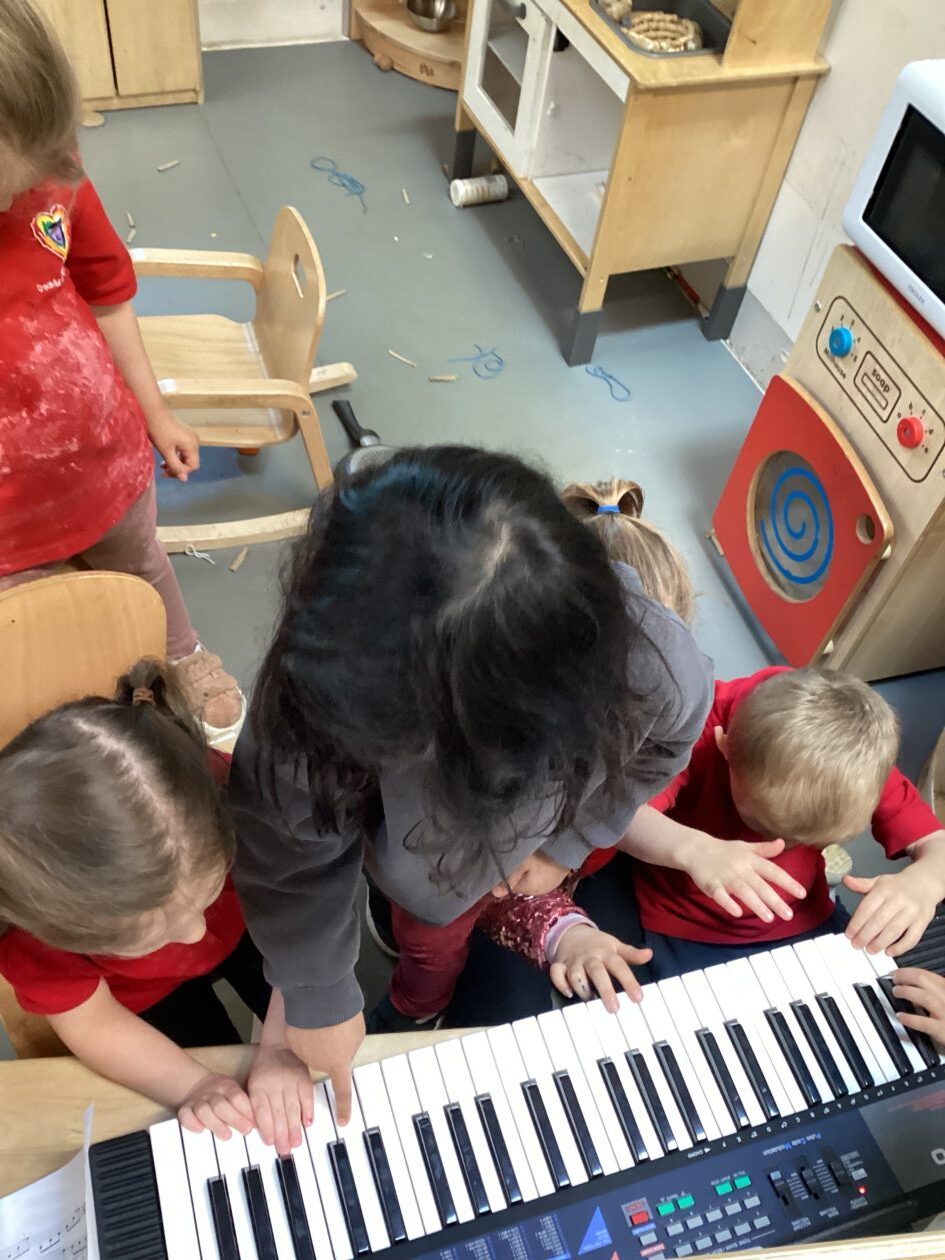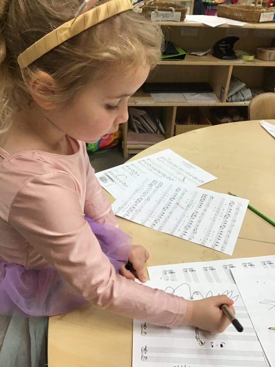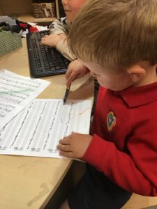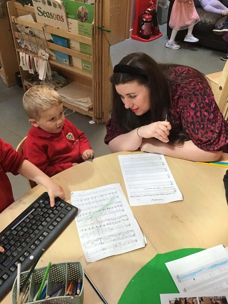 This week in the literacy area the children have been exploring storytelling through the medium of song. The children have shown their creativity and imagination through their lyrics and demonstrated excellent phonological awareness through generation of rhyme and awareness of syllables whilst creating their rhythm. The children even explored putting their words to music with the help of Miss Goldie and her keyboard. The children explored sheet music and made positive attempts to replicate the notes within their mark making.
