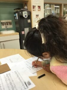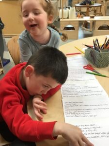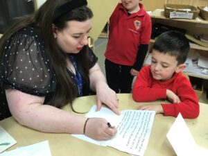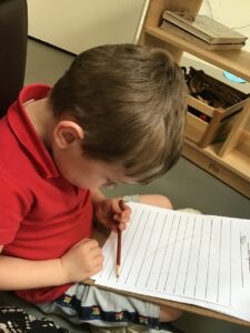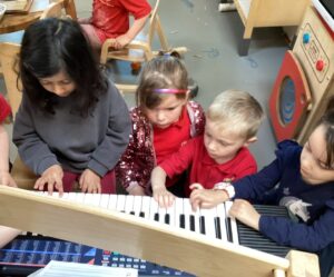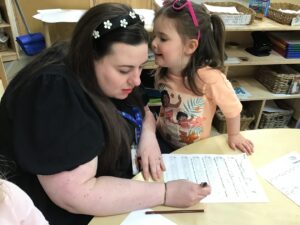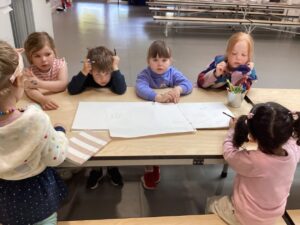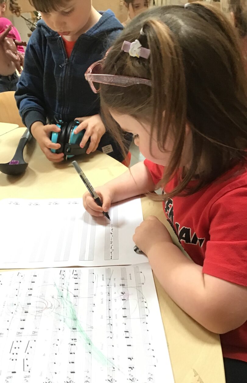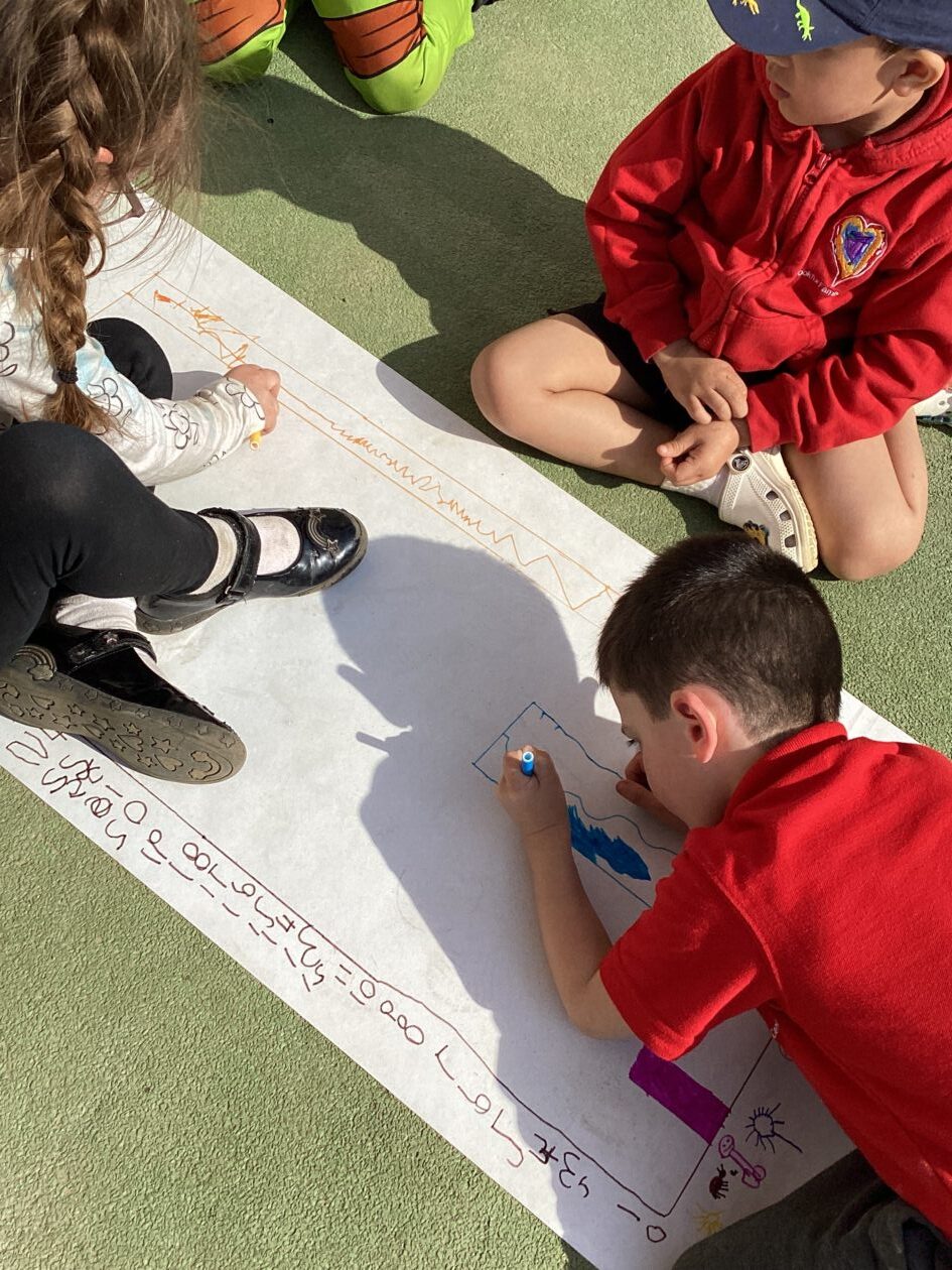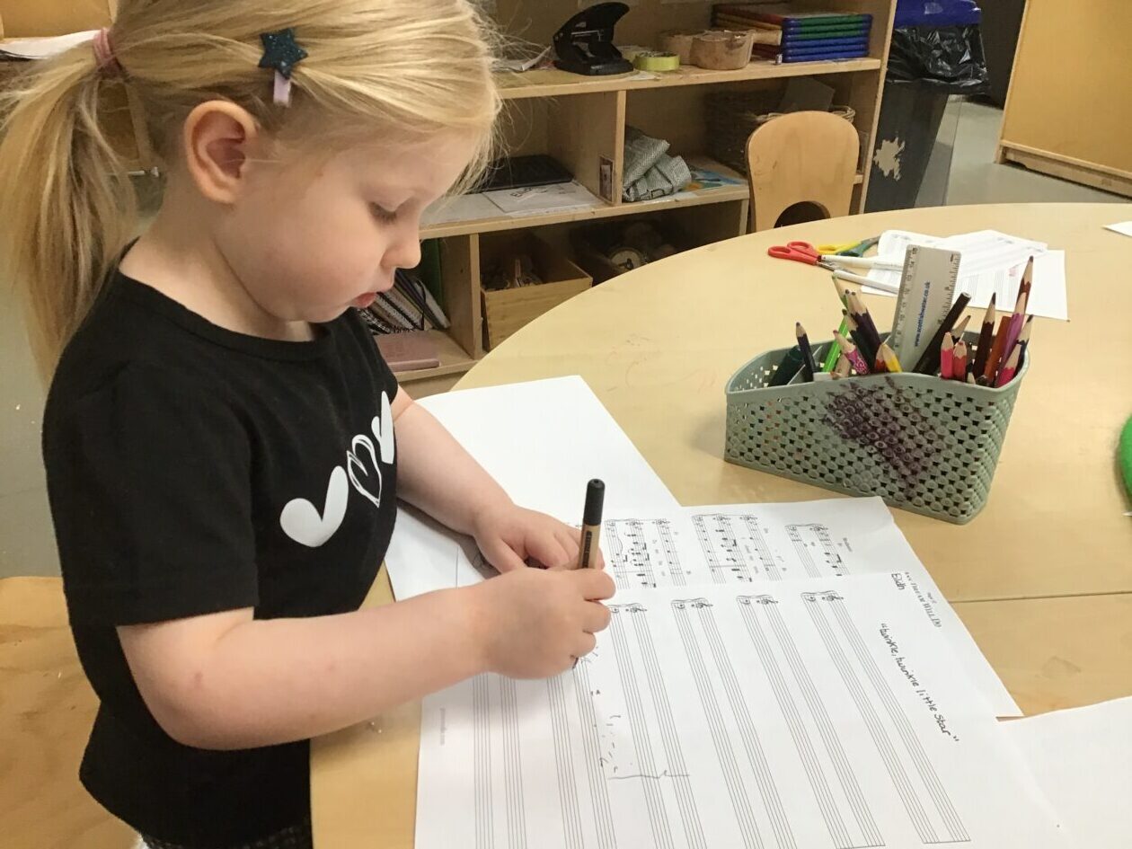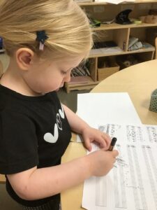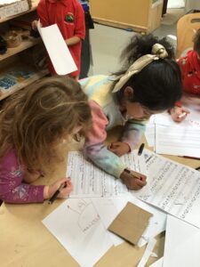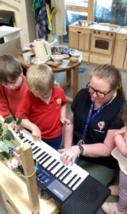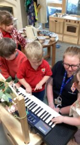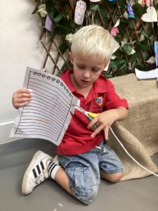 This week in the literacy area the children have been exploring storytelling through the medium of song. The children have shown their creativity and imagination through their lyrics and demonstrated excellent phonological awareness through generation of rhyme and awareness of syllables whilst creating their rhythm. The children even explored putting their words to music with the help of Miss Goldie and her keyboard. The children explored sheet music and made positive attempts to replicate the notes within their mark making.