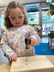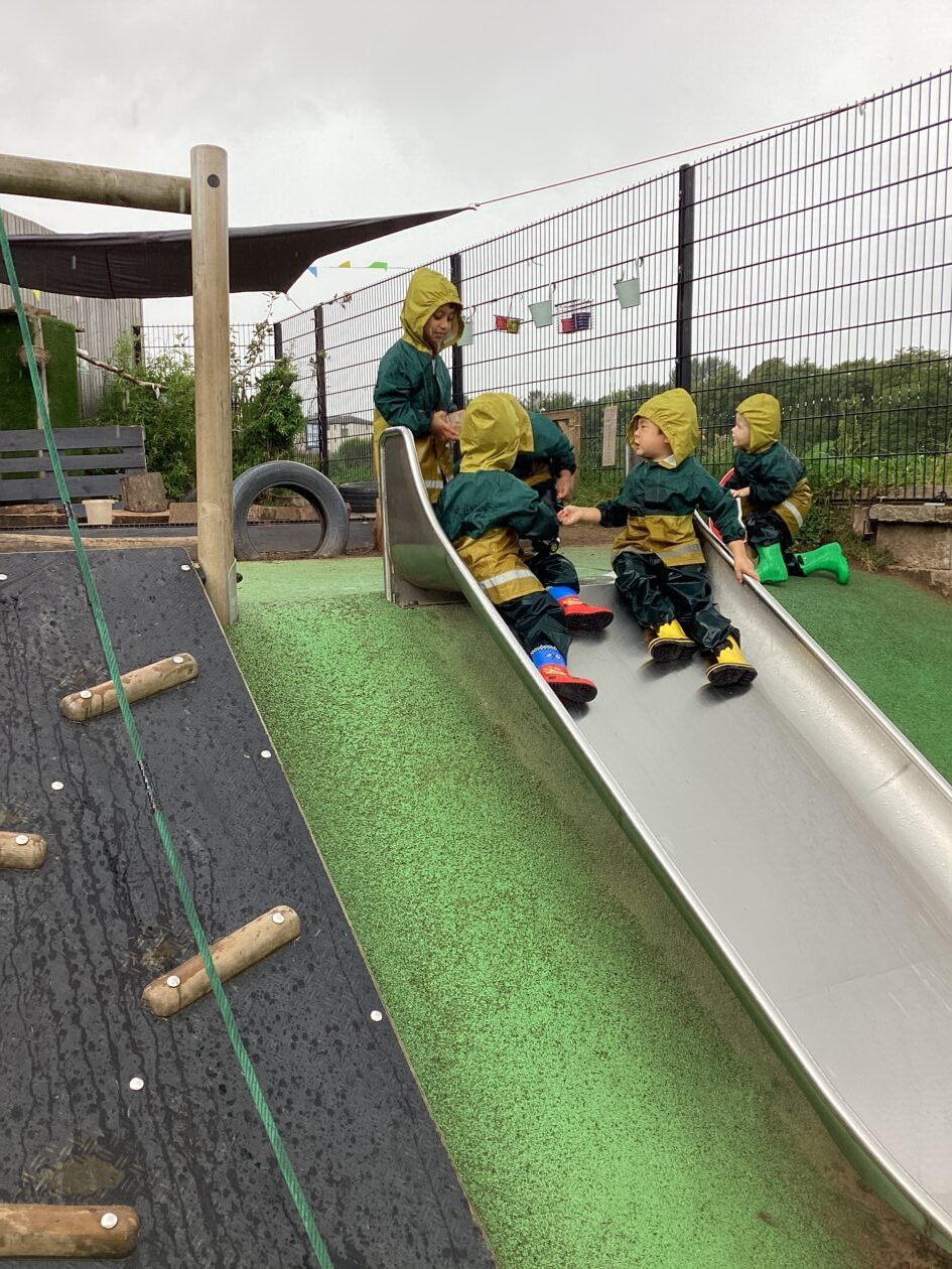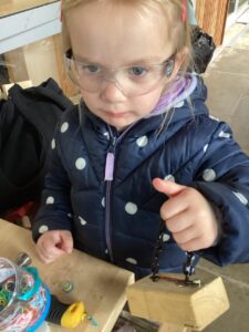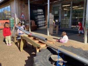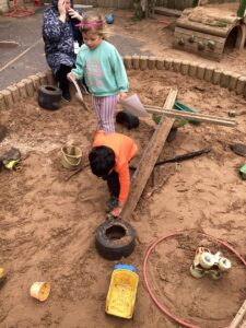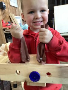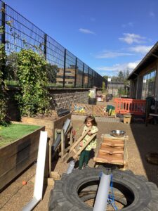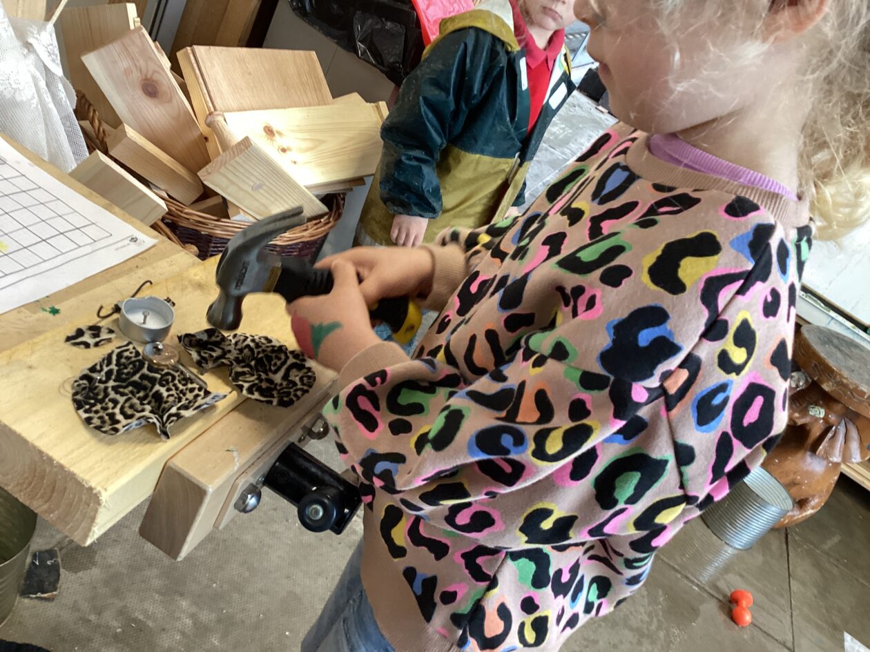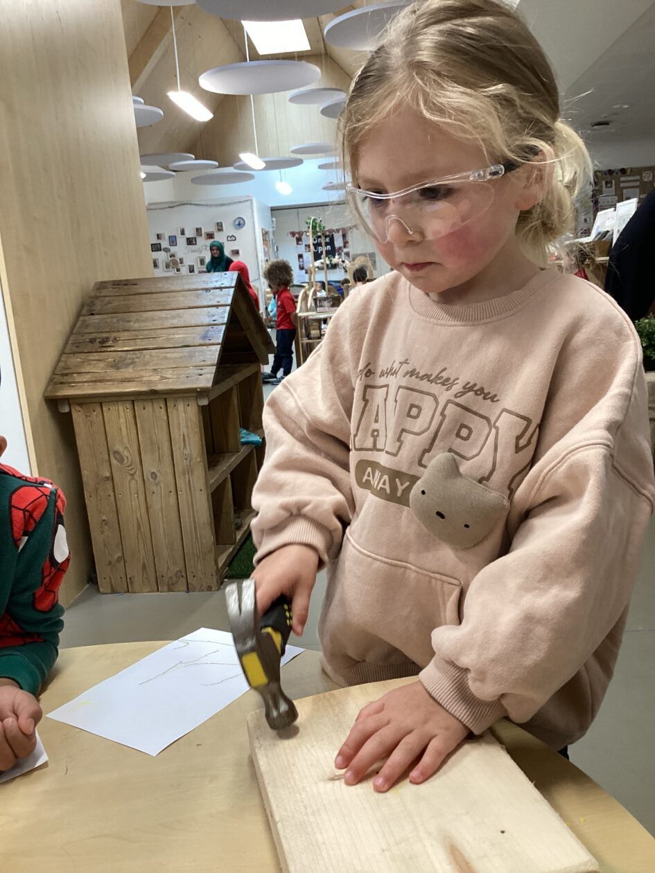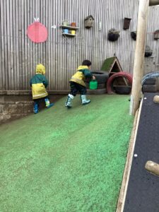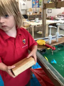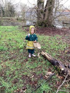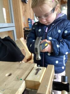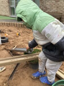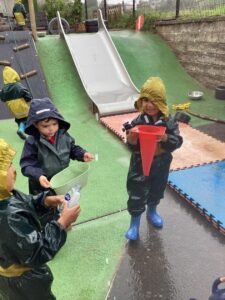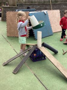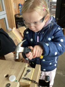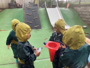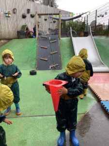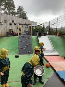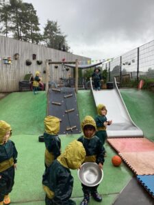 This week in our outdoor area we have embraced the very wet weather and made use of the learning opportunities rain brings! Even in the wet weather our children like to explore our outdoor area. The children have also been designing and creating at our woodwork bench in our outdoor classroom and you can see some of their wonderful creations below!