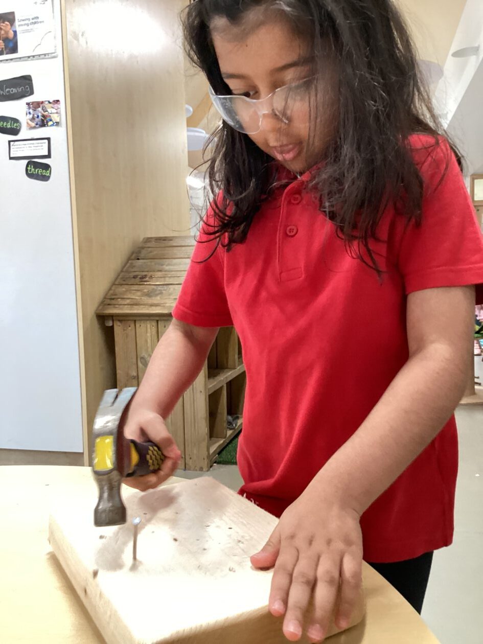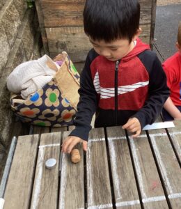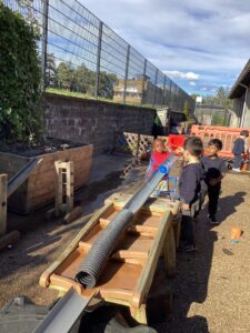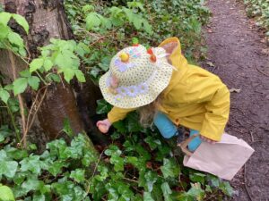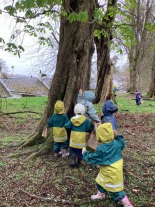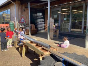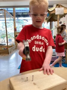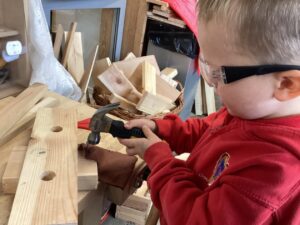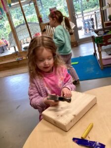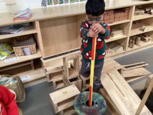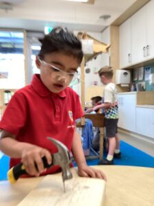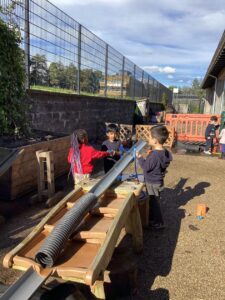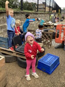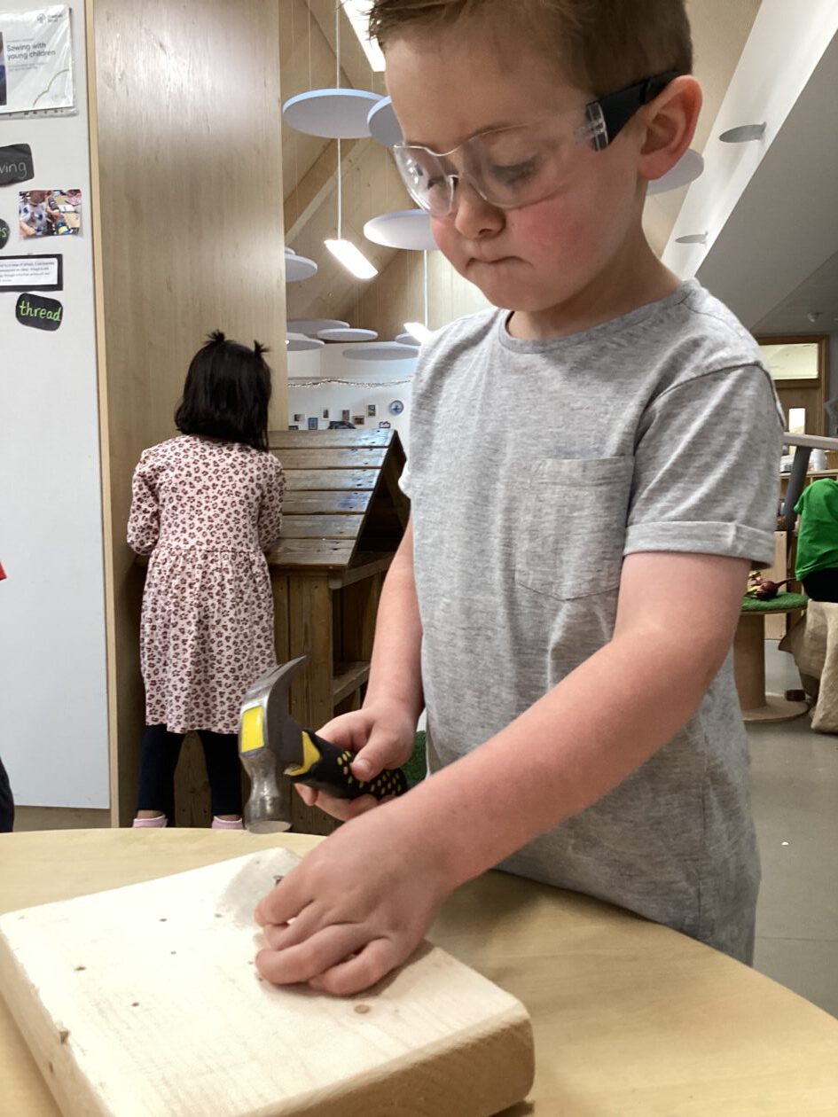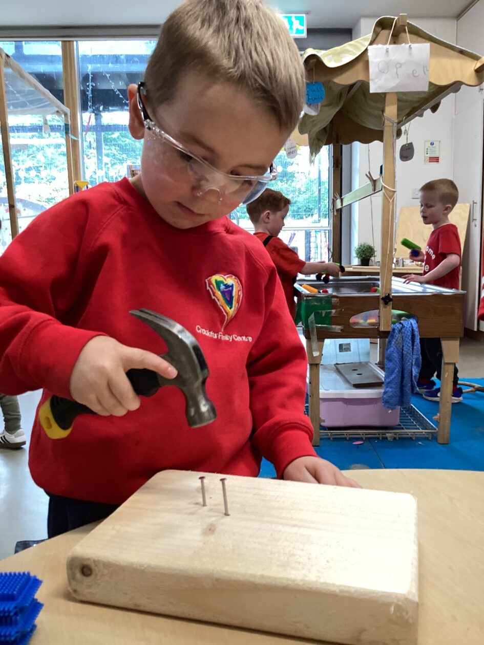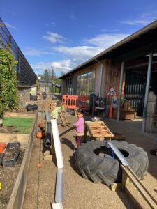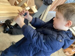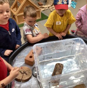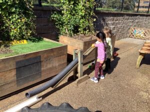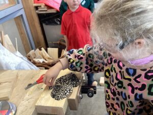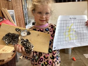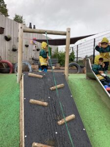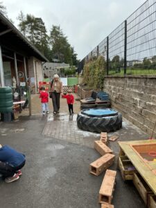 This week in our outdoor area we have embraced the very wet weather and made use of the learning opportunities rain brings! Even in the wet weather our children like to explore our outdoor area. The children have also been designing and creating at our woodwork bench in our outdoor classroom and you can see some of their wonderful creations below!