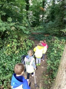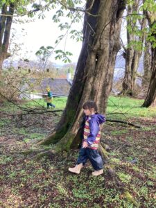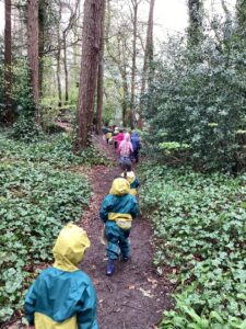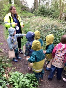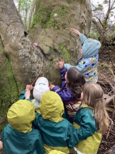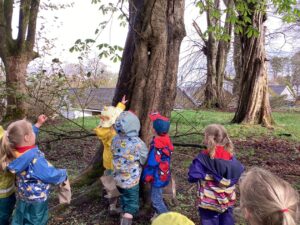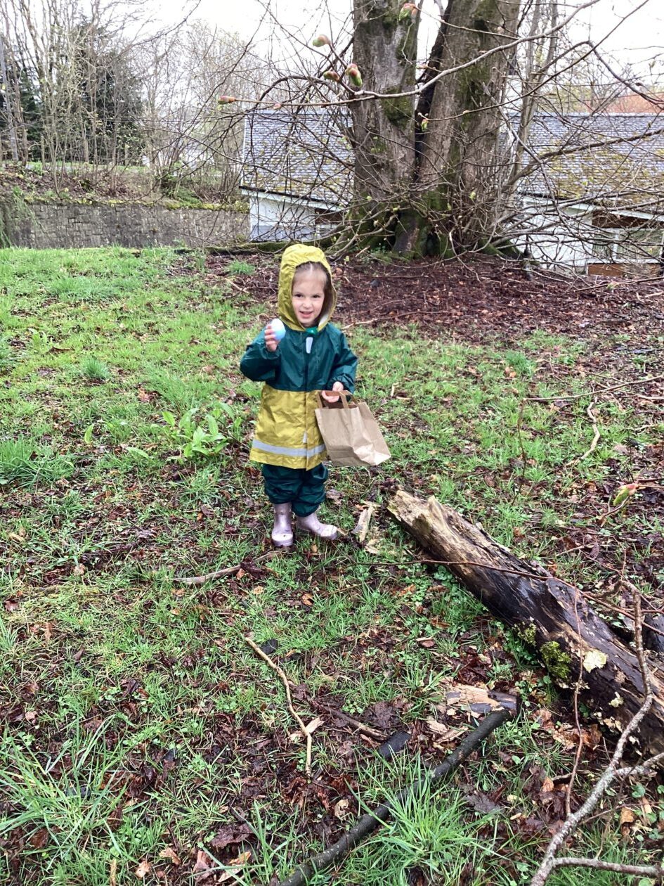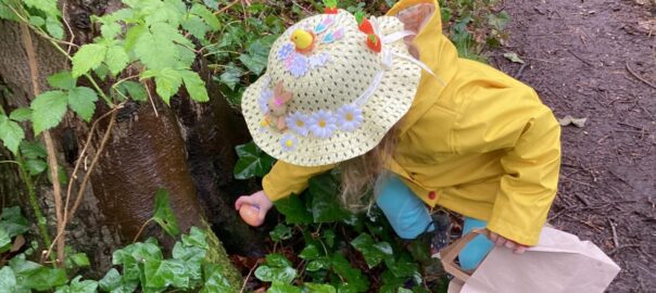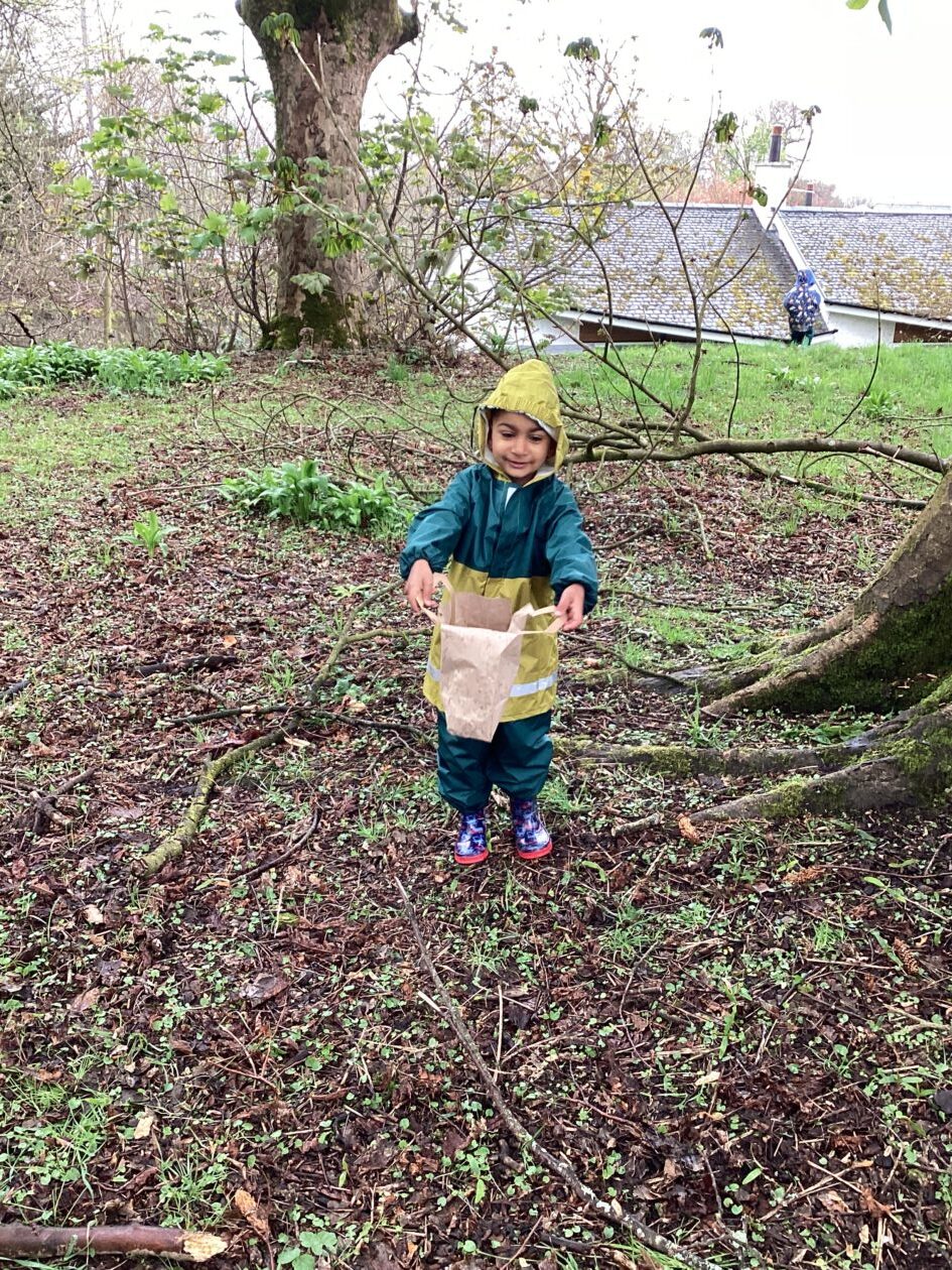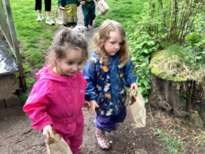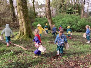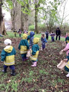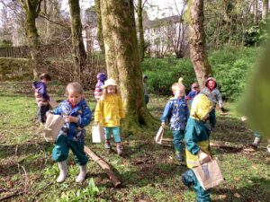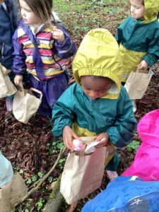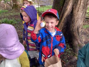 We then headed out on our Easter egg hunt in the woods! We looked up high and down low for coloured eggs as we followed the trail through the trees. There were 30 eggs to find and we managed to find them all as a team! At the end of the trail there was a special golden egg and once we found it we used great problem solving skills to figure out how to get it down from the tree. It was so much fun! We hope that everyone has a lovely Easter this weekend.