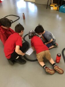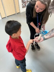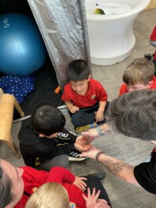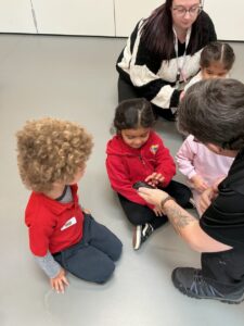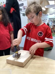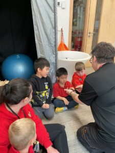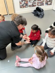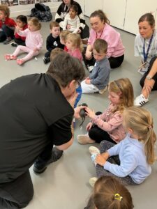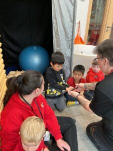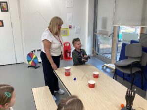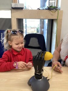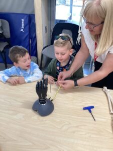 The myoelectric hand is multi-functional and the children worked together problem solving to coordinate movement, opening and closing the fingers to grip and place a ball into a container. There was lots of discussion around directional movement.