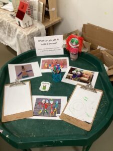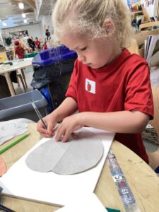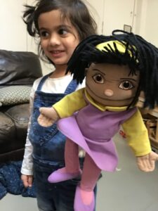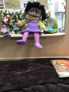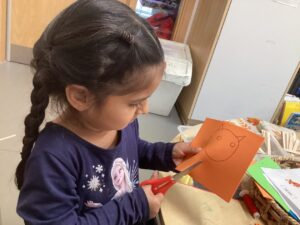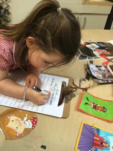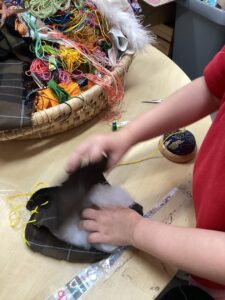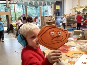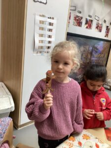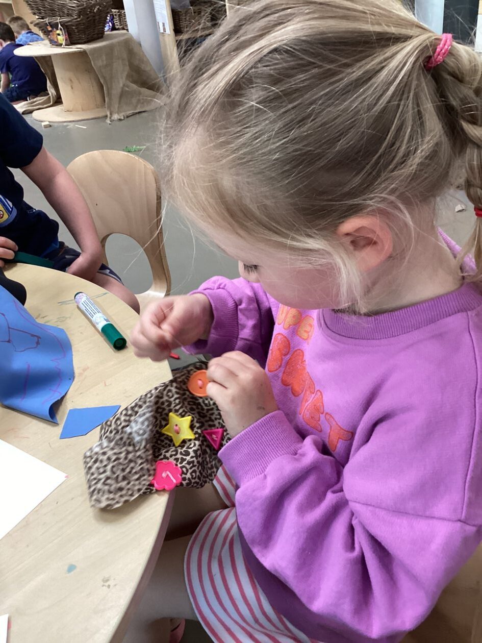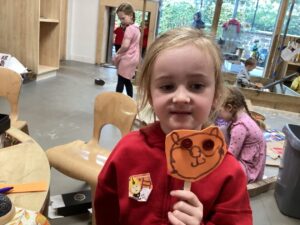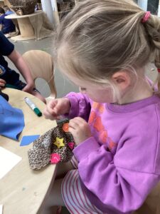 This week in the sewing area we have been busy making our very own puppets based on characters from ‘The Gingerbread Man’ story. The children drew their characters on foam and then cut them out themselves, before sewing things on to them. They used buttons for eyes, wool for hair and used the thread to make a smiley mouth. Some children took these home and others kept them to use in our puppet show which one of the children suggested we have.