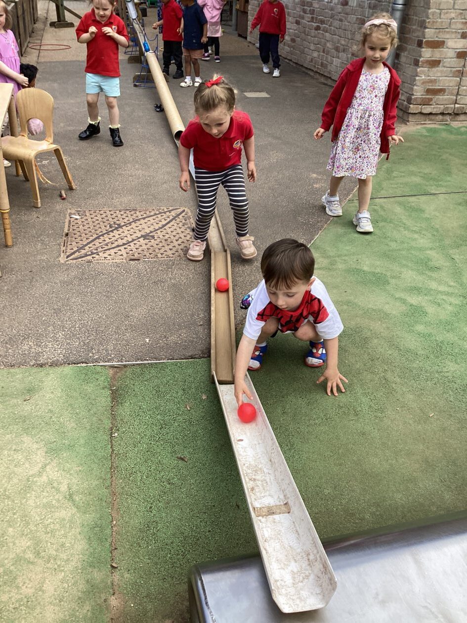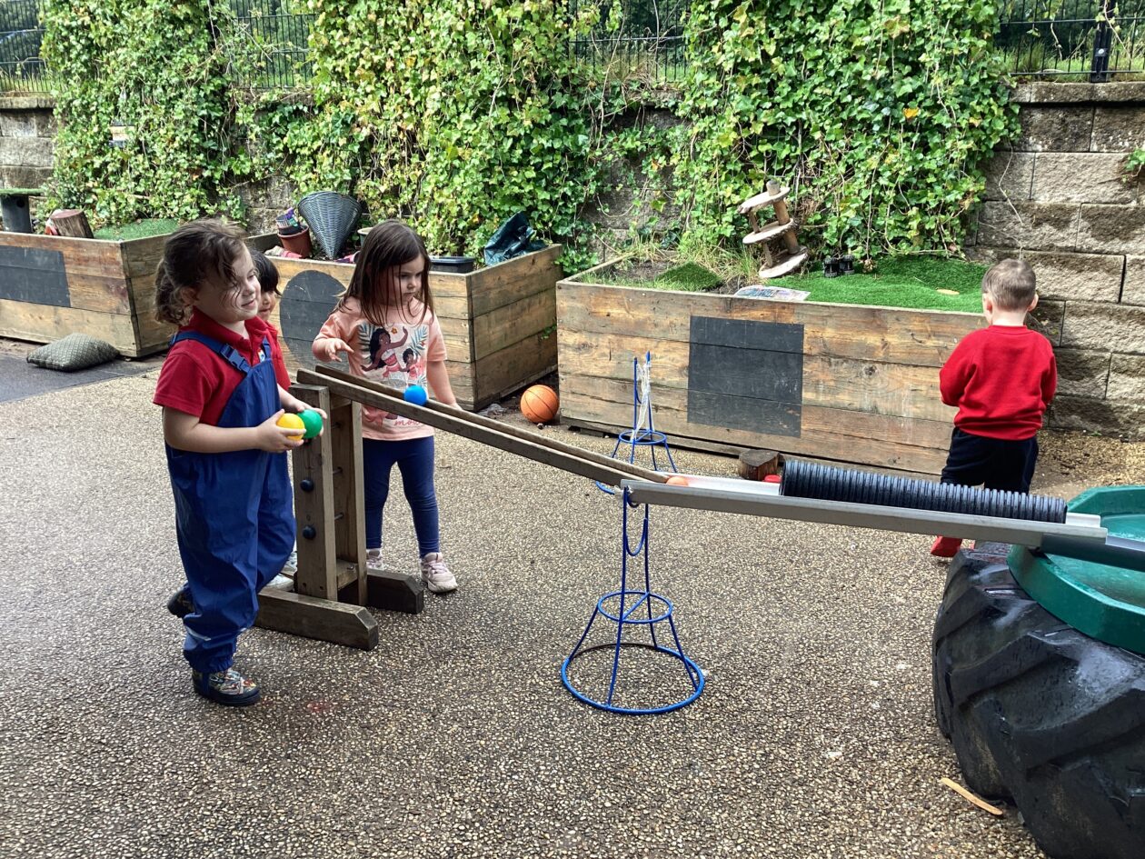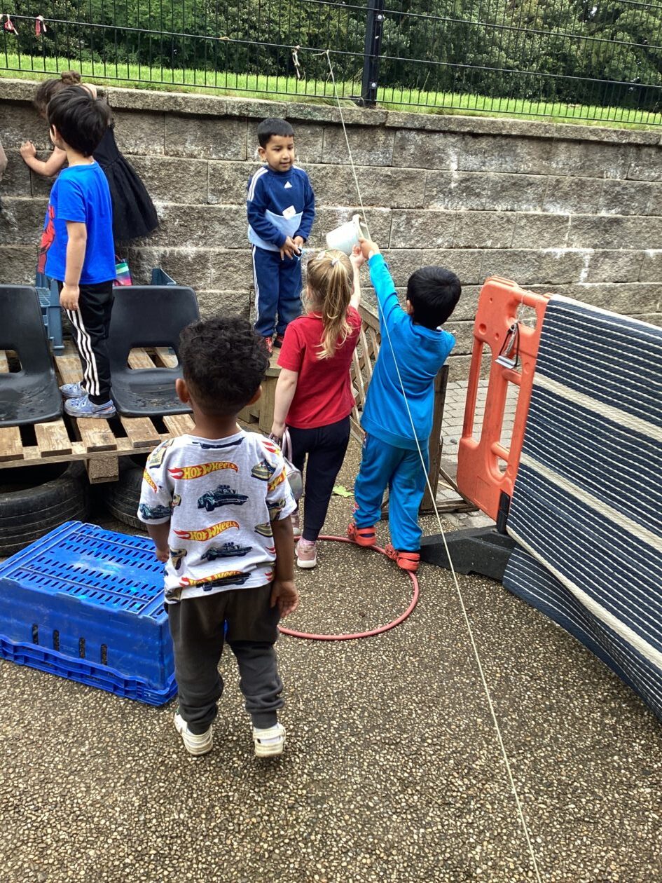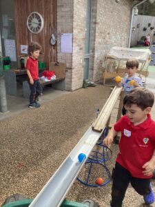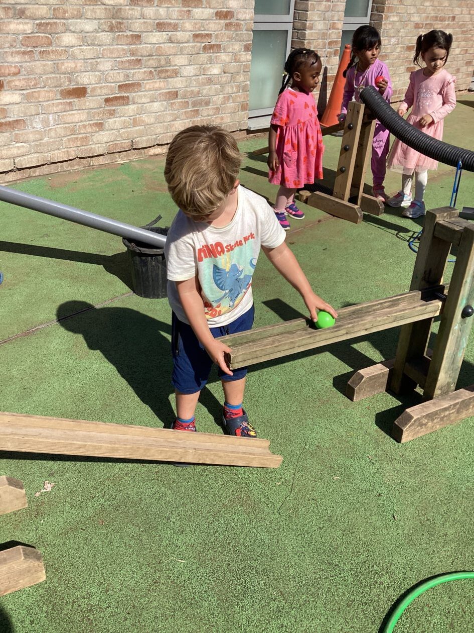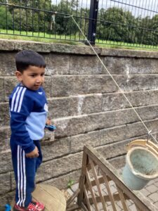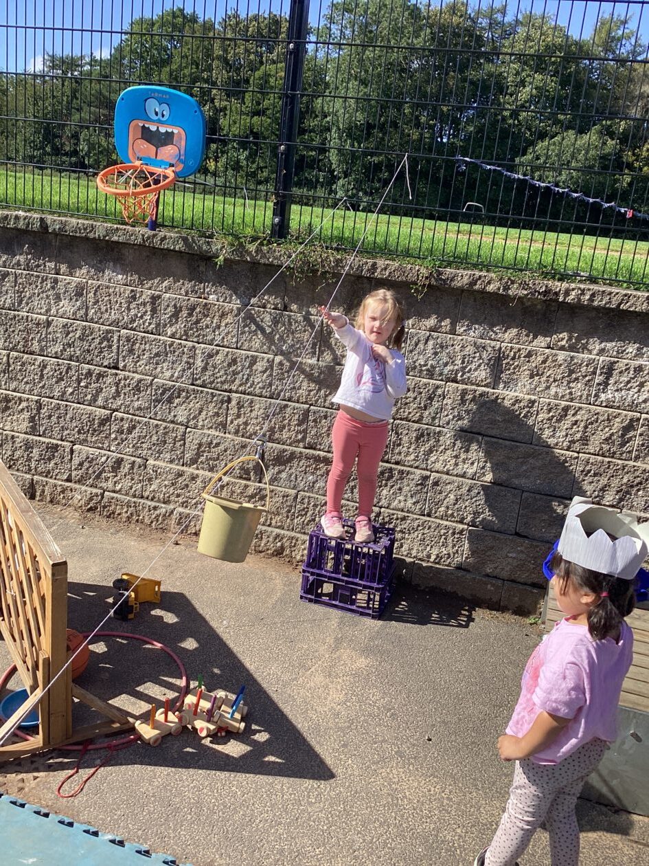Outdoors the children have been continuing their interest in exploring forces. Last week we used balls and created ramps and tunnels to observe speed and direction. This week we created a zip line to further investigate motion and direction, observing how gravity works to pull objects down. We were also discussing how the weight of the object changed the speed with the children making predictions as to who would be the fastest.