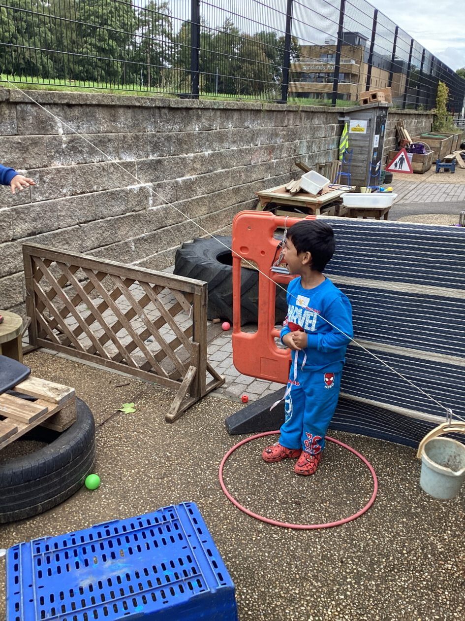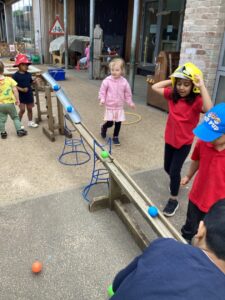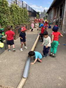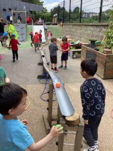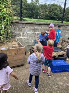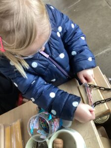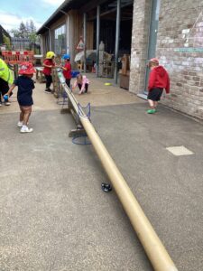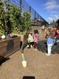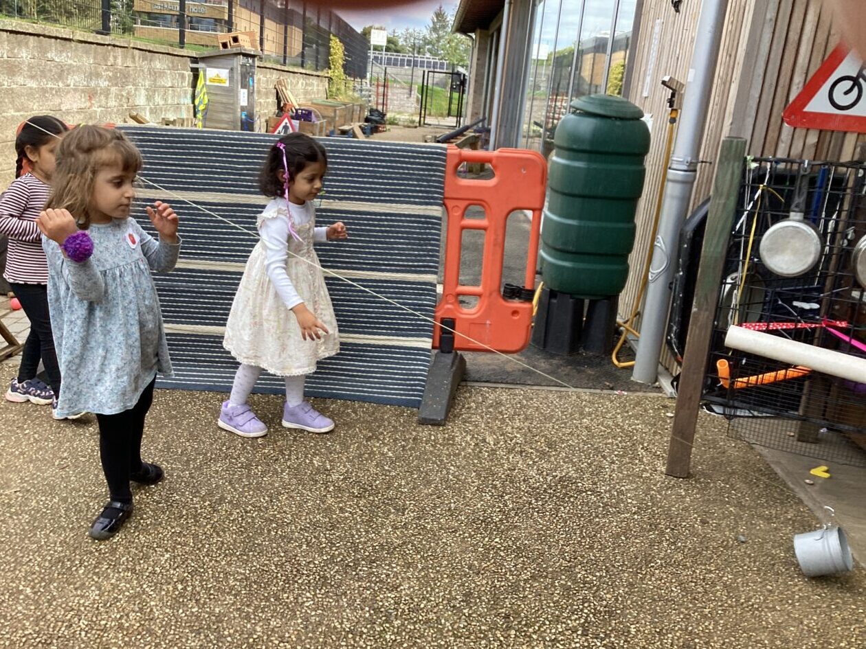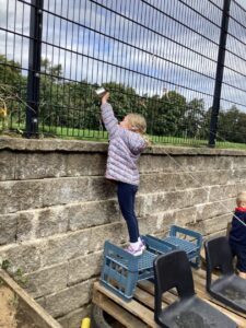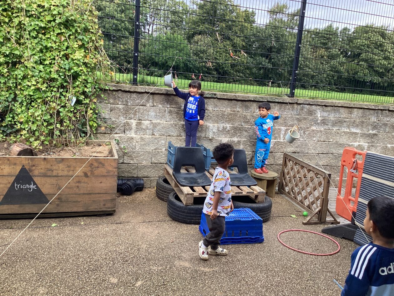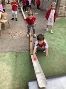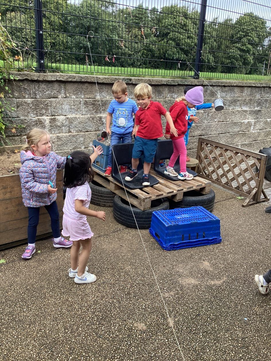 Outdoors the children have been continuing their interest in exploring forces. Last week we used balls and created ramps and tunnels to observe speed and direction. This week we created a zip line to further investigate motion and direction, observing how gravity works to pull objects down. We were also discussing how the weight of the object changed the speed with the children making predictions as to who would be the fastest.