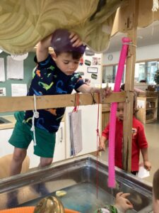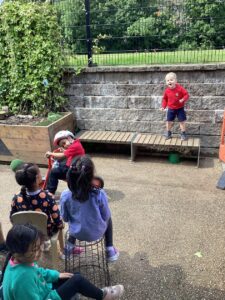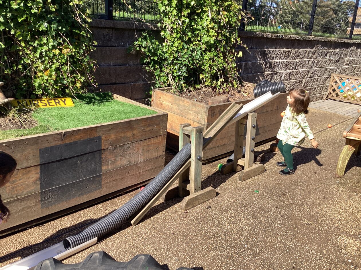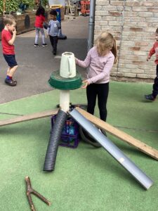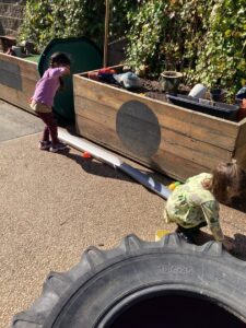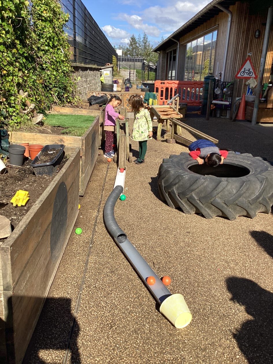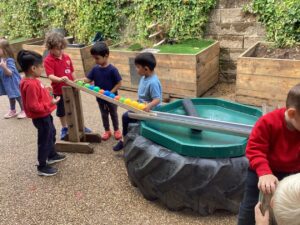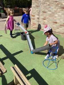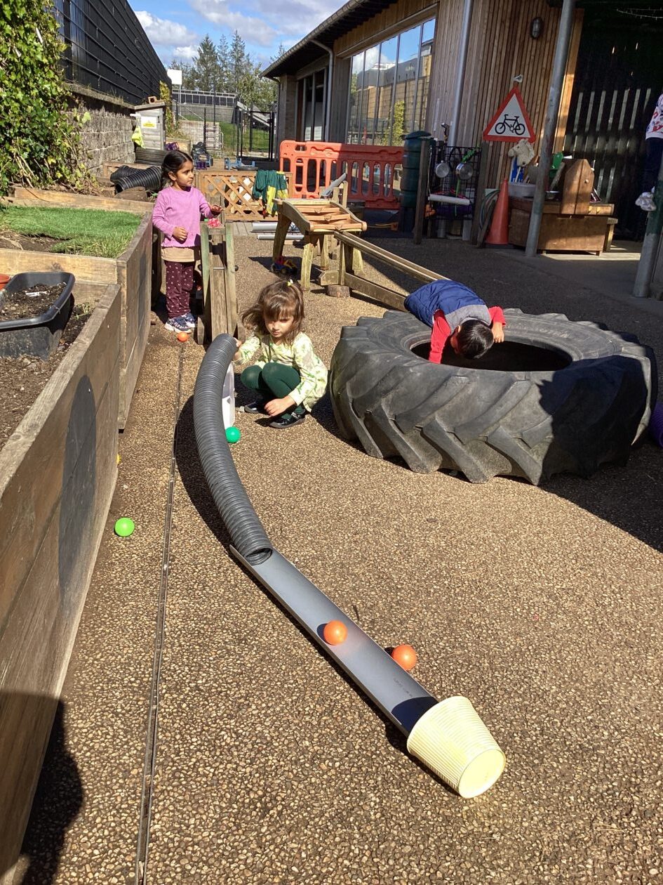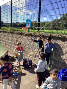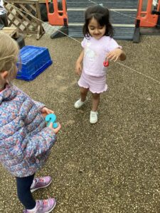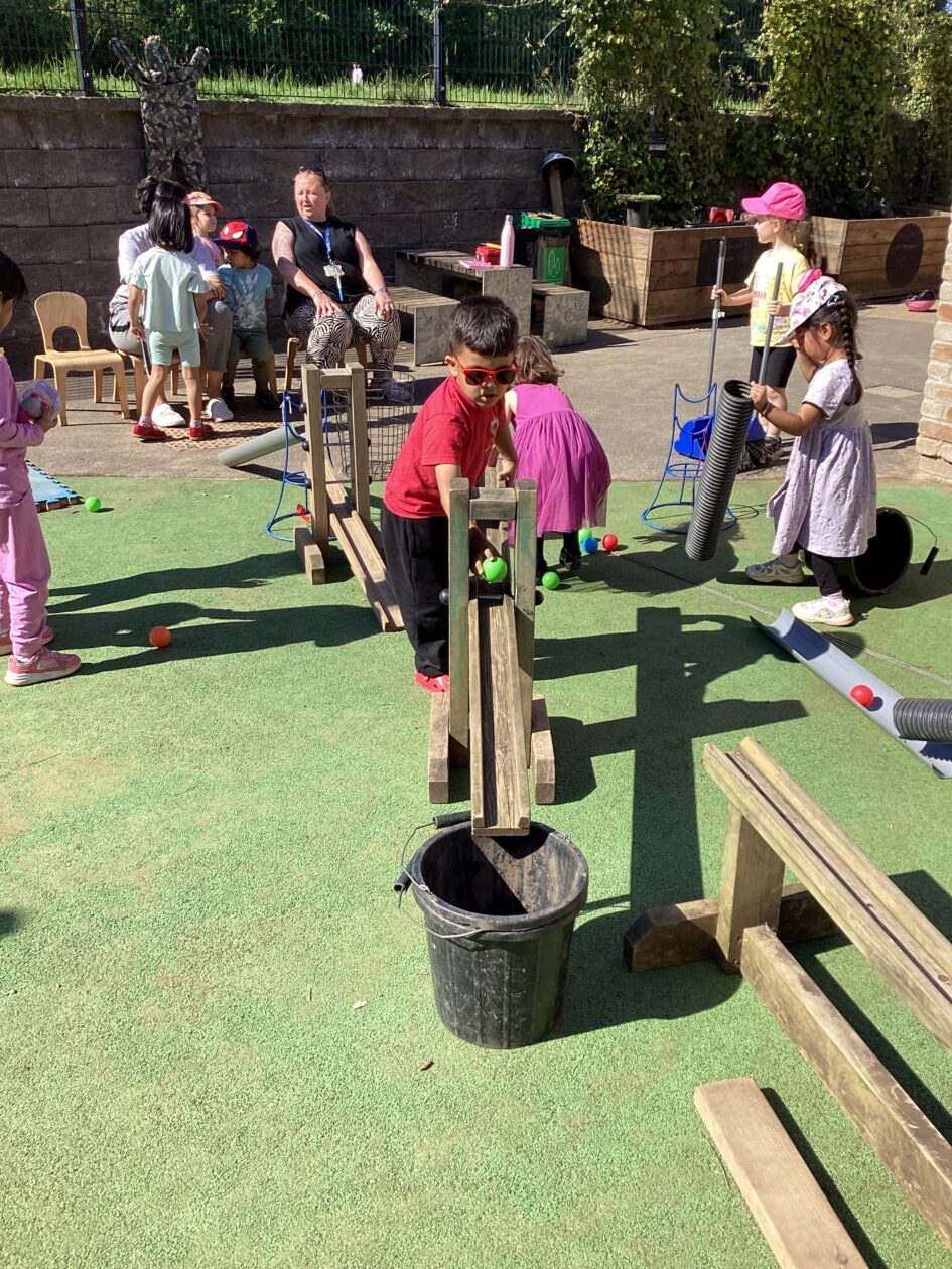 Outdoors the children have been continuing their interest in exploring forces. Last week we used balls and created ramps and tunnels to observe speed and direction. This week we created a zip line to further investigate motion and direction, observing how gravity works to pull objects down. We were also discussing how the weight of the object changed the speed with the children making predictions as to who would be the fastest.
