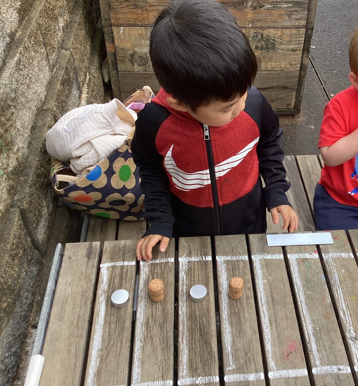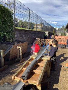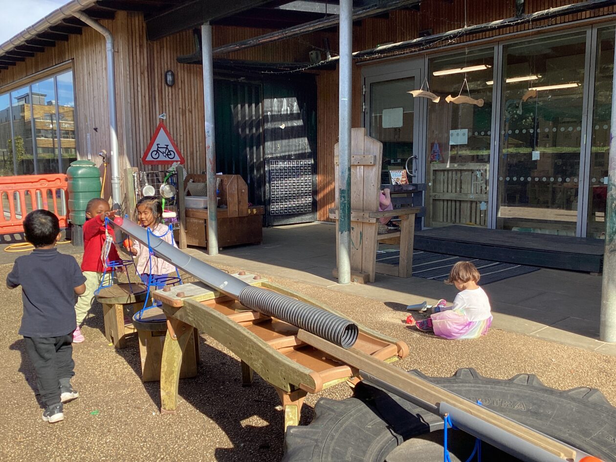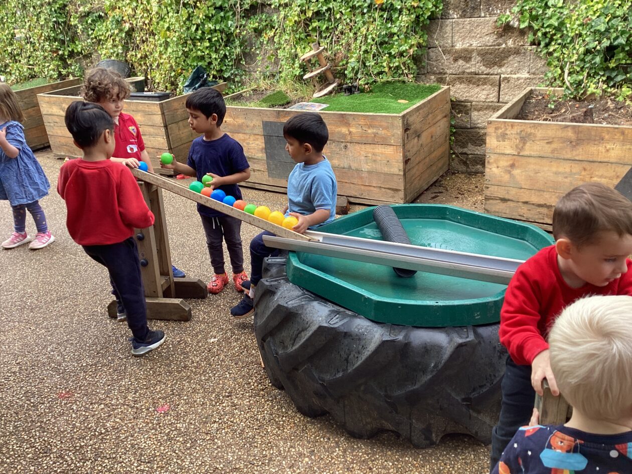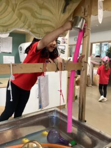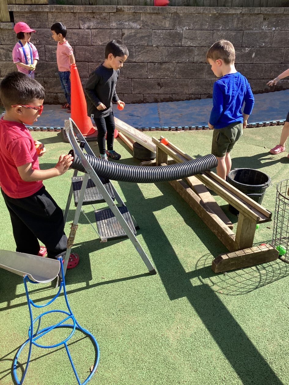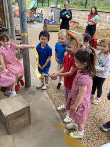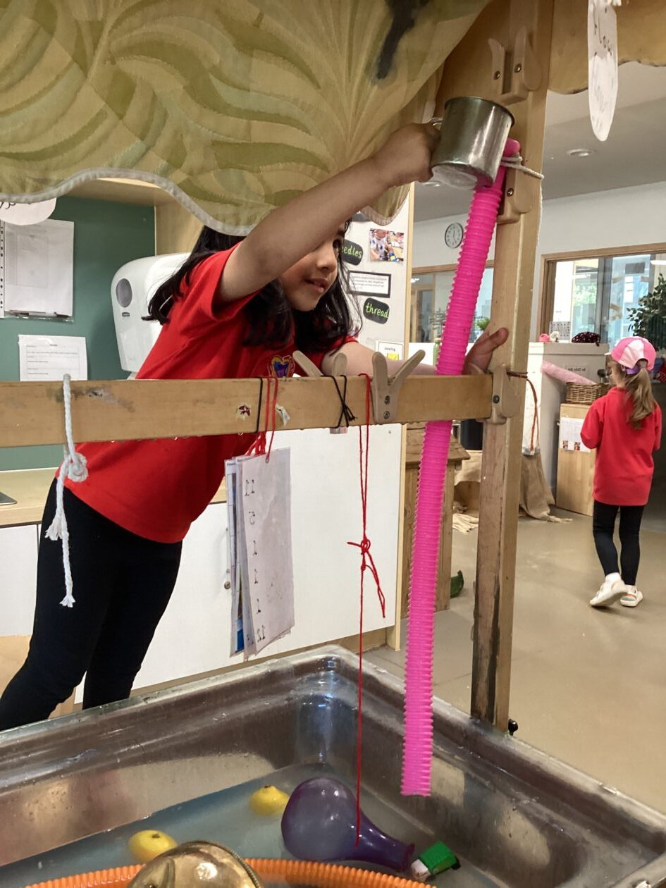 Outdoors the children have been continuing their interest in exploring forces. Last week we used balls and created ramps and tunnels to observe speed and direction. This week we created a zip line to further investigate motion and direction, observing how gravity works to pull objects down. We were also discussing how the weight of the object changed the speed with the children making predictions as to who would be the fastest.
