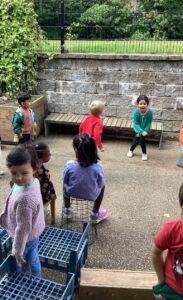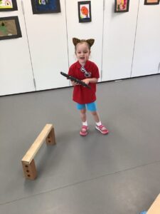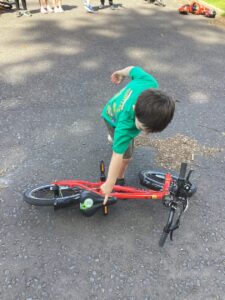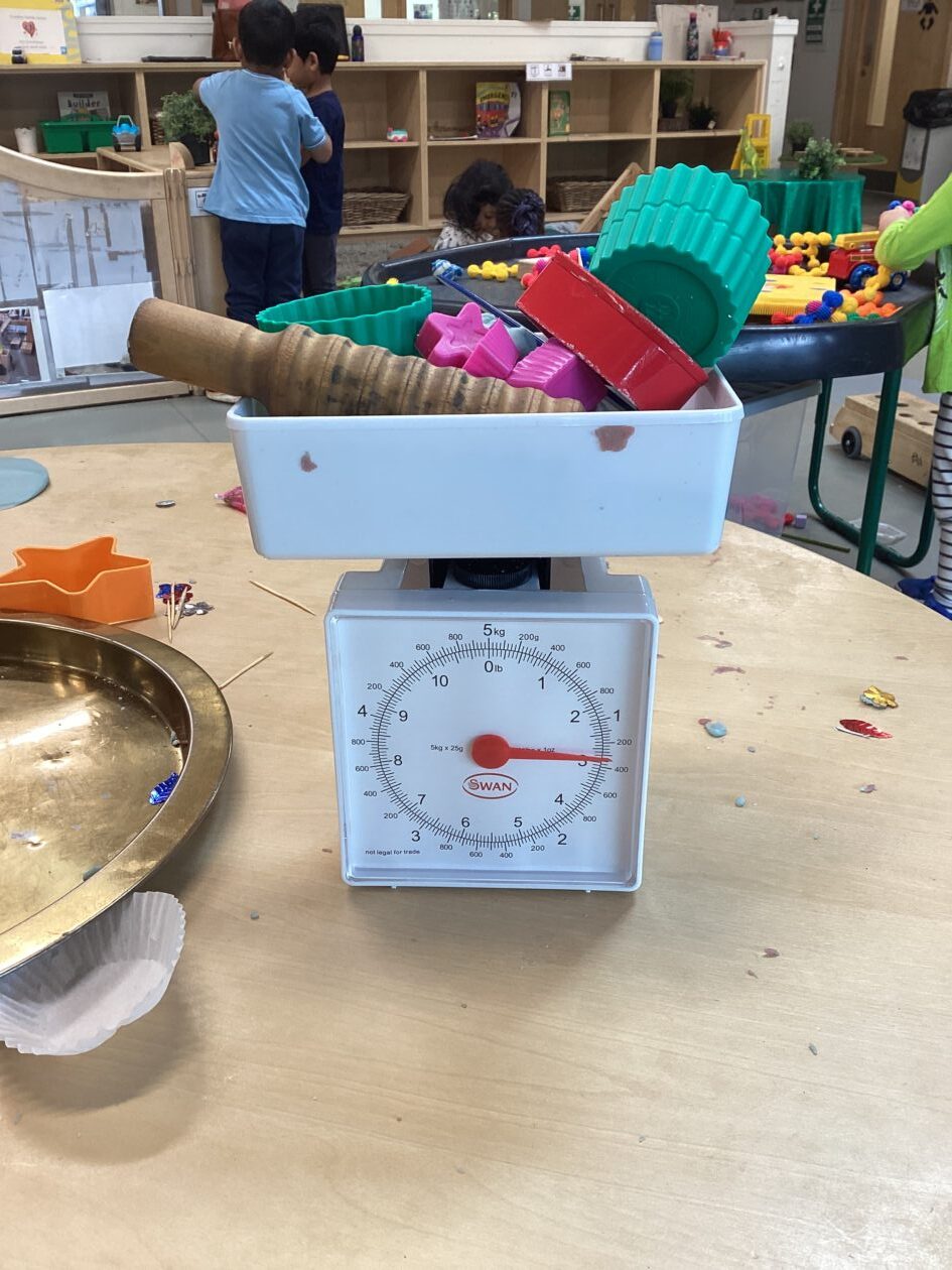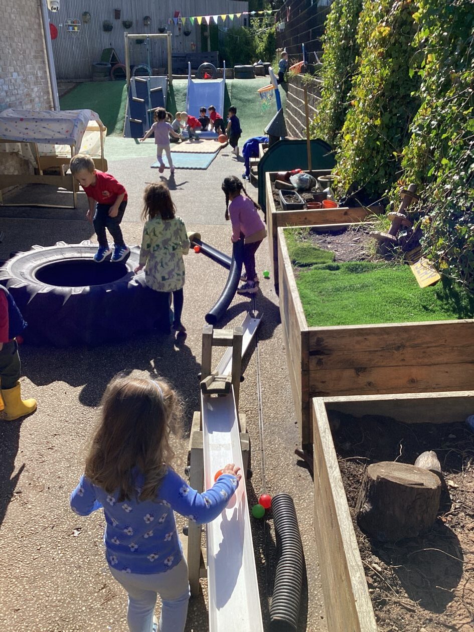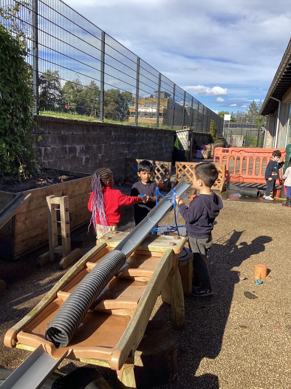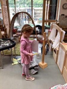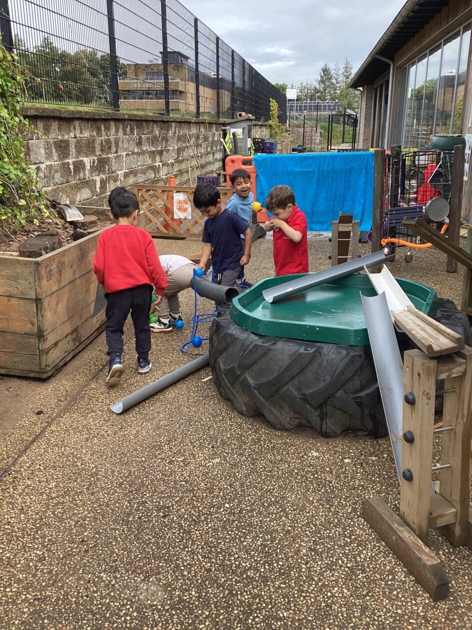 Outdoors the children have been continuing their interest in exploring forces. Last week we used balls and created ramps and tunnels to observe speed and direction. This week we created a zip line to further investigate motion and direction, observing how gravity works to pull objects down. We were also discussing how the weight of the object changed the speed with the children making predictions as to who would be the fastest.