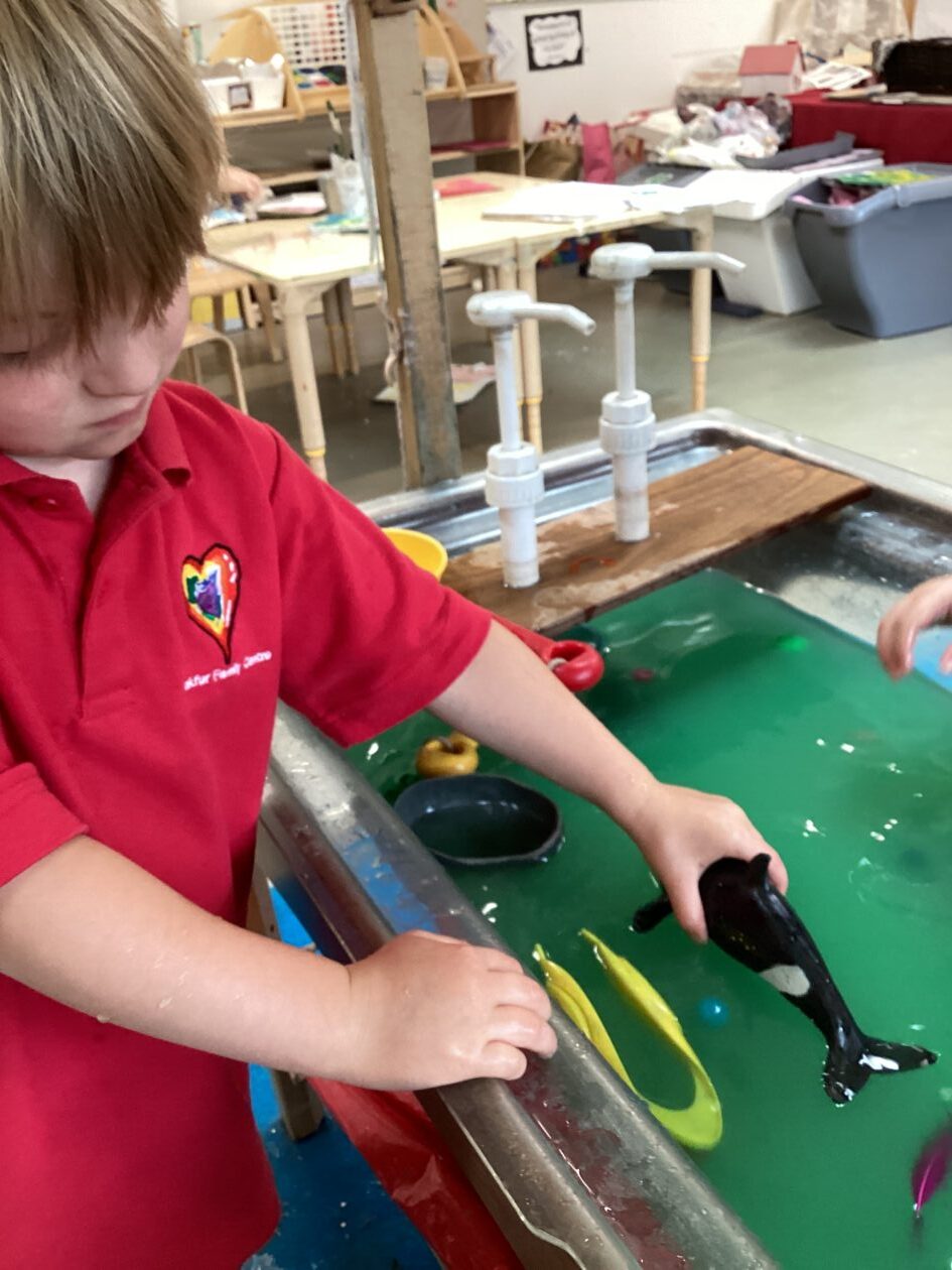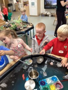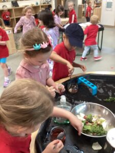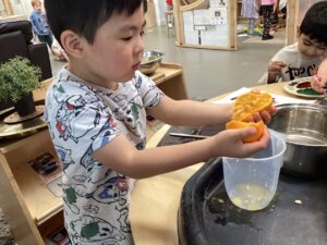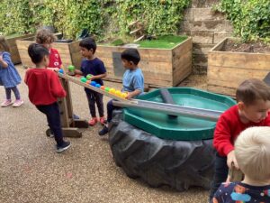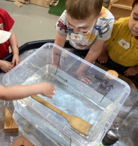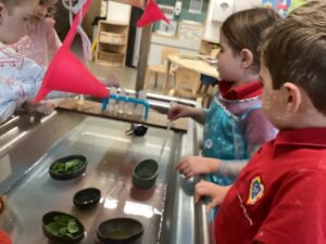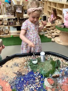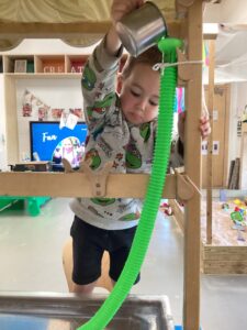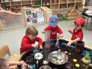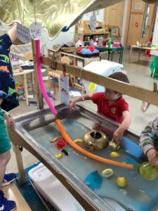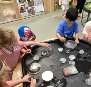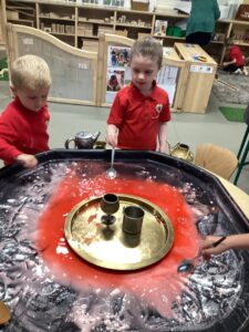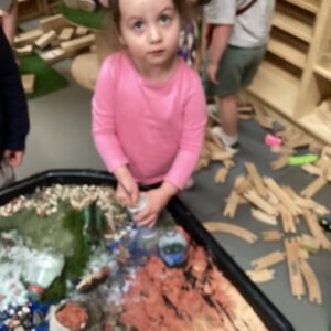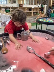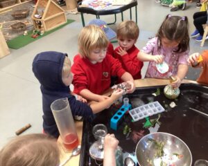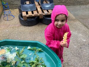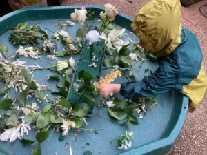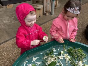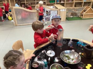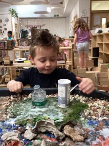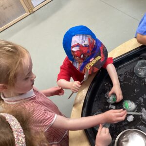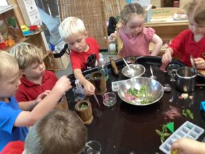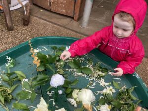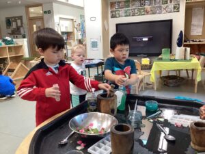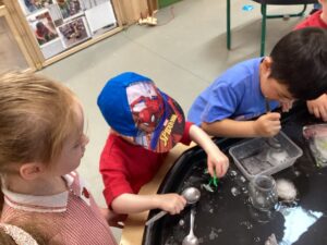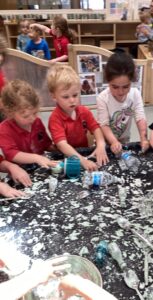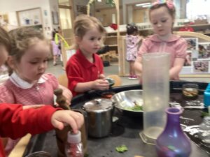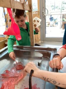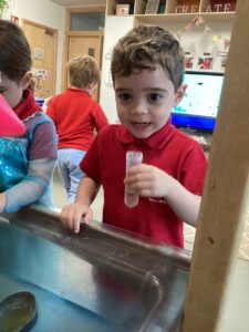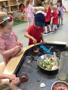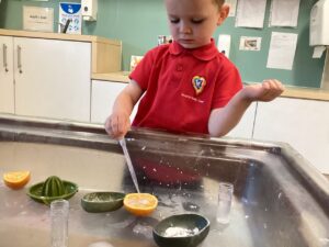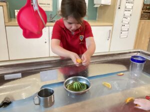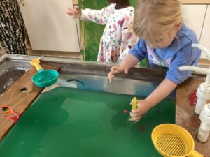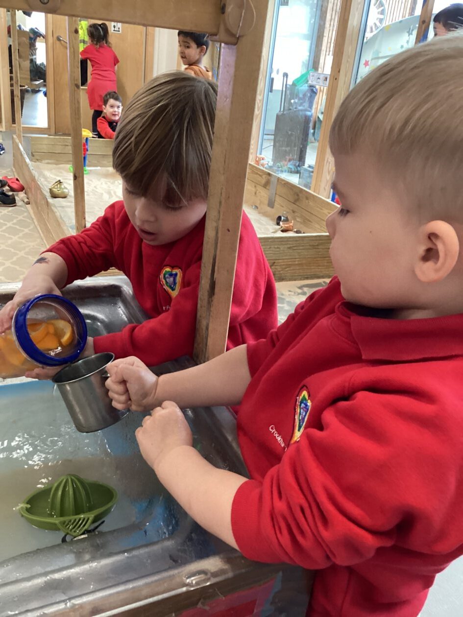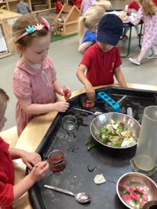 In the water we have been exploring the senses of smell, sound and sight. We have been adding various food elements and the children have been using descriptive language to describe what the smell, see and hear. We have made fizzy oranges, orange and nectarine water and, mint and cucumber water, made perfumes from different herbs and essences.